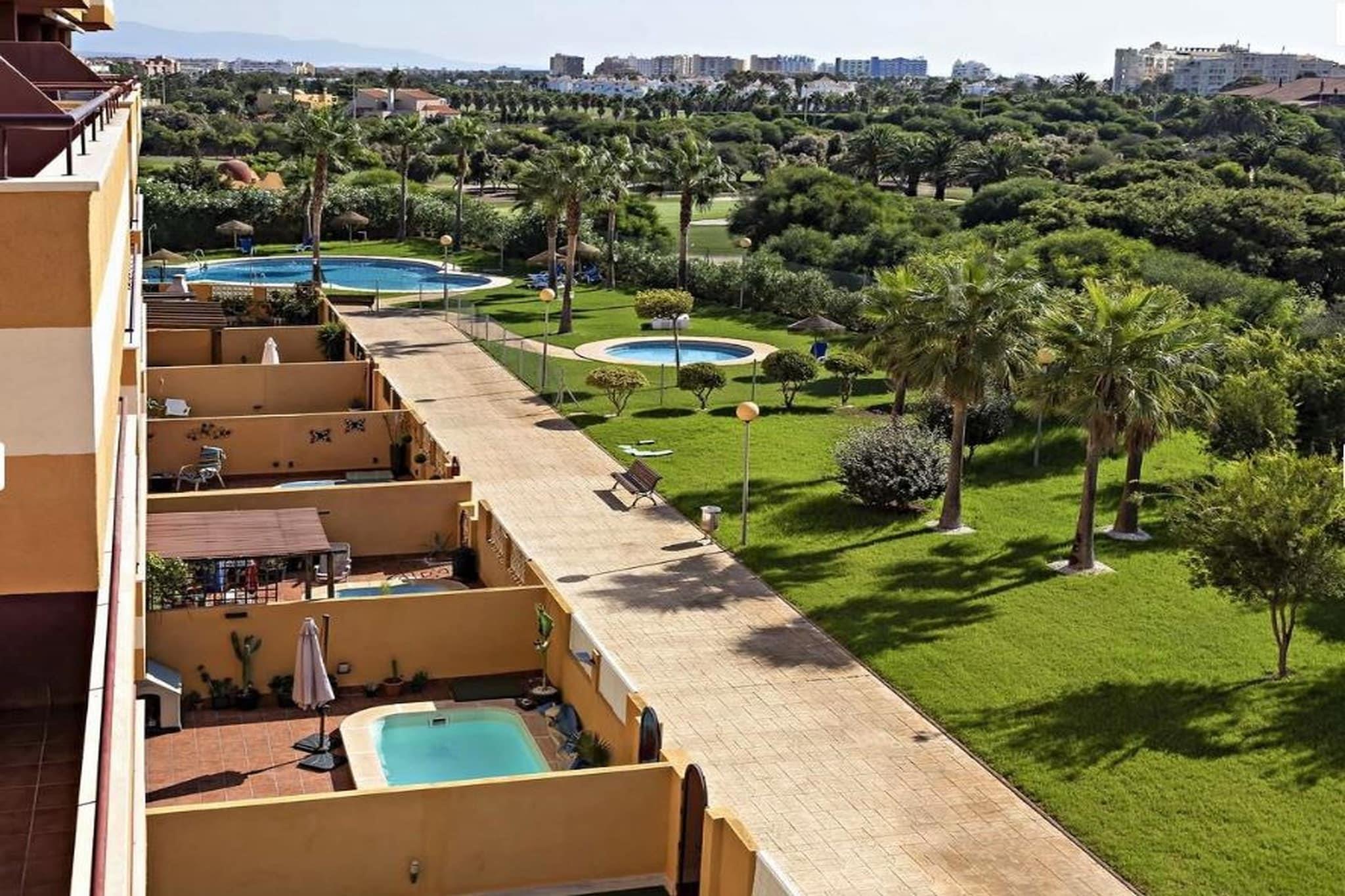 Denne smukke lejlighed er beliggende på første sal i Residencial Pelícanos Golf and Beach. Den har en vidunderlig udsigt over golfbanen, og den er derfor ideel for golfentusiaster. De smukkeste strande i Roquetas de Mar og Campo de Golf Playa Serena ligger i kort afstand. Et besøg på nærliggende steder såsom Roquetas de Mar, Cortijos de Marín og La Mojonera er også muligt. Med en hyggelig terrasse og en fantastisk udsigt over golfbanen, samt fælles haver og en fælles swimmingpool, tilbyder denne lejlighed alle ingredienser til en uforglemmelig ferie. Det har også komfortable soveværelser, et badekar og et fuldt udstyret køkken.