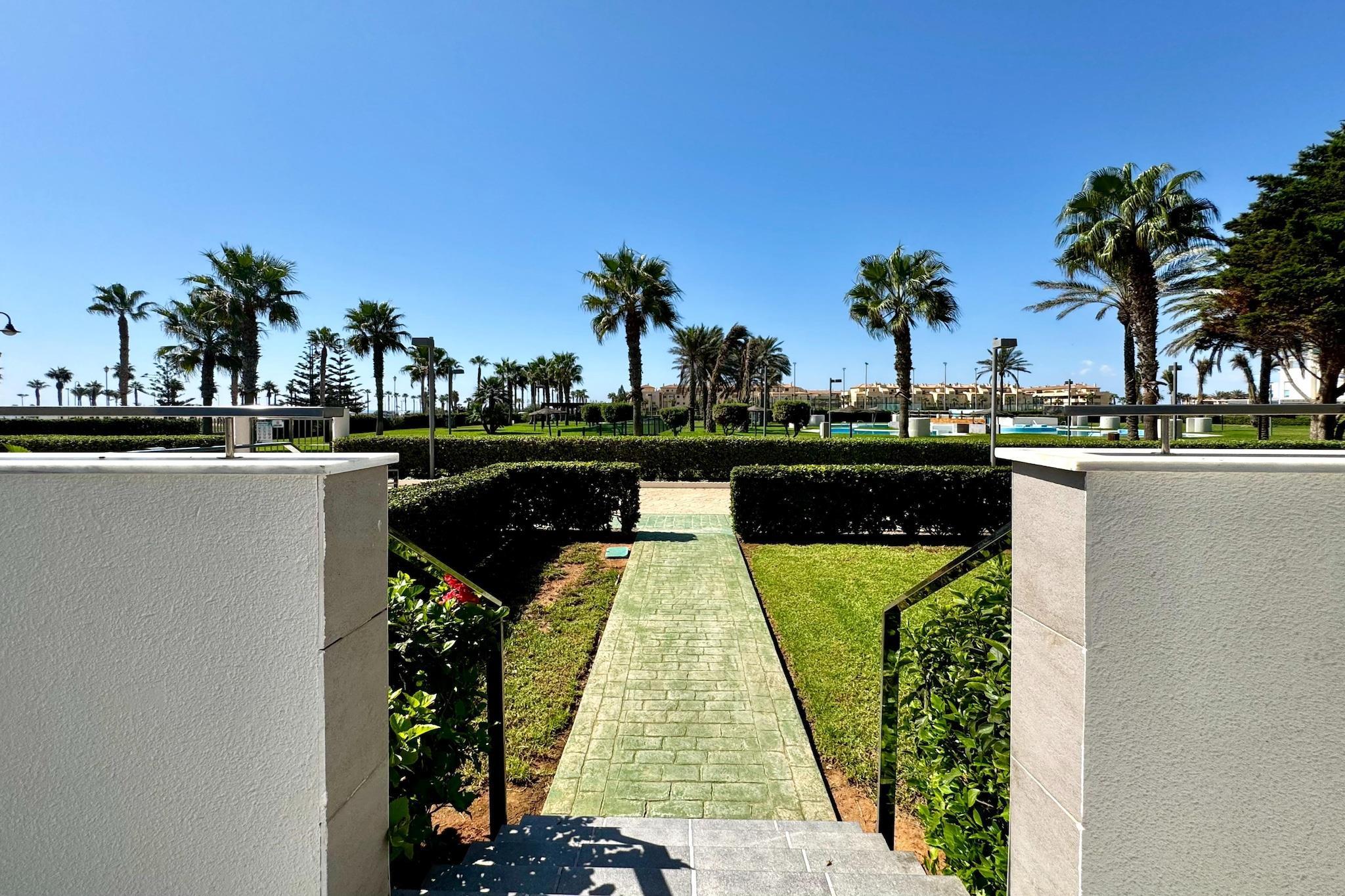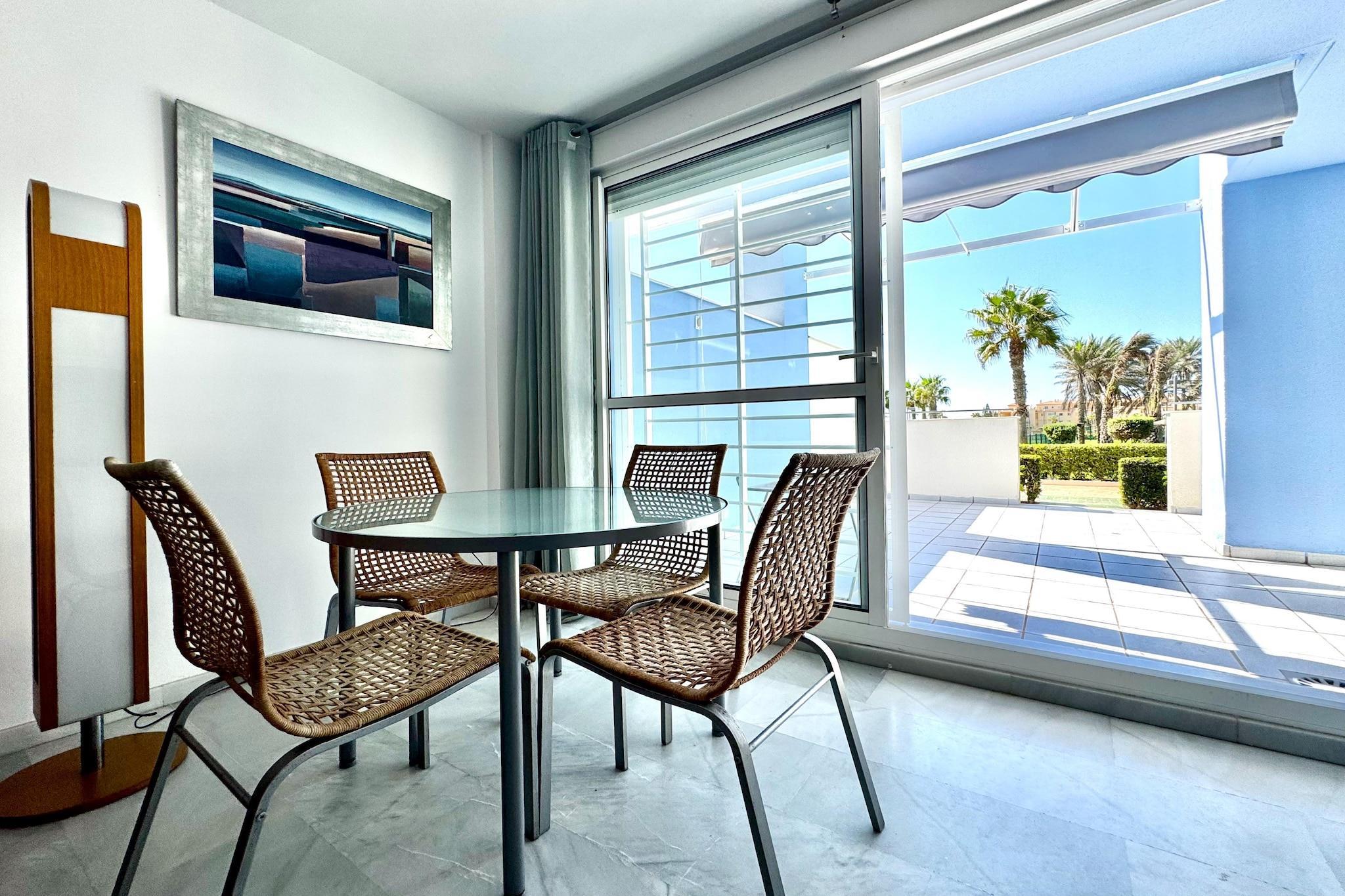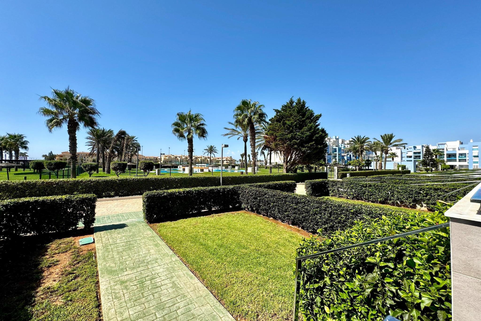 Nyd en afslappende ferie ved kysten i denne stilfulde lejlighed beliggende i hjertet af Poblado Golf Center, kun en kort gåtur fra den smukke Playa Serena. Omgivet af anlagte haver tilbyder dette charmerende tilflugtssted adgang til en fælles swimmingpool, en legeplads og åbne grønne områder, der er perfekte til både familier og par. Lejligheden er smagfuldt indrettet i moderne stil og er fuldt udstyret til både feriegæster og fjernarbejdere. Du finder højhastigheds-Wi-Fi, internationalt tv og et komfortabelt indendørs opholdsområde designet til både afslapning og produktivitet. Træd ud på den private terrasse, der er ideel til solrige morgenmader, videoopkald eller en aftendrink med fredfyldt udsigt over haven og poolen. Med en frisk kystbrise, der driver igennem, vil du måske aldrig forlade stedet. Inden for gåafstand kan du udforske det bløde sand ved Playa Serena og dens rolige promenade, eller spille tee på den nærliggende Playa Serena Golfklub, der ligger kun få minutter væk. Området byder også på en række restauranter, strandbarer og cykelstier, hvilket gør det nemt at udforske kystlinjen i dit eget tempo. For naturelskere er naturparken Punta Entinas-Sabinar kun en kort køretur væk, et paradis for fuglekiggeri, vandreture og uspolerede strande. Uanset om du søger sol, sport eller ro, tilbyder denne velbeliggende lejlighed den ideelle base for en uforglemmelig andalusisk ferie.