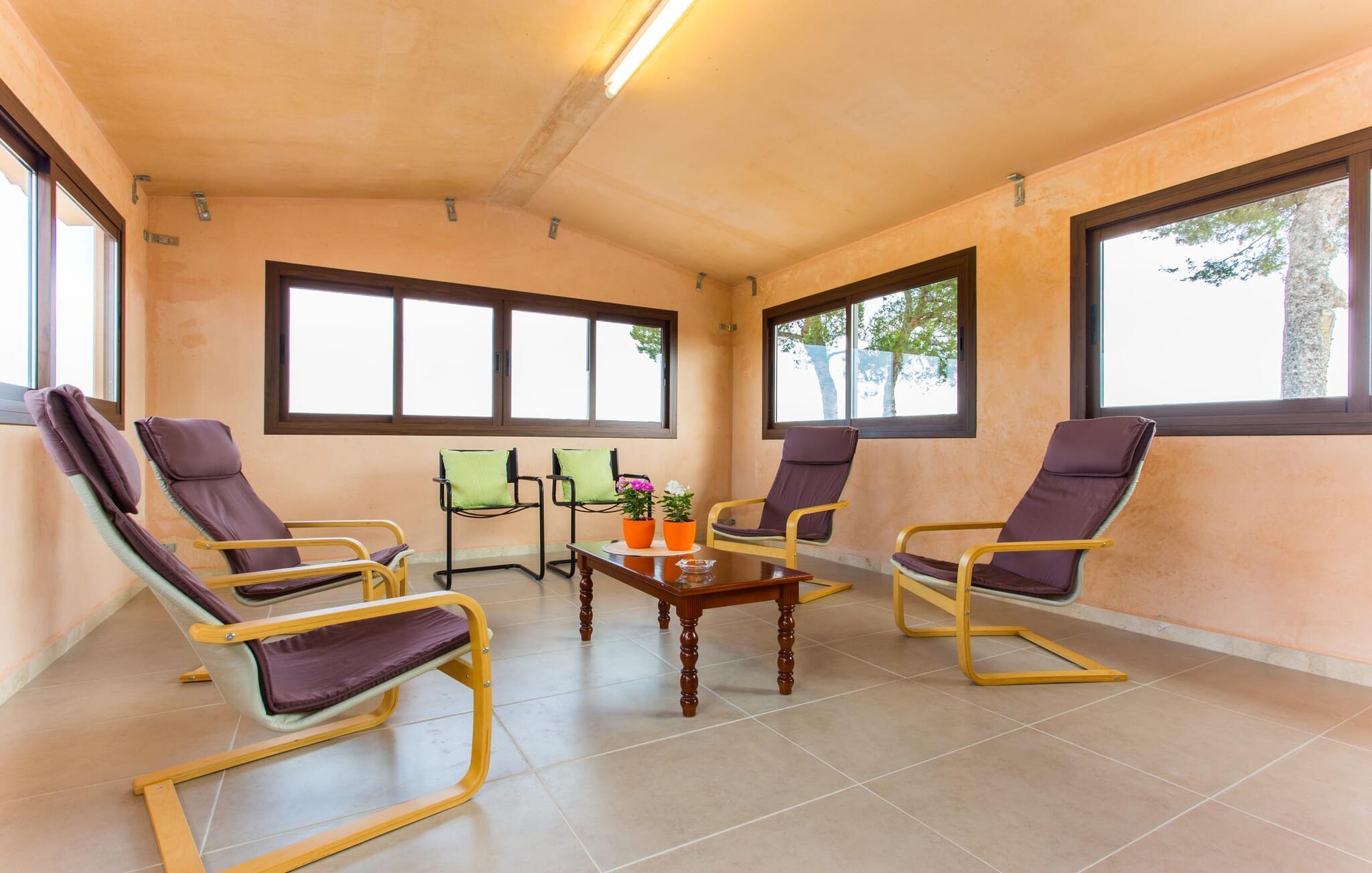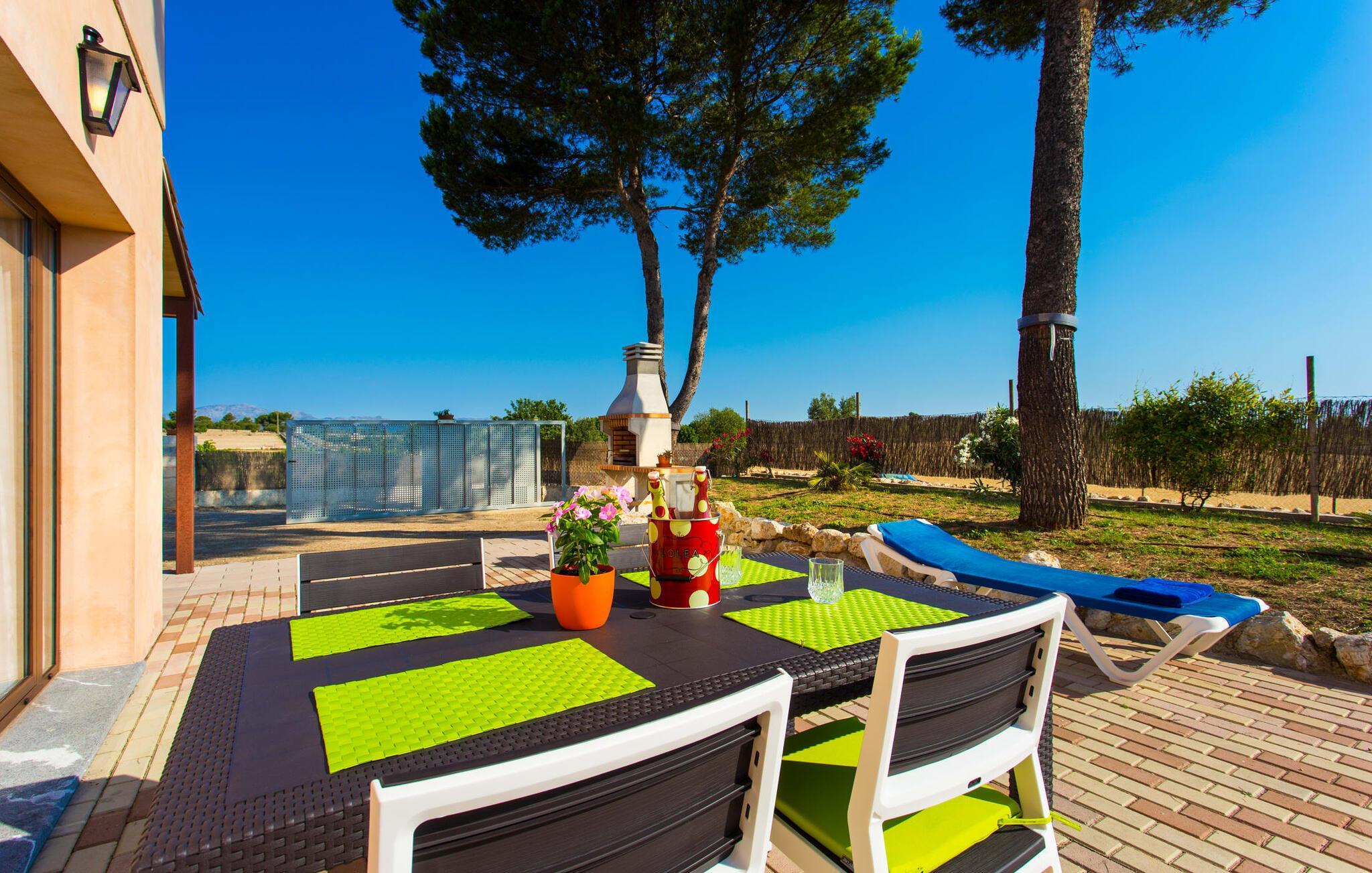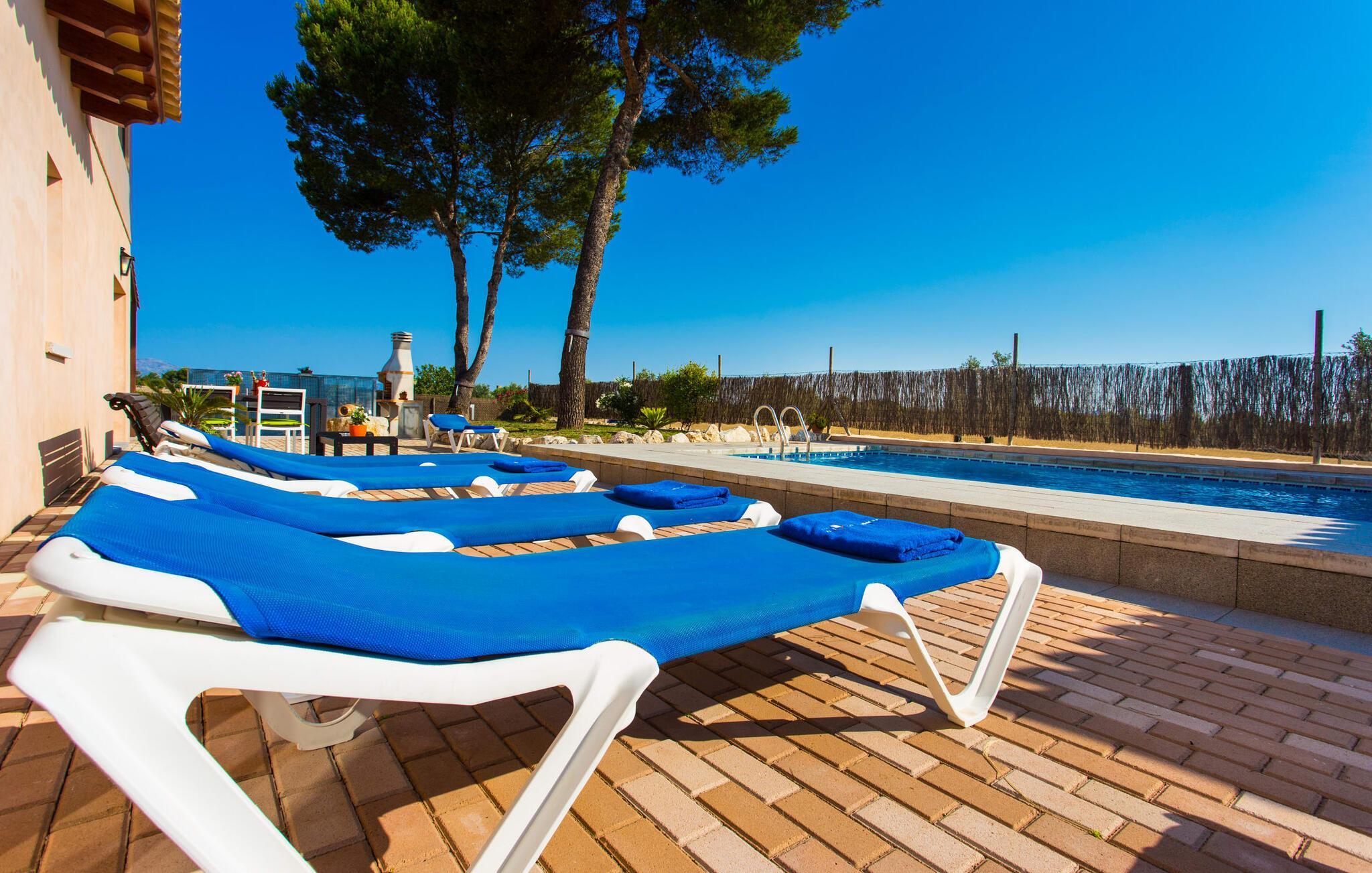 Den traditionelle, sydvendte villa "Saraix" blev fuldstændig restaureret i 2014. Den solbeskinnede villa byder os hjertelig velkommen i en delikat terracotta farve på en ejendom omgivet af fyrretræer. Mellem villaen og poolen er der en solterrasse med i alt 8 liggestole og 1 parasol. Efter svømning kan du nyde den varme sydlige sol på liggestolene eller se dine børn lege i poolen. En træbænk og et polyrattanbord med komfortable stole og æblegrønne hynder giver mulighed for at tilbringe sociale stunder. Under en overdækket terrasse på siden af huset er der endnu en udendørs siddeplads med træmøbler og de samme spændende grønne hynder, samt endnu en træbænk i skyggen. Sætter du begge ensembler sammen, kan du nyde en underholdende grillaften, da hver af de to terrasser har en muret grill. En udvendig trappe på siden af huset fører dig til øverste etage. Over tagterrassen er der adgang til en slags tårnværelse, der er indrettet som en ekstra opholdsstue til afslapning eller som læsesal og byder på en smuk udsigt over den landlige struktur i det omkringliggende område og grunden. Et særligt højdepunkt for os er villaen "Saraix". Ejendommen, der hører til villaen, er faktisk meget mere rummelig, så du kan tage lange ture rundt i ejendommen. Får, grise og høns holdes stadig i en vis afstand fra huset, men de kan selvfølgelig ikke nå Villa “Saraix”. Du kan nyde freden og rummet i den landlige beliggenhed. Dette er et Fincallorca feriehus. Med undtagelse af tårnrummet ligger alle andre rum i villaen i stueetagen, som er tilgængelig via flere gulv-til-loft terrassedøre. Dette gælder også delvist for soveværelser, hvor man kan få adgang til haven direkte om morgenen. Villaens indretning er meget ny og har en tidløs smag. Hvide, glatte vægge med store gulvfliser i lys jordfarve suppleres af lyspunkter indlejret i lofterne og sikrer en moderne standard. Det fritlagte bjælkeloft og de antikke træstole giver lidt mallorcansk hygge i stuen, som er indrettet med en orange og en chokoladebrun sofa. Perfekt til en hyggelig aften med fjernsyn eller en social aften. Det separate køkken er meget stilfuldt udstyret. Et langt tekøkken med ønskværdig teknisk komfort og fuldt udstyr, som du ikke vil undvære, når du er på ferie, imponerer med træfronter, der suppleres af marmor af høj kvalitet. Her er også monteret loftspots; Spisebordet kan trækkes ud og giver alle gæster plads nok til fælles måltider. De 4 soveværelser har enten dobbeltsenge eller separate enkeltsenge; Brugen eller distributionen kan ændres af gæsterne efter behov. Der er plads nok til dit ferietøj i de indbyggede skabe. De to højkvalitetsbadeværelser med brusekabine er yderst moderne. Bruserne er designet med sten af høj kvalitet. De indmurede bruseområders mørke marmor danner en elegant kontrast til den lyse, højglans natursten, der blev lagt på de øvrige vægge. Uanset om du rejser med venner eller med to familier - villaen byder på plads nok til alle gæster til en yderst moderat pris i en vidunderlig landlig beliggenhed og alligevel tæt på stranden og byen. Placeringen af den ukomplicerede villa "Saraix" er et overbevisende argument for os. Det tager cirka 7 minutter at komme til den smukke kystby Can Picafort, mens der kun er cirka 4 km til Santa Margalida. Den attraktive villa ligger cirka 450 m fra vejen, der forbinder begge populære byer. Begge byer er nemme at nå for shopping. Der er et fantastisk ugentligt marked i Santa Margalida om tirsdagen og lørdagen, og om fredagen kan du køre til Can Picafort-markedet. Can Picafort er en del af Bahiá de Alcúdia, som forbinder kilometervis af meget smukke sandstrande som en perlehalskæde. I Can Picafort finder du adskillige barer og restauranter samt et pulserende natteliv i de lokale klubber. Du får en helt anden oplevelse i smukke Santa Margalida, en af de smukkeste og mest maleriske landsbyer på øen, hvor du stadig kan opleve det originale Mallorca. På grund af den bekvemme beliggenhed har du valget mellem mange forskellige ting på ferien og på Villa “Saraix” kan du forvente begivenhedsrige dagsture, hvor du kan runde en afslappende dag af med en afslappende grill. Vi hos Fincallorca ønsker dig en varieret, afslappende og behagelig ferie. Villaen “Saraix” blev restaureret i 2014 og er beliggende i landlige omgivelser mellem byerne Santa Margalida og Can Picafort. Santa Margalida ligger kun 4 km væk, og Can Picafort ligger også kun 7 km væk. Her kan du gøre dine indkøb og gå til markederne på forskellige dage i ugen, hvor du kan finde frisk frugt og grøntsager. Strandene i Alcúdia-bugten, som alle er opstillet som en perlerække, ligger kun få minutter væk i bil.