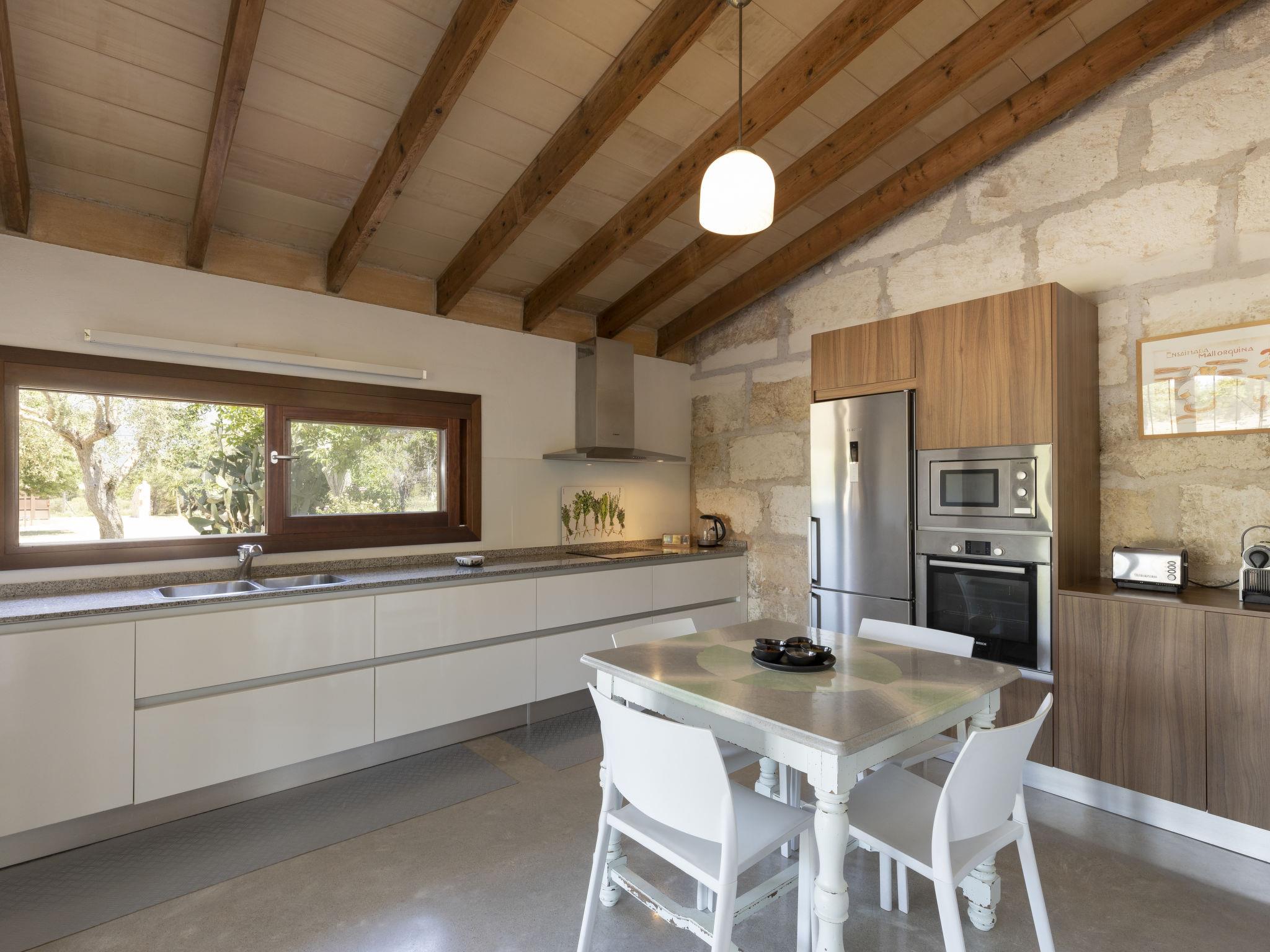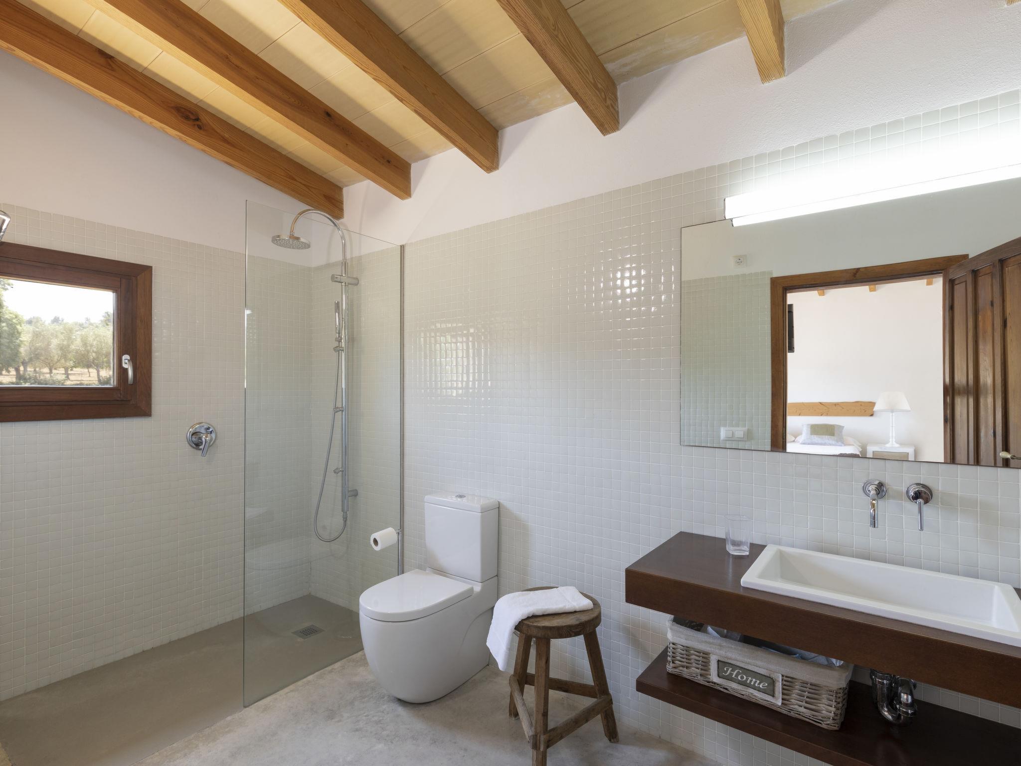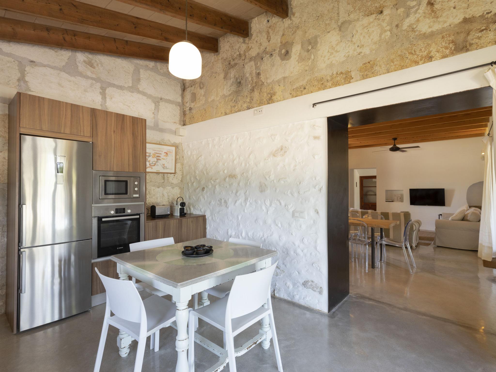 "Cas Ciutada", 5-room villa 200 m2 on 2 levels. Object suitable for 8 adults. Spacious and bright, fully renovated, comfortable and modern furnishings: living/dining room with Scandinavian wood stove (only for decoration), dining table, digital TV, flat screen, air conditioning and forced-air heating. Exit to the patio. 1 double bedroom with 1 bed (90 cm, length 190 cm), 1 pull-out bed (2 x 90 cm, length 190 cm), fan. Exit to the terrace. 1 large double bedroom with 1 french bed (150 cm, length 200 cm), shower/WC, air conditioning and forced-air heating. Exit to the terrace. Kitchen (oven, dishwasher, 4 ceramic glass hob hotplates, toaster, kettle, microwave, freezer, electric coffee machine) with dining table. Exit to the terrace. Shower/WC. Upper floor: 1 double bedroom with 2 beds (90 cm, length 200 cm), air conditioning and forced-air heating. 1 double bedroom with 2 beds (90 cm, length 200 cm), air conditioning and forced-air heating. Large patio, lawn, porch. Terrace furniture, barbecue, deck chairs (8), covered balcony. Very beautiful view of the mountains and the countryside. Facilities: washing machine, iron, children's high chair, baby cot for up to 2 year olds, hair dryer. Internet (WiFi, free). Parking (fenced) at the house. Please note: one double bedroom is outside the apartment. Non-smoking house. Fire extinguisher, no lift. No internal connecting door between the separated properties. The pool mentioned in the description is for private use. Note: the double bedroom which is independent from the main house has doors adapted for wheelchairs (77 cm wide). The sink and toilet are normal standard size. ETV/4941 // Reg. Nr.: ESFCTU00000702200023993100000000000000000000ETV/49412