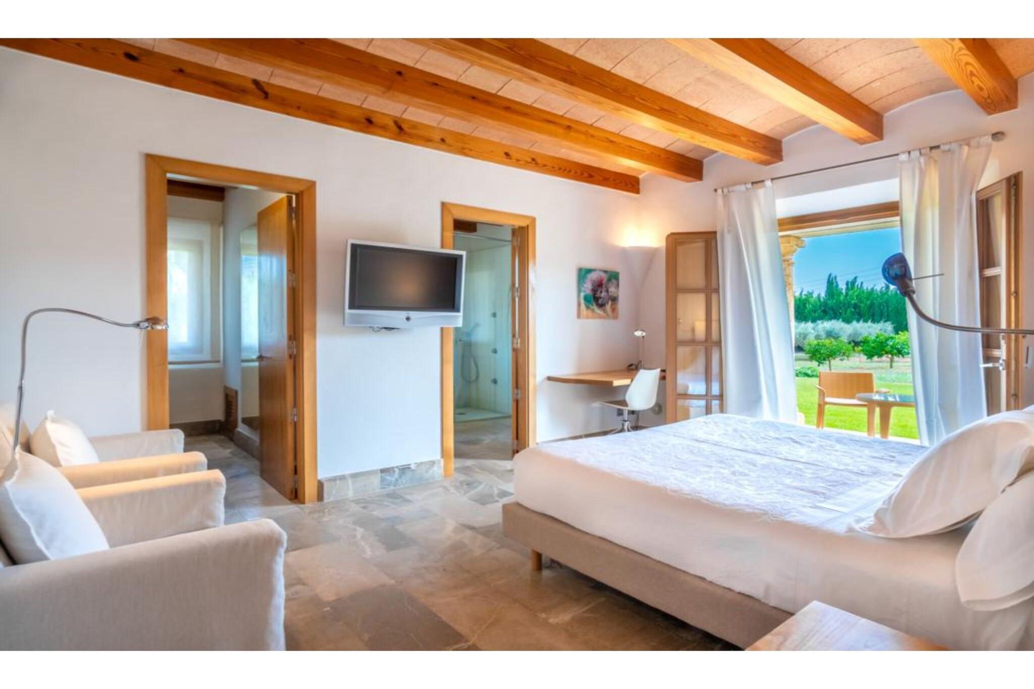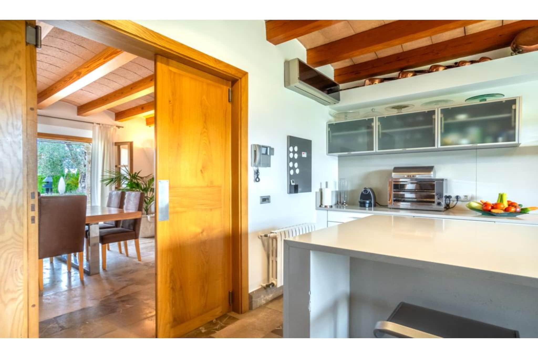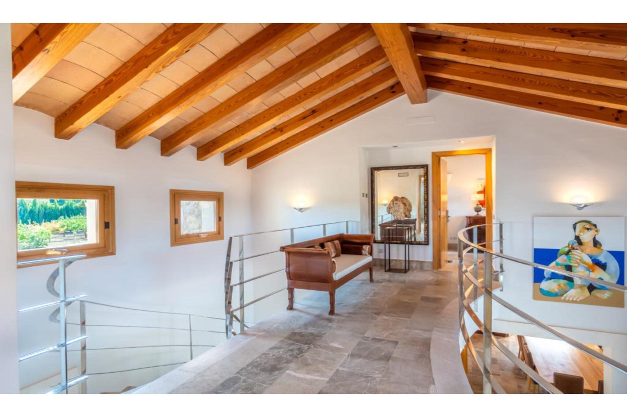 Fremragende ejendom. Huset blev bygget i 2006 med materialer af høj kvalitet: mallorsk sandsten, marmor, tømmer, stål mv. Bygget. Dekoreret med personlig stil og udsøgt smag og med stor kærlighed til åbne rum. Døre og installationer med de seneste udviklinger I teknologi: E-kort starter, baggrundsmusik inde og på terrasserne, Loewe TV i stuen og soveværelser, wifi. Alle 4 værelser er udstyret med badeværelse, påklædningsværelse, tv og udgang til terasse. 50 m2 køkkenet er fuldt udstyret, samt spisestue og stue. Haven har terrasser (1.000 meter), som er ideelle til udendørs arrangementer med plads til 200 personer. Der er et chill out område og parkering til 100 biler. For begivenheder inde i området har huset en maksimal kapacitet på 20/25 personer. Ideel til forretningsmøder, konferencer og små festligheder.