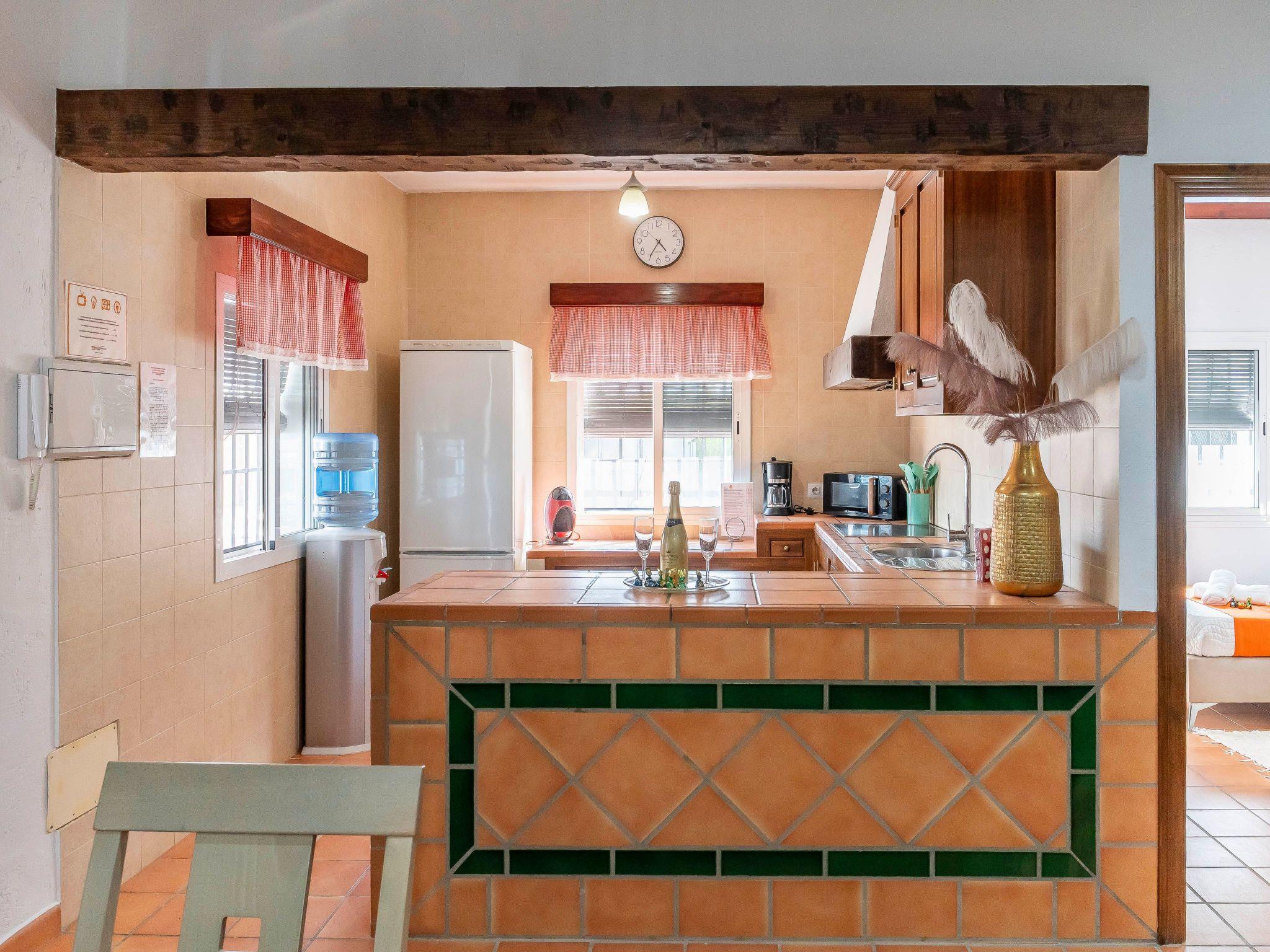 Kitchen open to the living room with ceramic hob, dishwasher, toaster, fridge, coffee maker, microwave....
