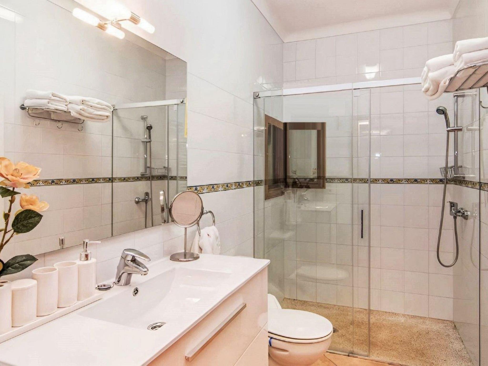 There are a total of 3 bathrooms, 1 with shower on the ground floor, 1 with shower in bath on the first floor, and the third one is located outside in the laundry room under the pool. On the ground floor is the spacious and bright living room with satellite TV and WiFi internet and the kitchen, which is equipped with dishwasher and also has access to the pool terrace.