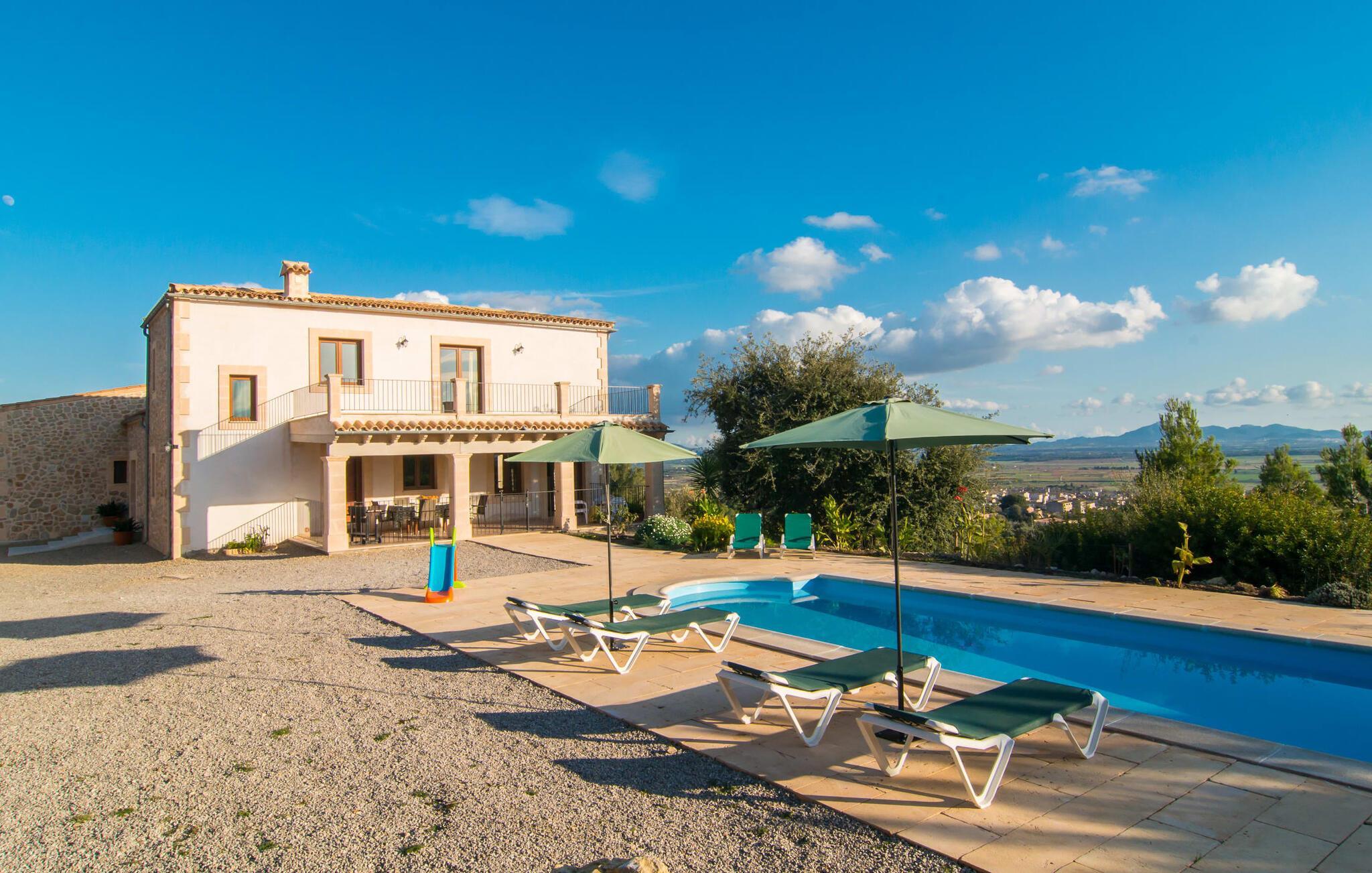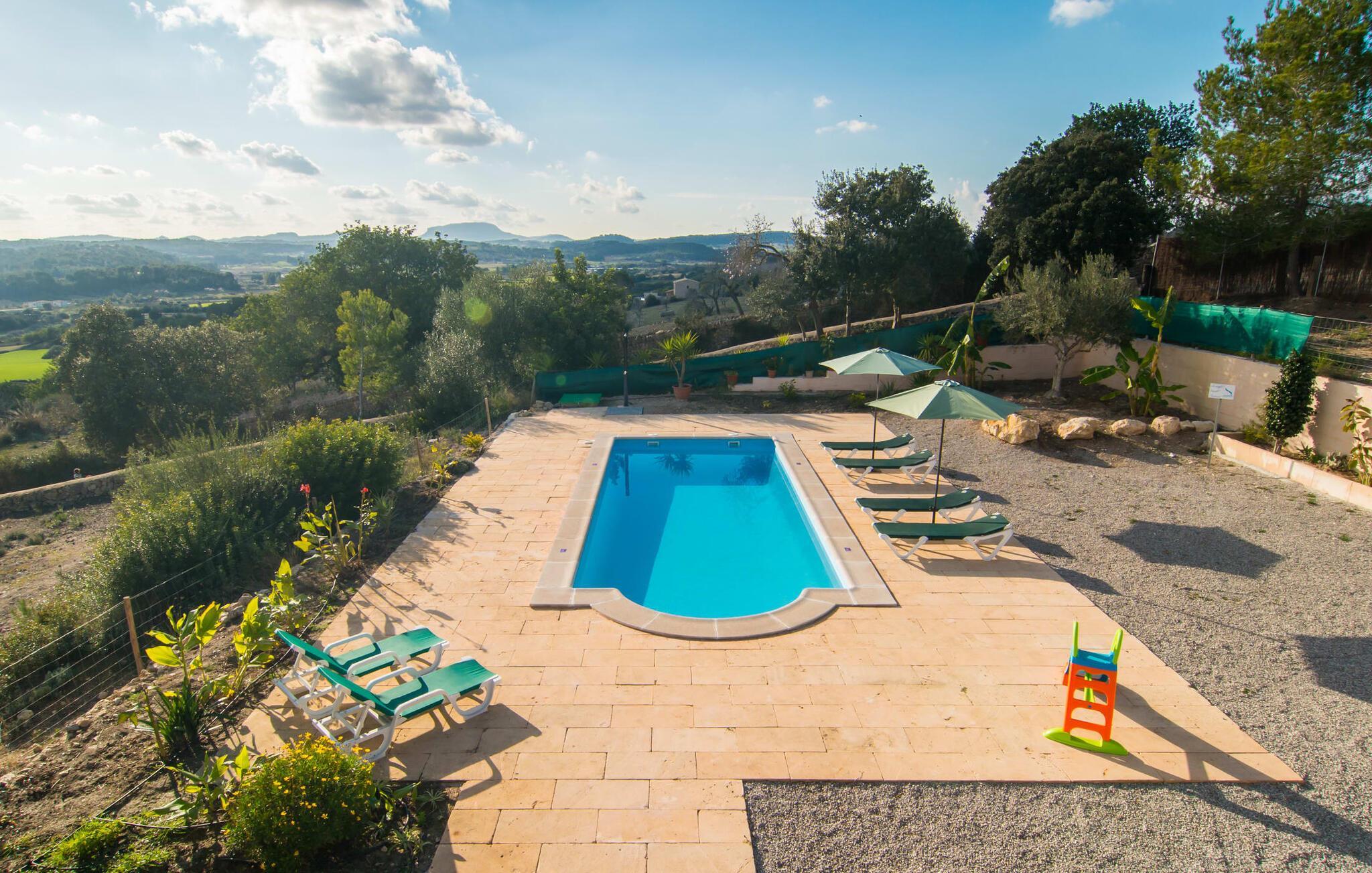 Den hyggelige villa "Son Morei" er beliggende i en vidunderlig bjergbeliggenhed over den smukke landsby Vilafranca de Bonany. Det sydvendte hus byder ikke kun på udsigt over landsbyen, men også en fænomenal udsigt over hele det centrale ø-niveau, "Plà de Mallora". Er der en bedre garanti for en afslappende ferie for dig? Selve ejendommen er omgivet af en meget naturlig have fuld af frodig middelhavsvegetation, som flyder næsten problemfrit ud i bjergene. Direkte foran huset er der en rummelig pool, indlejret i en naturstenssolterrasse med plads til op til seks liggestole. En eller to parasoller giver skygge. Fra poolområdet går du direkte til huset med dens glatte overflade og sandstensindrammede facade. Når du forlader den forfriskende pool bag dig, kan du træde ind på verandaen med dens bærbare grill og ensemble af rattanmøbler - en vidunderlig udendørs spiseplads på ethvert tidspunkt af dagen. På højre side, med udsigt over landsbyen, blev der bygget en anden rummelig solterrasse - et spektakulært udendørs opholdsområde. Takket være en storslået altan direkte foran suiten, der fuldstændig fylder øverste etage, bliver udsigten fra denne højde endnu mere attraktiv for enhver besøgende, der elsker det brede blå derude. Terrasserne fører ind i denne fantastiske villa. Fra verandaen kommer man direkte ind i den lyse stue, hvis vægge er dekoreret med print fra gamle mestre. Dette rummelige værelse lover mange hyggelige timer med afslapning på bløde puder foran den imponerende åbne pejs ved siden af det vægmonterede LCD-tv. Selvom du finder en spiseplads her, tilbyder det solfyldte køkken også en alternativ spiseplads. Dette velproportionerede område med døre til terrassen med delvis udsigt over Vilafranca er fuldt udstyret og smagfuldt designet. Køkkenskabene er lavet af solide vægge og er koordineret med bordet, der adskiller koge- og spisepladserne. Dørene er udført i karamelfarvet træ og hele området er oplyst af loftspots. Sammen med de højglans sandstensfarvede vægfliser, som tilføjer et elegant touch til hele området. I stueetagen er der gæstetoilet, to af de tre soveværelser og et herligt smart badeværelse med bruseniche, alt flisebelagt i maritim blå og hvid. De to soveværelser - et dobbeltværelse og et med to enkeltsenge - er begge udstyret med indbyggede skabe, hvilket giver masser af opbevaringsplads til din feriegarderobe. Hele øverste etage er dedikeret til master bedroom, hvor et studie tilbyder ikke kun et stort soveværelse med den førnævnte balkon, men også et skrivebord, et privat fladskærms-tv og en ekstra sovesofa, hvilket gør denne villa til en misundelsesværdig beliggenhed og usædvanligt overkommelig pris, i lavsæsonen en attraktiv mulighed selv for kun to personer. Så hvis du gerne vil tilbringe din ferie på landet og stadig være i nærheden af den næste landsby, er "Son Morei" det rigtige sted for dig. Den frugtbare slette i midten af øen er kendt for sine duftende produkter, som ofte er tilgængelige ved siden af vejen eller, hvis du foretrækker det, på markedet på Placa Major i Vilafranca. Lækre vintomater, pimientos (grøn peber) samt abrikoser og de berømte honningmeloner er typiske for denne region, selvom landbruget har mistet noget af den betydning, det engang havde. Byen, som kun ligger to minutters kørsel derfra, er blevet skånet for masseturisme, så du kan komme i kontakt med mallorcanerne, mens du nyder din morgen "caffé con leche" og køber dine morgenmadssandwich. Da huset ligger på en asfalteret vej over byen (selvom det er en blindgyde, vil der være en del trafikstøj afhængig af vindretning), er lokale forbindelsesveje nemme at nå. Hvis du vil have noget lidt mere urbant, skal du bare tage til Manacor for at shoppe. Vi hos Fincallorca ønsker dig en afslappende ferie - betagende udsigt alt inklusive - i den indbydende og hyggelige villa "Son Morei". Den hyggelige, nybyggede villa "Son Morei" med udsigt over den smukke by Vilafranca de Bonany ligger i en smuk bjergbeliggenhed i hjertet af øen. Du finder butikker i byen, og der er et ugentligt marked på Placa Major om onsdagen. For mere omfattende shoppingmuligheder venter Petra eller Manacor. "Calas de Mallorca" på østkysten kan nås med bil for en dagstur til stranden; Den overvældende smukke naturlige bugt Cala Varques er ca. 25 km væk. Son Morei tilbyder jer et uforglemmeligt ophold med massage i hjemlige omgivelser.