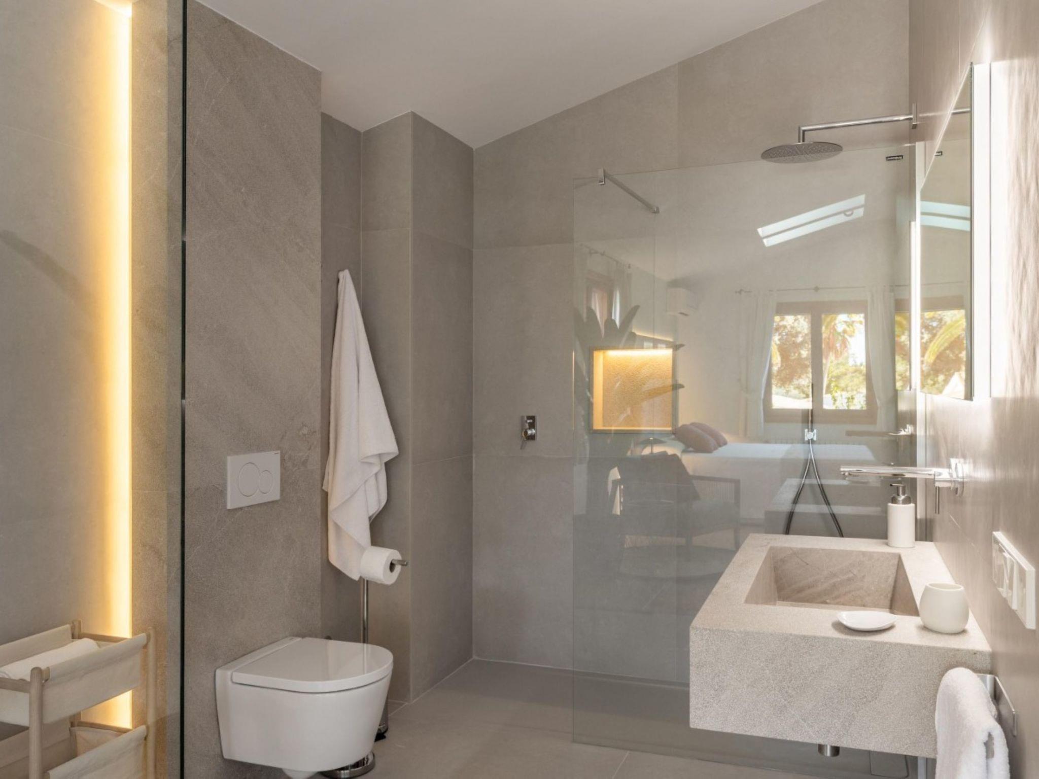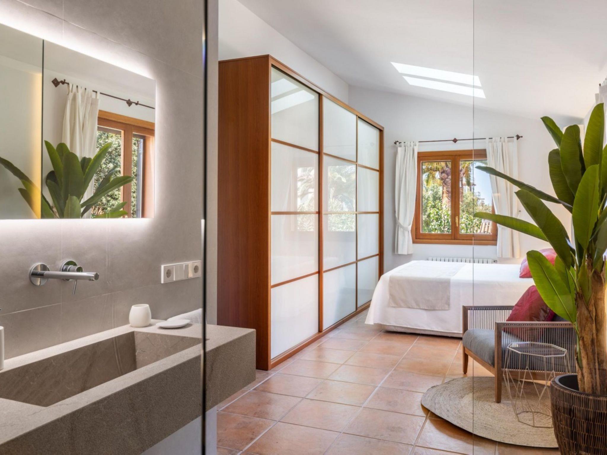 "Embat de Mar", 5-room villa 400 m2. Object suitable for 8 adults. Comfortable and cosy furnishings: large living/dining room with open-hearth fireplace, dining table, satellite TV, hi-fi system and fan. Exit to the terrace, to the swimming pool. 1 double bedroom with 1 french bed (1 x 150 cm, length 200 cm), shower/WC and air conditioning. 1 double bedroom with 1 french bed (1 x 150 cm, length 200 cm). Exit to the patio. Large kitchen (4 hot plates, oven, dishwasher, toaster, kettle, microwave, electric coffee machine) with dining table. Upper floor: (ladder), 2 large double bedrooms, each room with 1 french bed (1 x 150 cm, length 200 cm), shower/WC and air conditioning. Exit to the terrace. Natural stone floors. Terrace furniture, barbecue (portable), deck chairs, sitting area. Panoramic view of the sea. Facilities: washing machine, safe, iron, children's high chair, baby cot for up to 2 year olds, hair dryer, baby changing unit. Internet (WiFi, free). Parking. ETV/4027 // Reg. Nr.: ESFCTU00000702300010992700000000000000000000ETV/40275