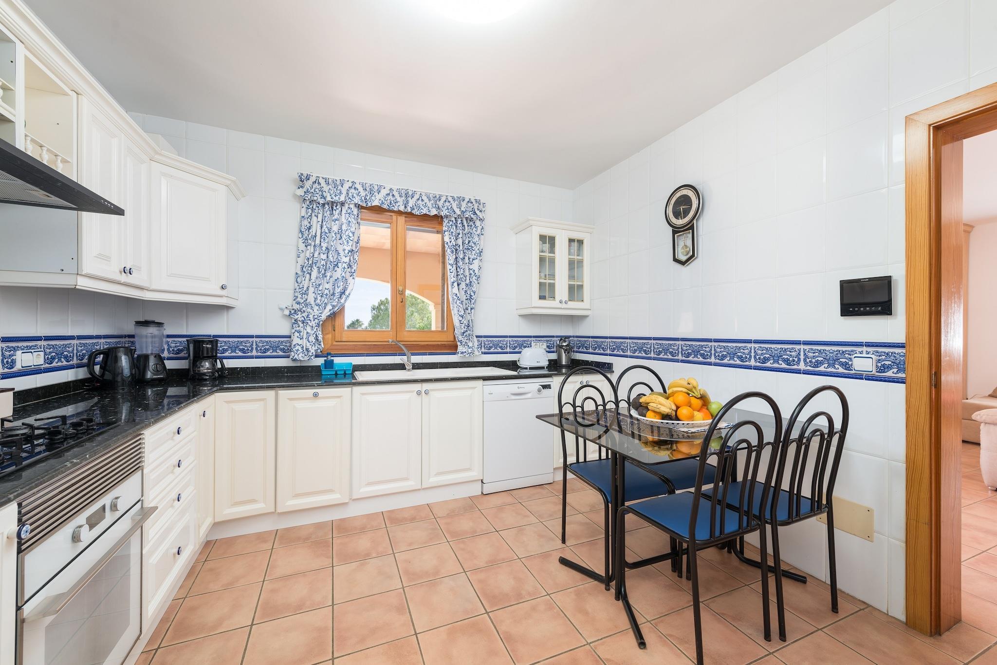 Udendørs afslapningsrum Vågn op omgivet af Son Serveras fredfyldte landskab. Verandaen er perfekt til en afslappet morgenmad med udsigt over byen og bjergene. Nyd solen på 6 liggestole ved den 8 x 4 meter store klorpool, eller nyd en stille stund på den øverste terrasses 2 liggestole. Aftenerne kommer til live med grillpladsen, ideel til at lave friske måltider, mens du nyder den landlige atmosfære. Den indhegnede ejendom sikrer fuldstændig privatliv og fred under hele dit ophold. Komfortable opholdsområder Træd indenfor til en rustik stue/spisestue, hvor alle kan samles til måltider eller slappe af i sofaen og se TV-sat. Det fuldt udstyrede køkken har en gaskomfur, alle nødvendige redskaber og et bord til familie-stil spisning. Fire soveværelser rummer din gruppe komfortabelt: to på stueetagen (en dobbeltseng, en tvilling) og to ovenpå med to enkeltsenge. To badeværelser, et vaskerum med vaskemaskine, strygejern og strygebræt, plus central olievarme og sommerventilatorer, gør opholdet her praktisk og behageligt. Der er også en barneseng og høj stol til familier. Praktisk beliggenhed i nærheden Nyd roen på landet, mens du bor tæt på vigtige tjenester. Son Serveras centrum ligger kun 1 km væk, Cala Bona-stranden 3 km og Golf Son Servera 5 km. Lokale restauranter og butikker er inden for rækkevidde, hvilket gør det nemt at udforske eller nyde et afslappet måltid. Udvendig parkering til 3 biler er tilgængelig.