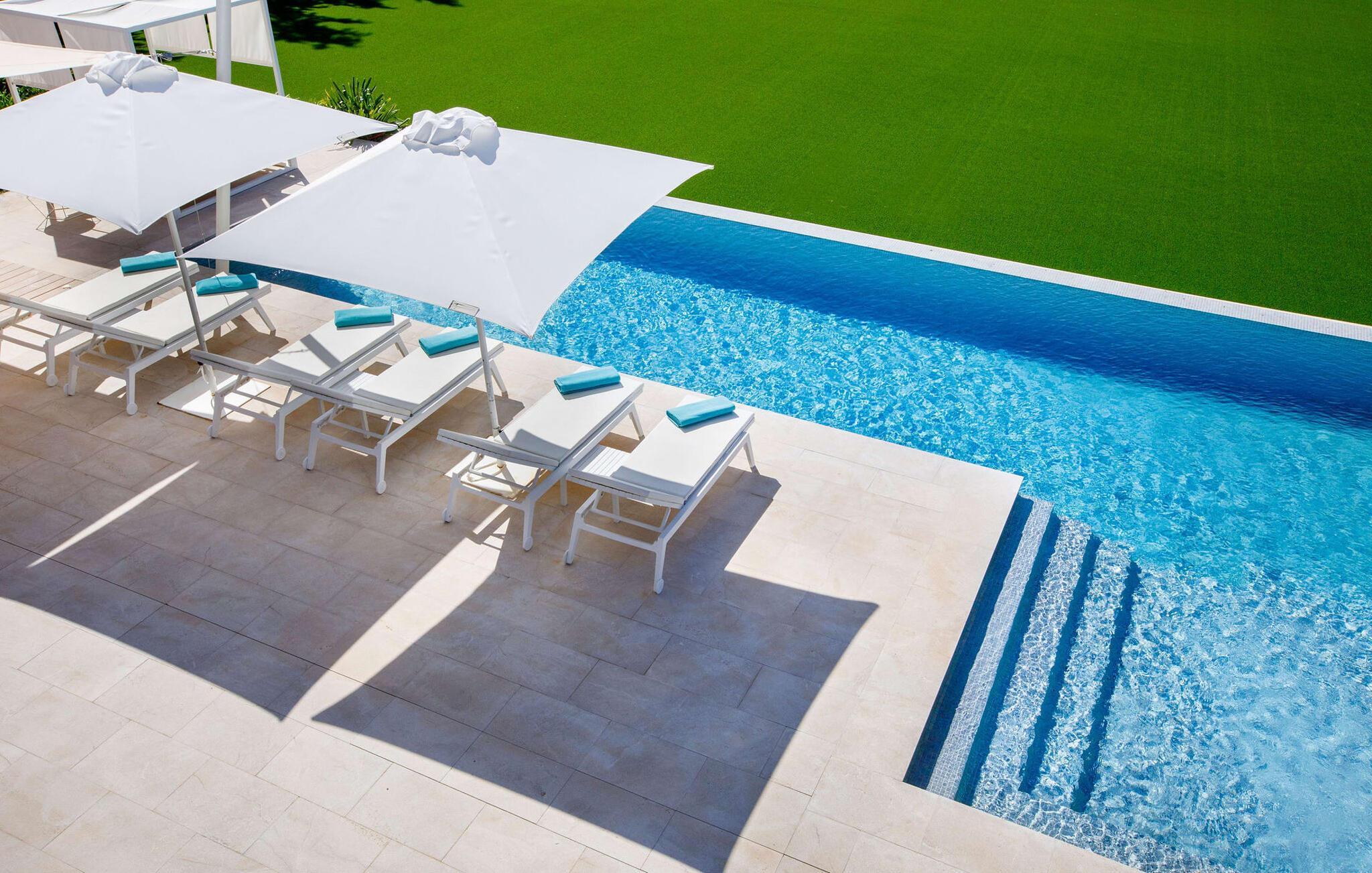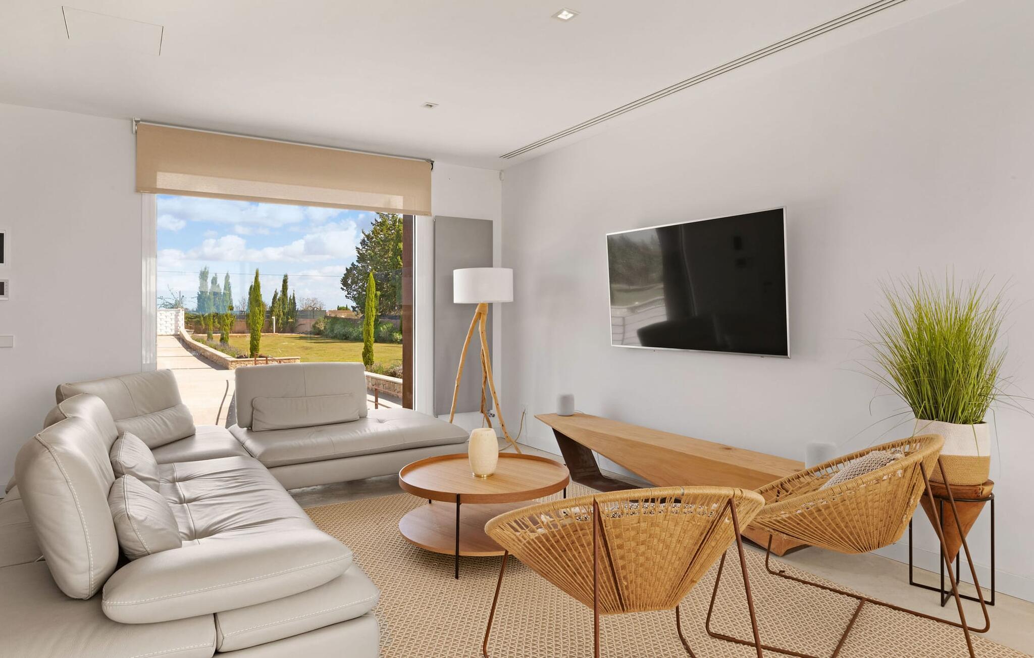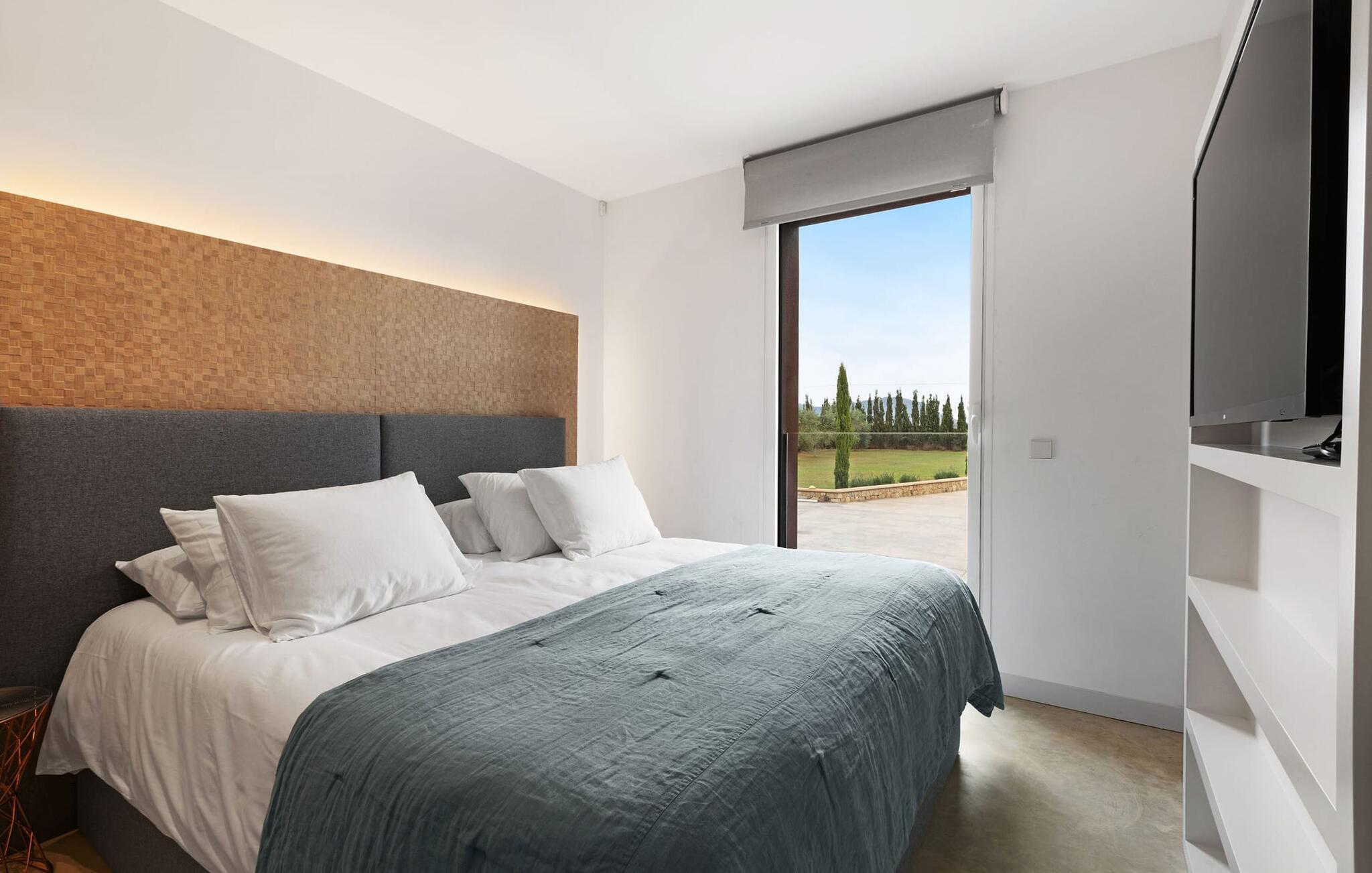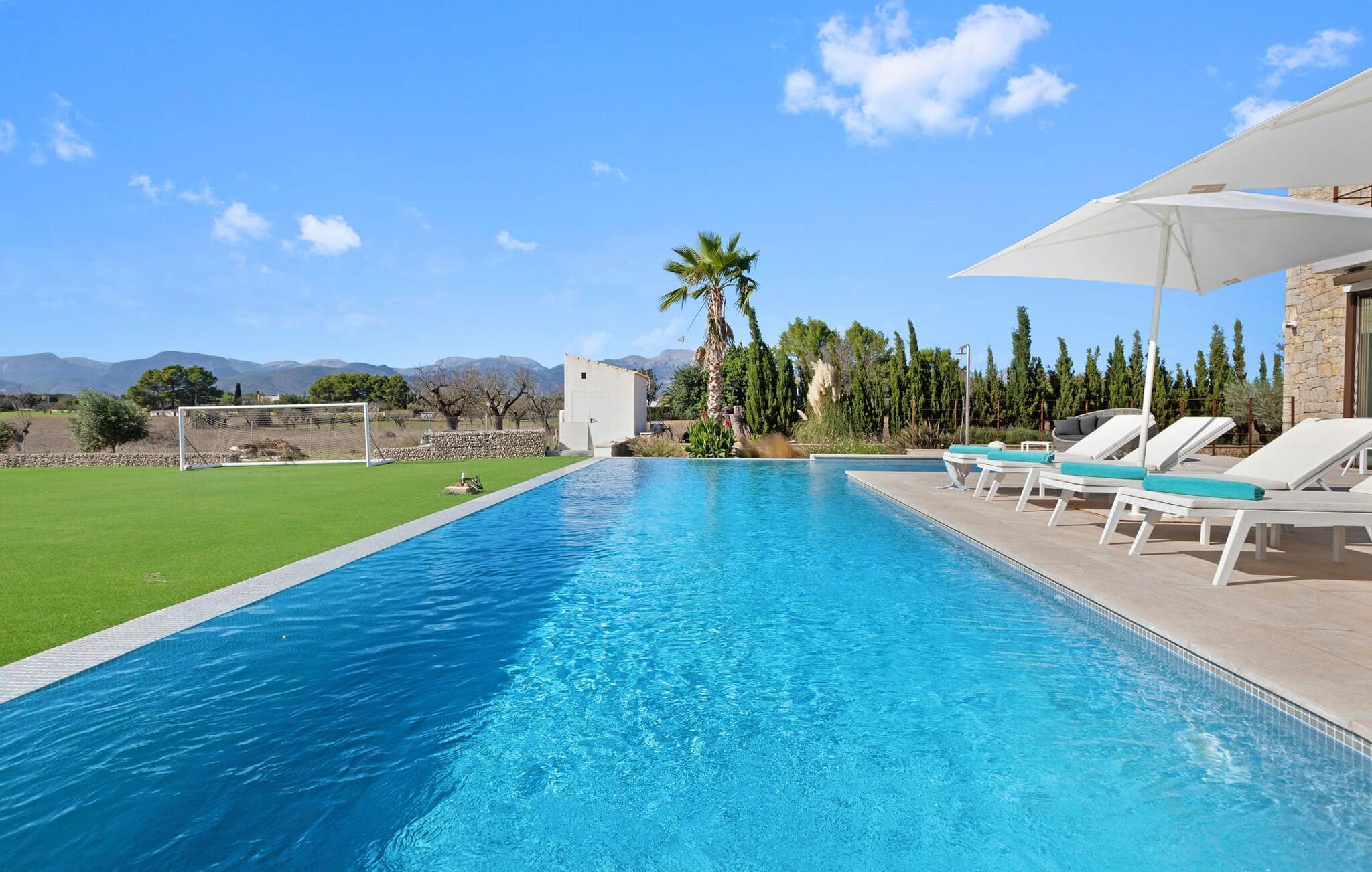 Har du en stjernebesat ferie i tankerne, så se nærmere på dette enestående feriehus. Denne Mallorca-gård er en rigtig allrounder, der vil glæde feriegæster med kræsne forventninger. “Son Set” viser allerede talent på udeområdet, som bestemt scorer point ikke kun med sin størrelse, men også med sine velholdte arealer som den stedsegrønne (kunstige) græsplæne med fodboldbane, stilfulde terrasser med og uden tag . Et af højdepunkterne ved denne feriefinca er den store pool med trapper og tilstødende solterrasse, som ikke kun byder på komfortable liggestole, men også en balinesisk seng. Et ekstraordinært og perfekt udstyret udekøkken med kogeø og bord, vinkøleskab, køleskab, opvaskemaskine, ovn, Weber grill og spisebord er endnu et højdepunkt, der kan lukkes med glasskydedøre. Den overdækkede, komfortabelt møblerede terrasse direkte ved huset kan også bruges som indendørs eller udendørs område. Dette er et Fincallorca feriehus. Udvidelsen af denne terrasse danner stuen, som på imponerende vis afspejler stuehusets højkvalitets, smagfulde stil. Lyse, harmoniske farver samt unikke møbler og dekorative stykker skaber en trendy flair. Den åbne og lyse stue-spisestue flyder glat ud i køkkenet med en centralt placeret kogeø. Det elegante og hyggelige udtryk fortsætter i soveværelserne: I stueetagen er der et soveværelse med dobbeltseng og et badeværelse, på øverste etage er der yderligere tre dobbeltværelser, hvoraf det ene har eget badeværelse og egen terrasse. Et andet badeværelse fuldender disse opholdsrum. I kælderen finder du et praktisk vaskerum og et airconditioneret fitnessområde med forskellige træningselementer samt siddepladser og et komplet badeværelse. Denne bondegård på Mallorca er et absolut must for enhver, der lægger særlig vægt på eksklusive møbler kombineret med generøsitet og ynde. I landlig beliggenhed nær byen Costitx finder du det stilfulde bondehus "Son Set" med 2.000 m2 yderst velholdt have med græsplæne og middelhavsplanter. Øens hovedstad og sandstrandene i Alcúdia-bugten er omkring en halv times kørsel væk. I Costitx, som ligger omkring 10 minutter væk i bil, kan du gøre dine indkøb om lørdagen, for eksempel på det lokale ugentlige marked. Centrum af Inca er kun omkring 4 km væk.