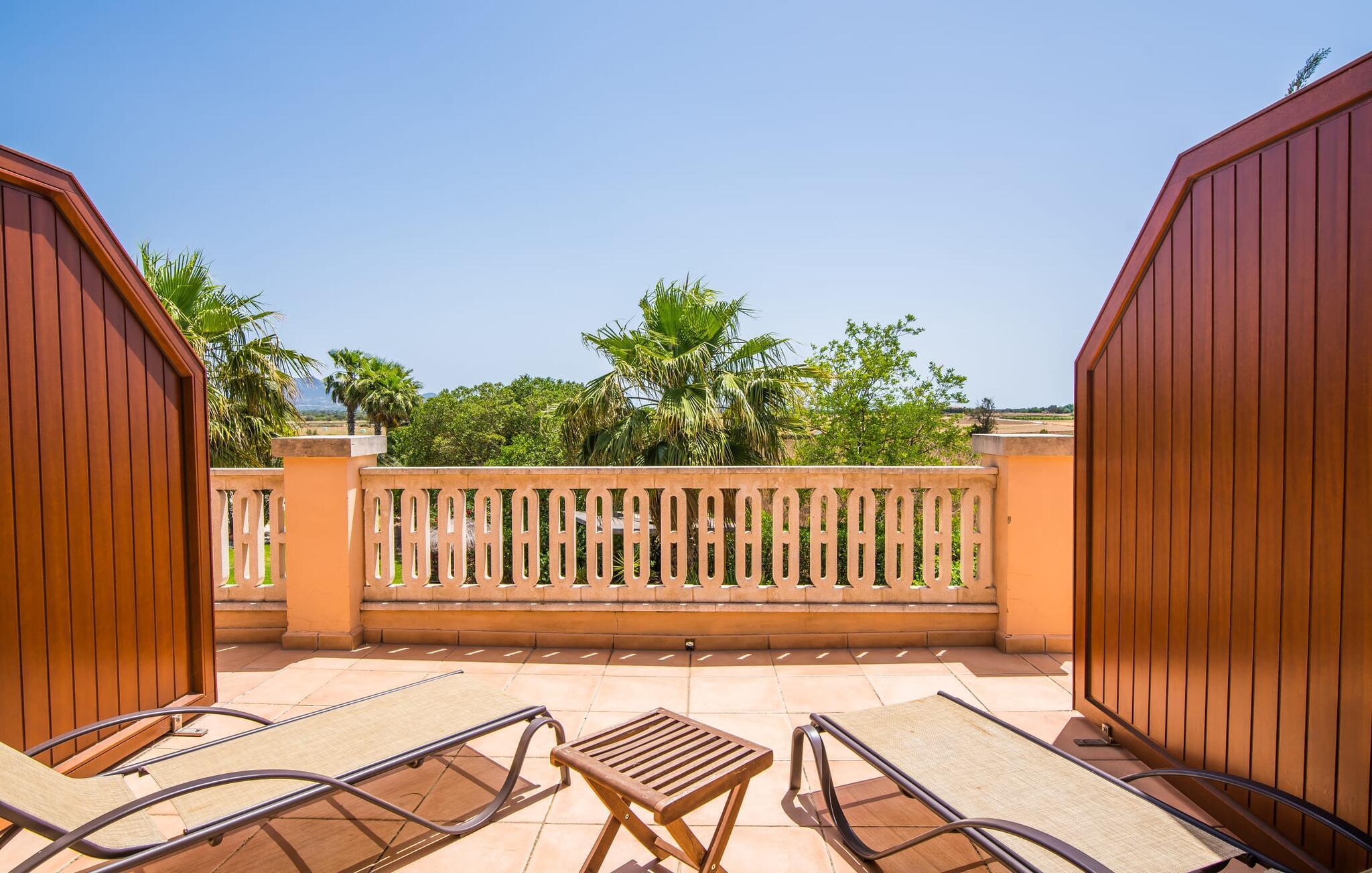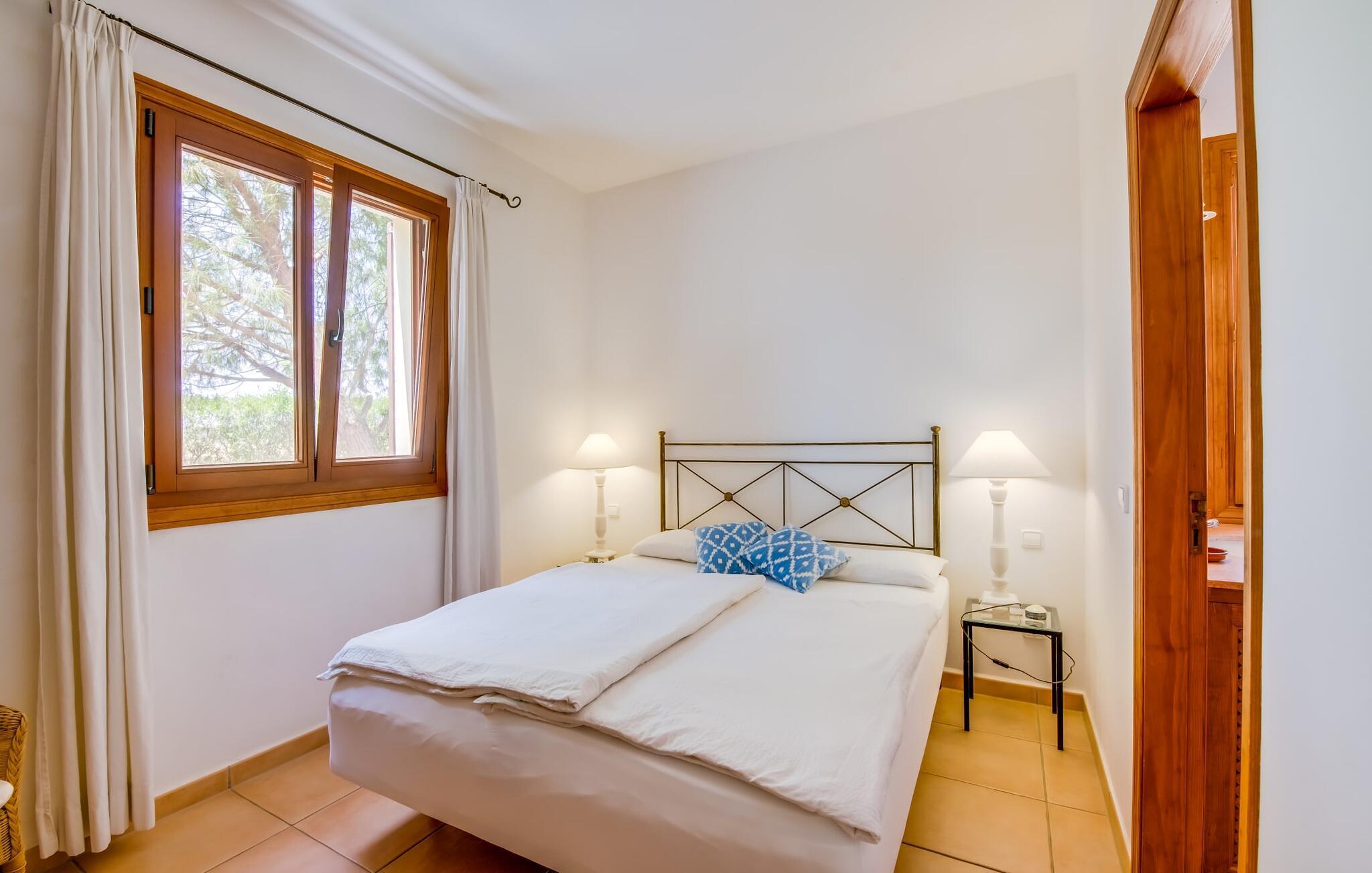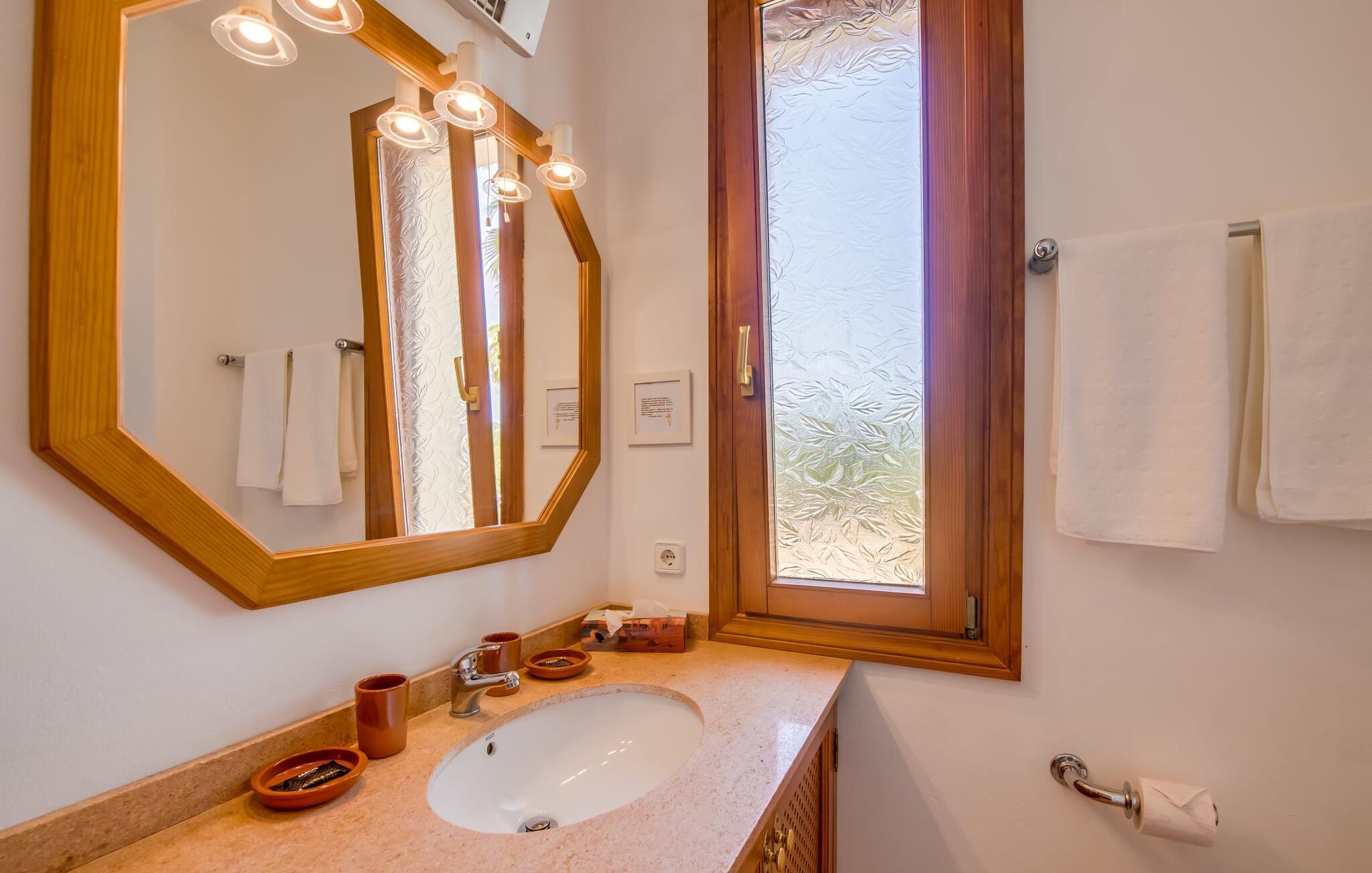 Masser af plads til alle dine kære, en betagende beliggenhed og imponerende faciliteter - det er, hvad den rummelige og smukke villa "Son Vaquer" byder på. Og det er ikke alt. Alene haven er en lille drøm. Velholdte græsplæner og smukt arrangerede palmer og blade omkranser den glitrende blå pool, der med sin længde på 12 m er ideel til at svømme et par længder. Du kan slikke solen i en til to timer på den stenbelagte terrasse, ideelt set på en af ??de komfortable liggestole, med solbriller på næsen og en god bog i hånden. Hvad kunne være bedre? Når du er helt afslappet, kan du tage en afslappet spadseretur til et af de luftige spiseområder, og hvis du er heldig, vil nogen allerede have tændt gasgrillen og tilberedt et lækkert måltid. Bagefter kan du feste i en hyggelig atmosfære ved det smukke spisebord og samtidig nyde den fantastiske udsigt over naturen. Hvis der er et problem på stedet, kan den venlige ejendomsadministrator tage sig af det med det samme, fordi hun bor i et lukket område af fincaen og udhuset. Dette er et Fincallorca feriehus. Villaens indre er lige så smuk som ydersiden. Designet er domineret af en vidunderlig frisk farvesammensætning, der går igennem alle rum og giver indretningen klare linjer. Varmt træ er kombineret med blå og hvide toner, en middelhavsstemning og enkel skandinavisk chic. Tror du, at disse stilarter ikke kan kombineres? Tænk igen! De skaber en skøn blanding og udstråler også den ultimative feel-good atmosfære. I det store køkken finder du alt hvad du behøver for at tilberede nogle velsmagende lækkerier. Og i det åbne opholds- og spiseområde finder du alt hvad du behøver for at slappe af, såsom en stor sofa, hvor du kan fordybe dig i en god bog, eller et fladskærms-tv til en hyggelig filmaften. Efter en lang dag med ferieaktiviteter, kan du komme til at falde langsomt i søvn i aftentimerne. Intet problem! For en afslappende søvn er der seks komfortable soveværelser, som er lige så smukke som resten af ??villaen. Bare vælg en, og du kan sove behageligt og drømme til næste morgen. Udhvilet? Gå derefter til det private badeværelse. Det bedste ved det: Du kan bruge lige så meget tid, som du har brug for, fordi der er i alt seks badeværelser til din rådighed. Så du virkelig kan nyde dit morgenbruser. Men det er ikke kun selve villaen, der har meget at byde på. Området er også oplagt til spændende ferieture. Uanset om du vil slentre gennem den livlige by Felanitx (som også har et fantastisk ugentligt marked) eller tage en tur til den lidt større by Manacor – begge dele er bestemt et besøg værd! I et par stille timer kan du slentre gennem det omkringliggende landskab; Hvem ved, hvad du vil opdage der? Og selvfølgelig: havet! Kysten ligger kun 14 km væk i luftlinje. Her kan du vælge, hvilken af ??de fortryllende strande, du gerne vil bruge dagen på. Om Cala Antena, Cala Murada eller Cala Tropicana - de er alle smukke! Den betagende og rummelige villa "Son Vaquer" har en fantastisk beliggenhed på det sydlige Mallorca. Omgivet af marker og enge kan du nyde godt af en fantastisk udsigt over naturen. Du kan gøre dine indkøb og andre daglige ærinder i den livlige by Felanitx, kun 6,8 km væk. Og havet med sine smukke sandstrande ligger kun 14 km væk i luftlinje.