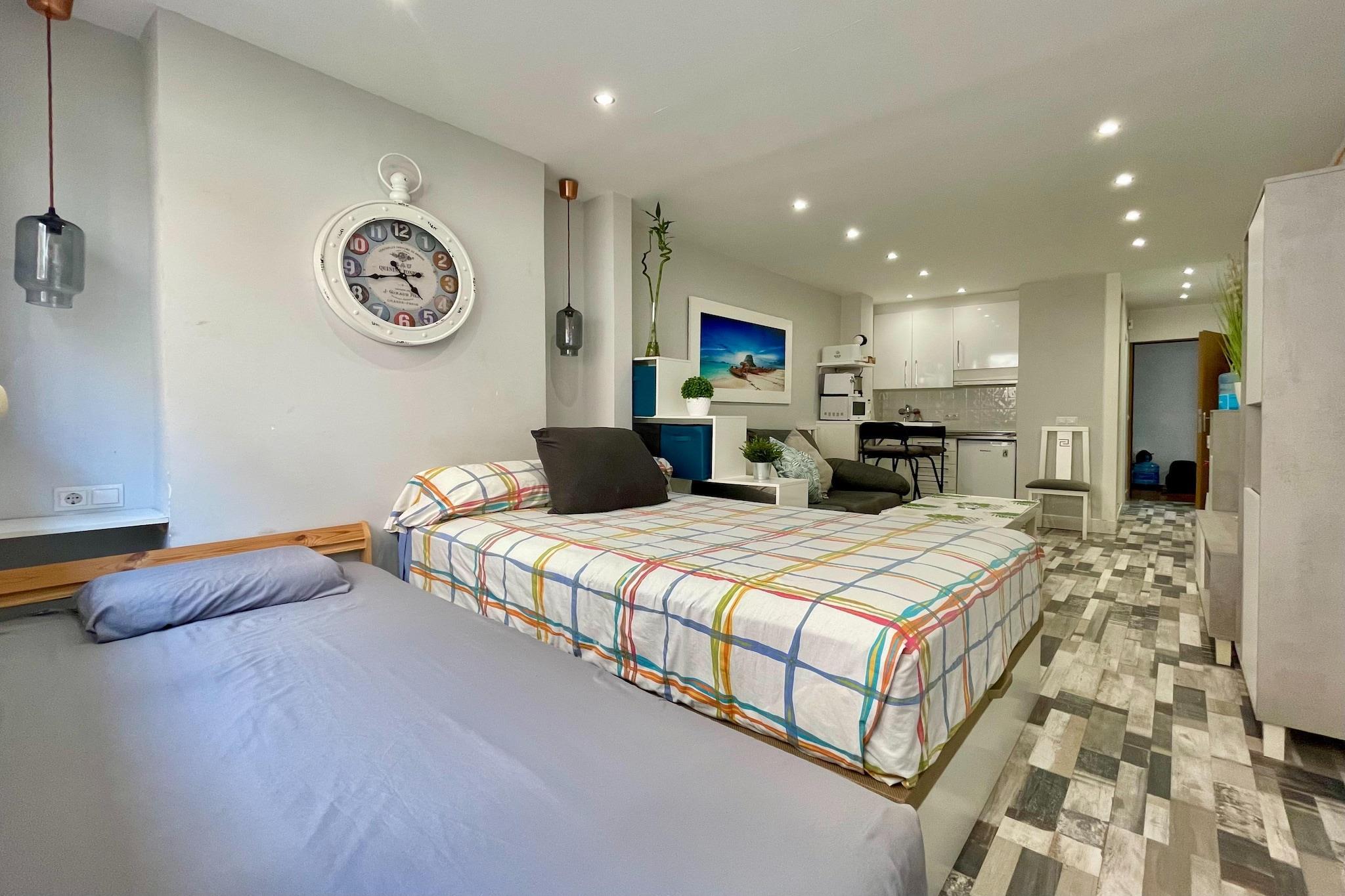 Velkommen til denne charmerende ejendom i Torremolinos, ideel til en afslappende ferie med en lille familie. Beliggende på første sal i en velholdt bygning, har denne lejlighed en fælles swimmingpool 200 meter væk, kun 5 minutters gang, så perfekt til en afslappende og forfriskende dukkert. Beliggende kun 300 meter fra den smukke strand ved havet og kun 2 km fra det pulserende centrum af Torremolinos, tilbyder denne lejlighed både bekvemmelighed og tilgængelighed. Oplev et mindeværdigt ophold i denne dejlige lejlighed, hvor komfort og beliggenhed mødes til den perfekte familieferie. Indenfor finder du et åbent køkken udstyret med alt det nødvendige: kogeplader, emhætte, vaskemaskine, tørretumbler og køleskab med fryser. Stuen/spisestuen er designet til komfort og funktionalitet, med en dobbelt sovesofa, tv, spisebord og et hyggeligt opholdsområde perfekt til familiesammenkomster. Der er et badeværelse med bruser, der sikrer et behageligt ophold og en behagelig temperatur og et behageligt ophold. hele året. Bemærk venligst, at husejeren tillader 2 kæledyr med 30 EUR pr. kæledyr/ophold, men kæledyr må højst veje 5 kg.