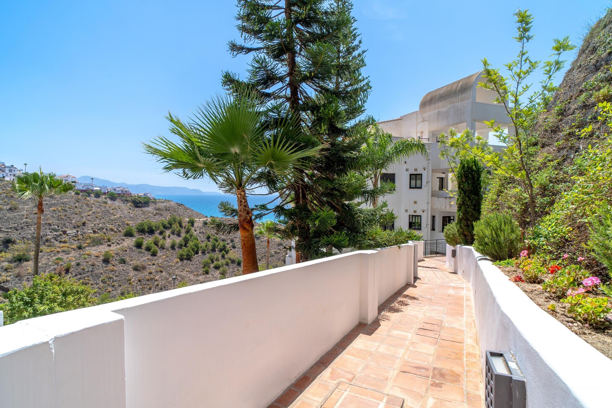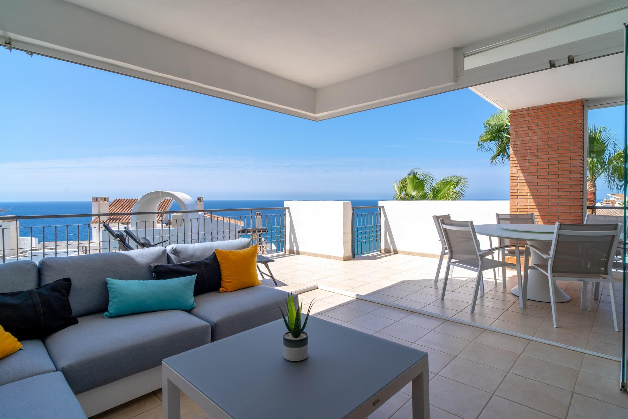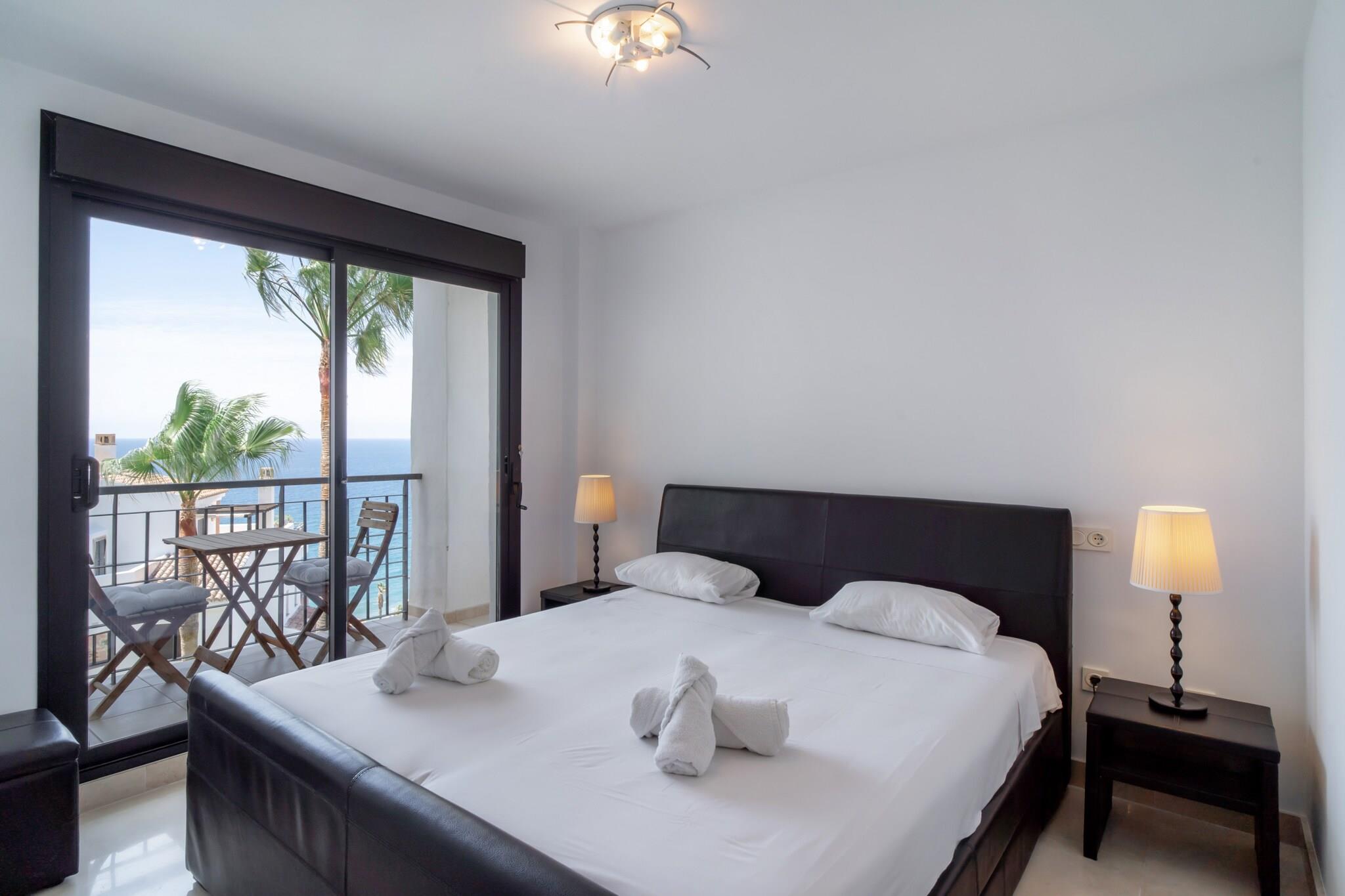 Dette moderne feriehus med panoramaudsigt over havet har plads til op til fire gæster i to soveværelser, begge møbleret med dobbeltsenge. Opholdsstuen har en komfortabel sofa, og en stor, solrig terrasse udvider pladsen med udendørs siddepladser og udsigt over Middelhavet. Det er ikke kæledyrsvenligt, men tilbyder valgfri ekstraudstyr såsom en barneseng, højstol eller en velkomstpakke for ekstra bekvemmelighed. Ejendommen har også en privat glasafskærmet del af terrassen, hvilket gør den behagelig året rundt. Denne lejlighed ligger i den naturskønne Calaceite-urbanisering mellem de charmerende byer Torrox Costa og Nerja. Den nærmeste sandstrand ligger kun 500 meter væk, tilgængelig til fods, hvor gæsterne finder strandklubber, restauranter og liggestole. For rejseforbindelser tilbyder et nærliggende busstoppested offentlig transport til lokale byer, men det anbefales at have en bil. Malaga Lufthavn ligger cirka 50 minutters kørsel væk, hvilket gør dette til en godt forbundet, men fredelig base for kystudforskning. Lejligheden har to badeværelser, hvoraf det ene er ensuite, og et elegant, fuldt udstyret køkken med moderne apparater. Centraliseret aircondition sikrer komfort i alle værelser, inklusive opholdsstuen og soveværelserne med havudsigt. Gæsterne har også adgang til to fælles swimmingpools med grønne områder til solbadning og afslapning. Der er højhastighedsinternet og tv, og der er nem offentlig parkering lige uden for bygningen.