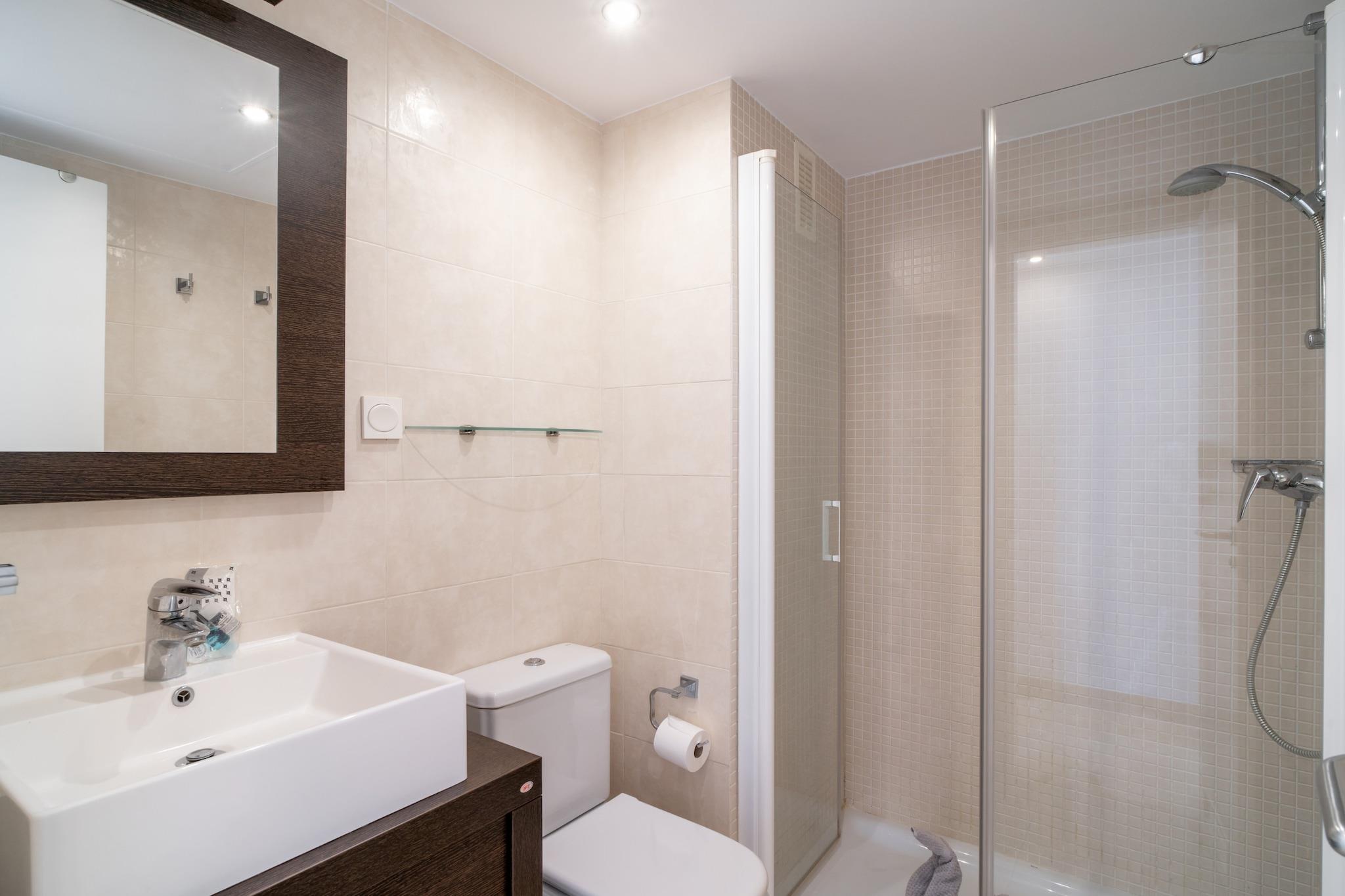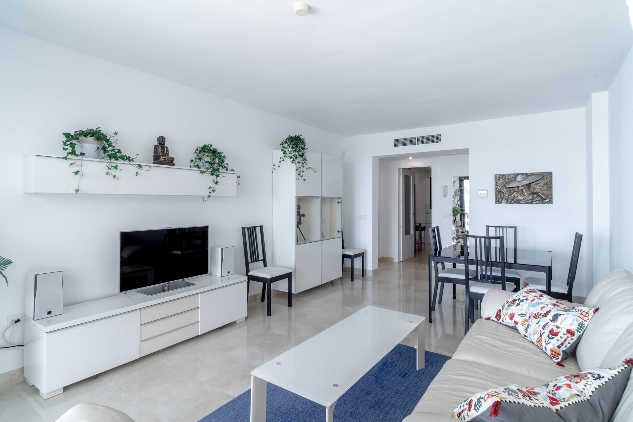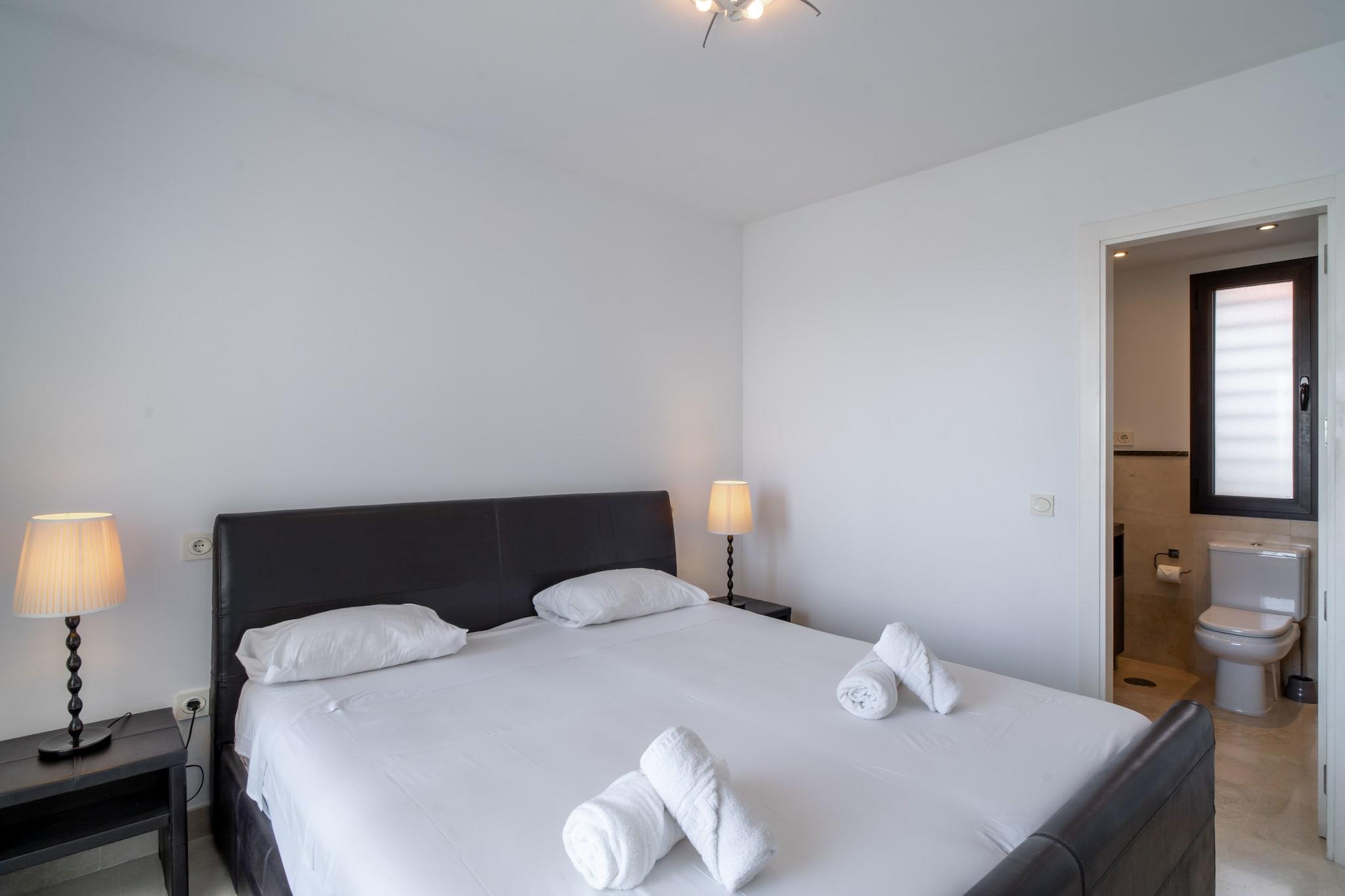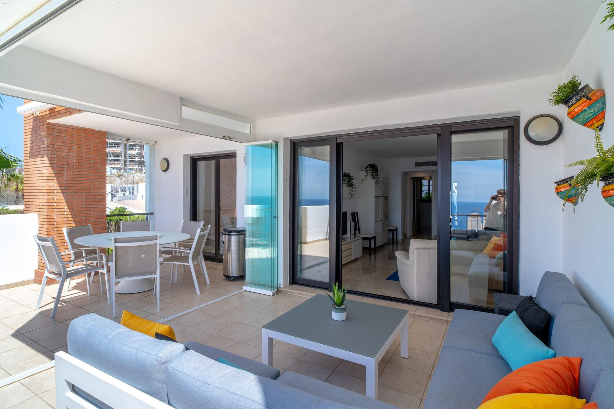 Dette moderne feriehus med panoramaudsigt over havet har plads til op til fire gæster i to soveværelser, begge møbleret med dobbeltsenge. Opholdsstuen har en komfortabel sofa, og en stor, solrig terrasse udvider pladsen med udendørs siddepladser og udsigt over Middelhavet. Det er ikke kæledyrsvenligt, men tilbyder valgfri ekstraudstyr såsom en barneseng, højstol eller en velkomstpakke for ekstra bekvemmelighed. Ejendommen har også en privat glasafskærmet del af terrassen, hvilket gør den behagelig året rundt. Denne lejlighed ligger i den naturskønne Calaceite-urbanisering mellem de charmerende byer Torrox Costa og Nerja. Den nærmeste sandstrand ligger kun 500 meter væk, tilgængelig til fods, hvor gæsterne finder strandklubber, restauranter og liggestole. For rejseforbindelser tilbyder et nærliggende busstoppested offentlig transport til lokale byer, men det anbefales at have en bil. Malaga Lufthavn ligger cirka 50 minutters kørsel væk, hvilket gør dette til en godt forbundet, men fredelig base for kystudforskning. Lejligheden har to badeværelser, hvoraf det ene er ensuite, og et elegant, fuldt udstyret køkken med moderne apparater. Centraliseret aircondition sikrer komfort i alle værelser, inklusive opholdsstuen og soveværelserne med havudsigt. Gæsterne har også adgang til to fælles swimmingpools med grønne områder til solbadning og afslapning. Der er højhastighedsinternet og tv, og der er nem offentlig parkering lige uden for bygningen.