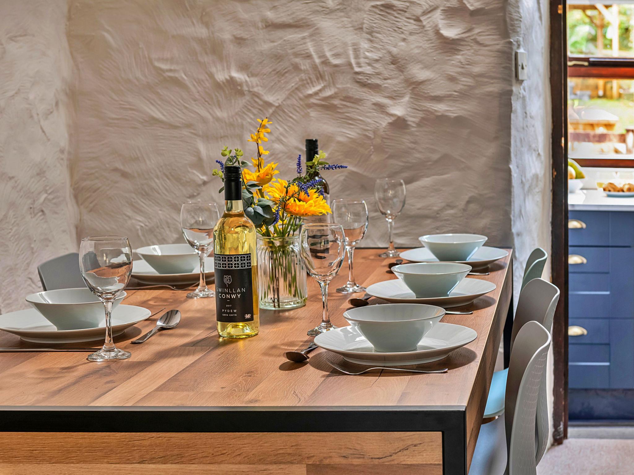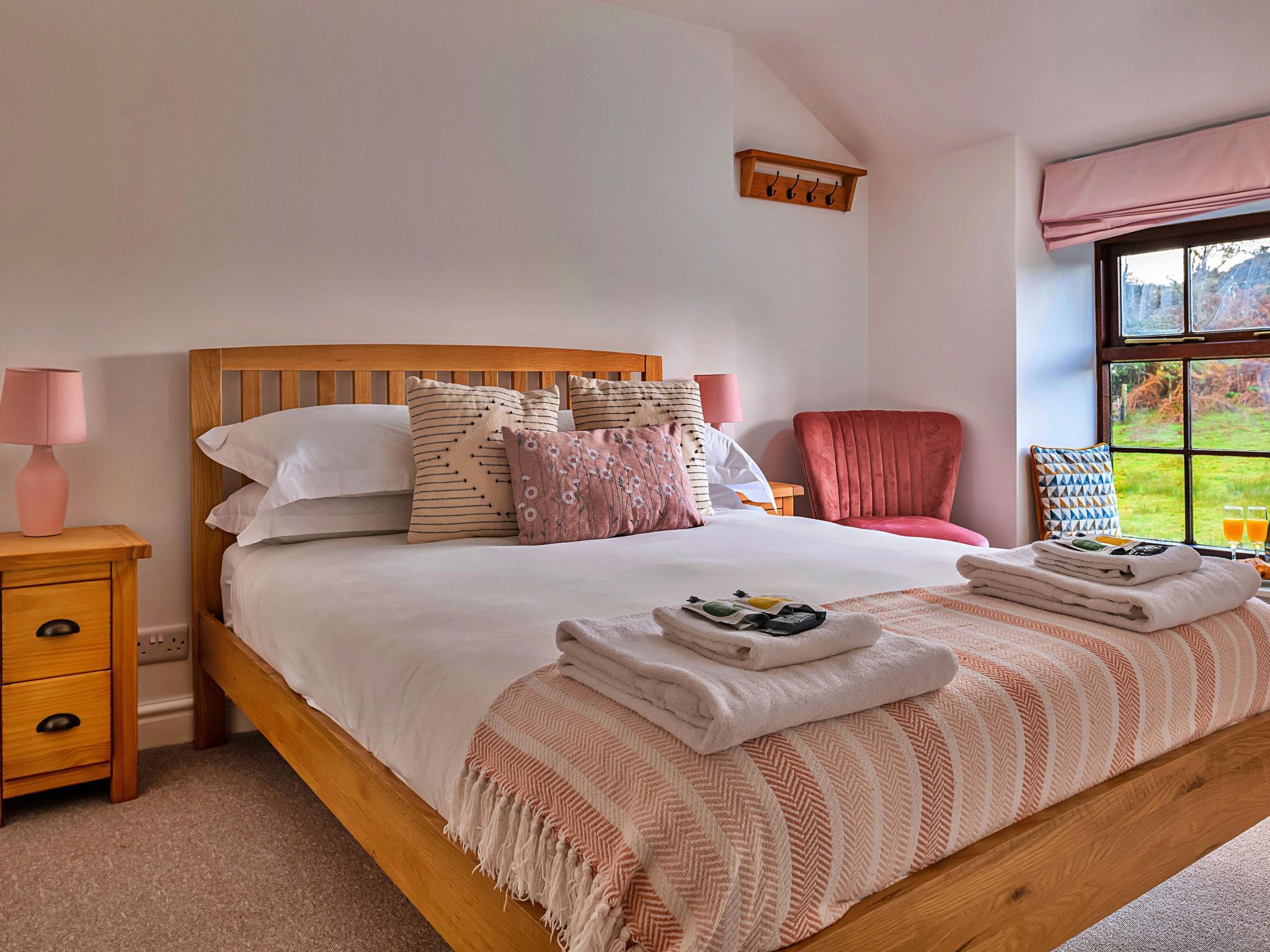 "Ty'r Delyn", 3-room house 110 m2. Object suitable for 5 adults. Living room with open-hearth fireplace and TV. 1 room with 1 bed and 1 french bed. 1 room with 1 double bed. Kitchen (4 hot plates, oven, dishwasher, toaster, kettle, microwave). Shower/WC. Terrace 30 m2. View of the mountains, the garden and the river. Facilities: iron. Internet (WiFi, free). Please note: non-smokers only. Smoke alarm.