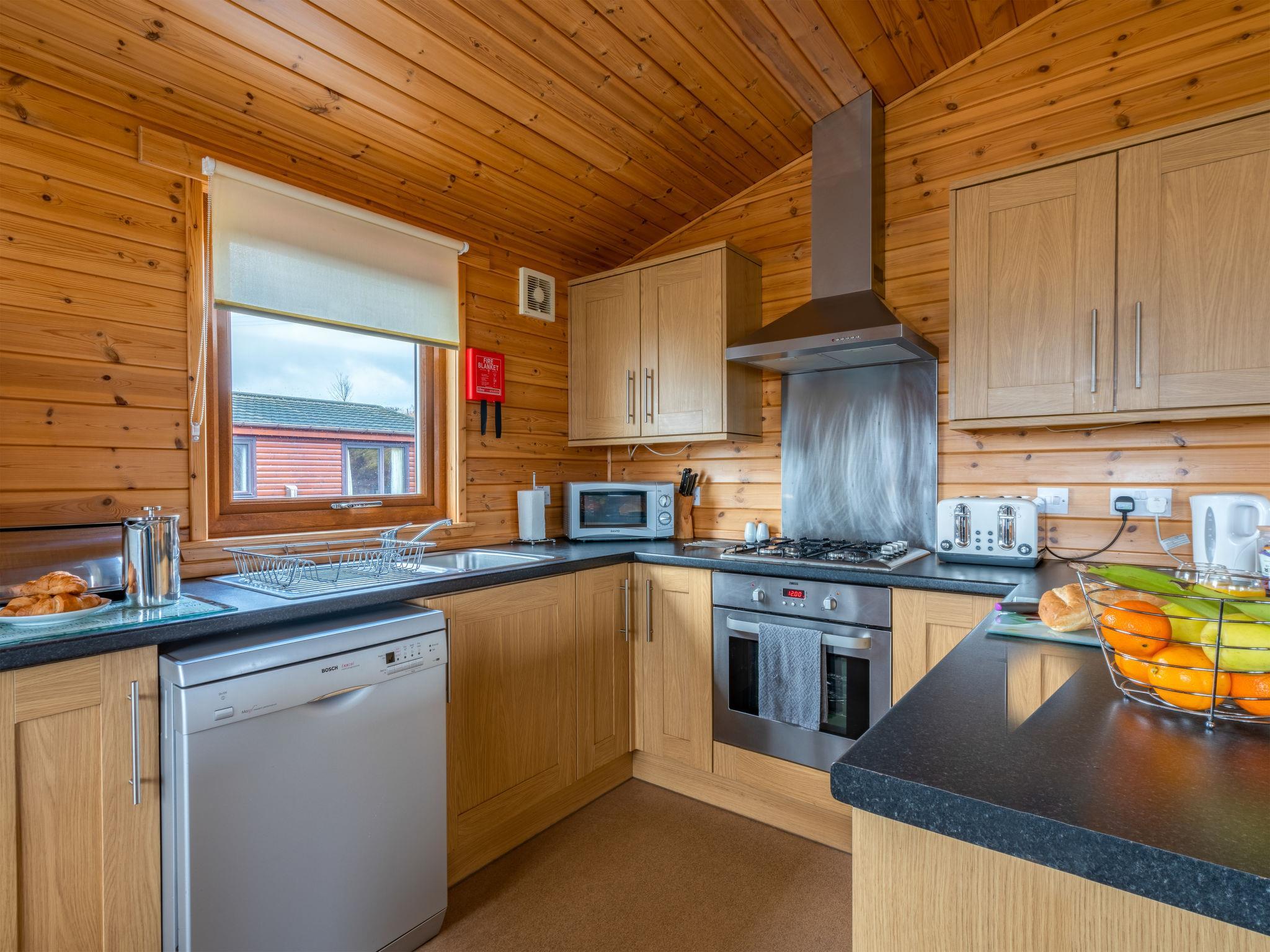 "Loch Leven Lodge 10", 4-room chalet 69 m2. Very tasteful furnishings: open living/dining room with dining table and digital TV. Exit to the balcony. 1 room with 1 double bed and shower/WC. 2 rooms, each room with 2 beds. Kitchen-/living room (4 hot plates, oven, dishwasher, microwave, freezer). Bath/shower/WC. Heating. Balcony furniture. Beautiful distant view of the lake. Facilities: Internet (WiFi, free). Please note: suitable for families. Non-smoking house. Maximum 1 pet/ dog allowed. Please note:- NO CHARGING OF ELECTRICAL VEHICLES PERMITTED - NEAREST CHARGING POINT IS AROUND 4KM.
