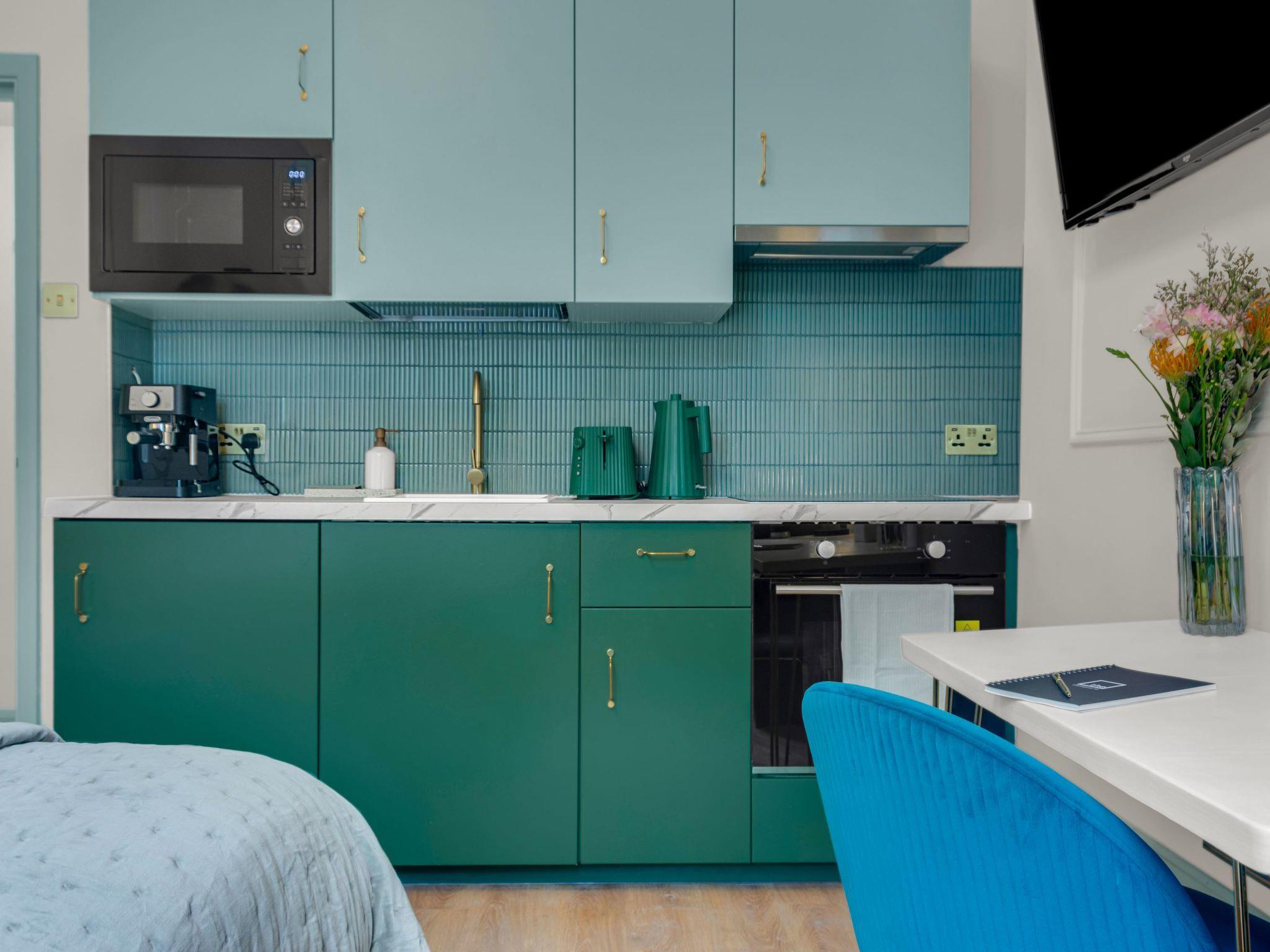 "Kensington Studio", 1-room studio 25 m2. Object suitable for 2 adults. Beautiful and stylish furnishings: open living/sleeping room with 1 double bed, shower/WC, TV, cable TV and flat screen. Open kitchen (oven, 4 ceramic glass hob hotplates, toaster, kettle, microwave). Facilities: hair dryer. Internet (WiFi, free). Please note: not suitable for small children. TV only EN. Smoke alarm, fire extinguisher, no lift. The property is one of a type of property or apartment.