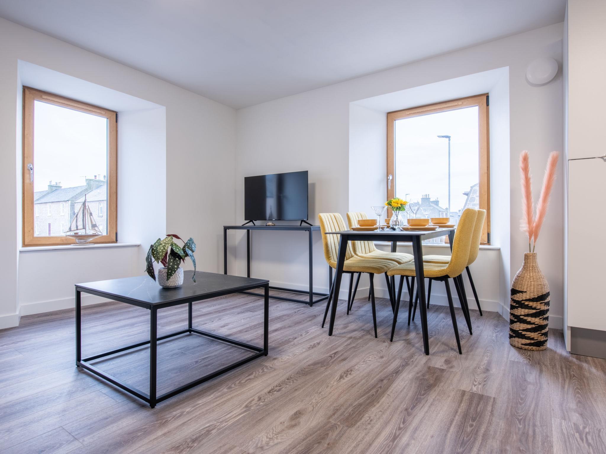 Apartment block "Harbour Nights Deluxe 7D", 2 storeys, semi-detached, renovated in 2023. 7 apartments in the residence. In the centre of Lossiemouth, in a quiet position in the residential district, excellent location: right in the centre but still quiet, 80 m from the sea, 450 m from the beach. Parking at the house. Shop, grocery 300 m, supermarket 180 m, restaurant, bar 90 m, bus stop "James Square" 270 m, railway station "Elgin" 10 km, sandy beach "Lossiemouth Beach" 350 m. Marina 90 m, golf course (18 hole) 100 m, tennis 50 m. Please note: Additional accommodations can be booked.