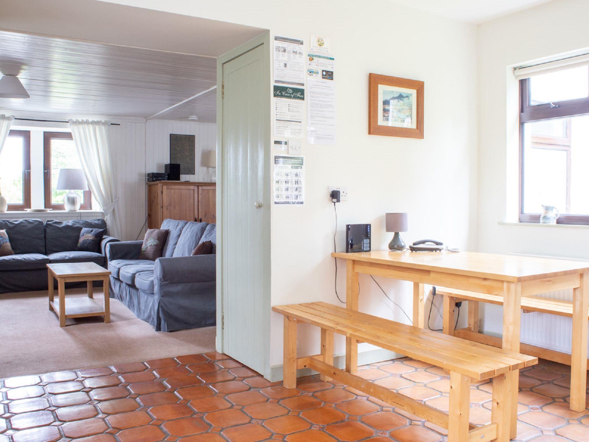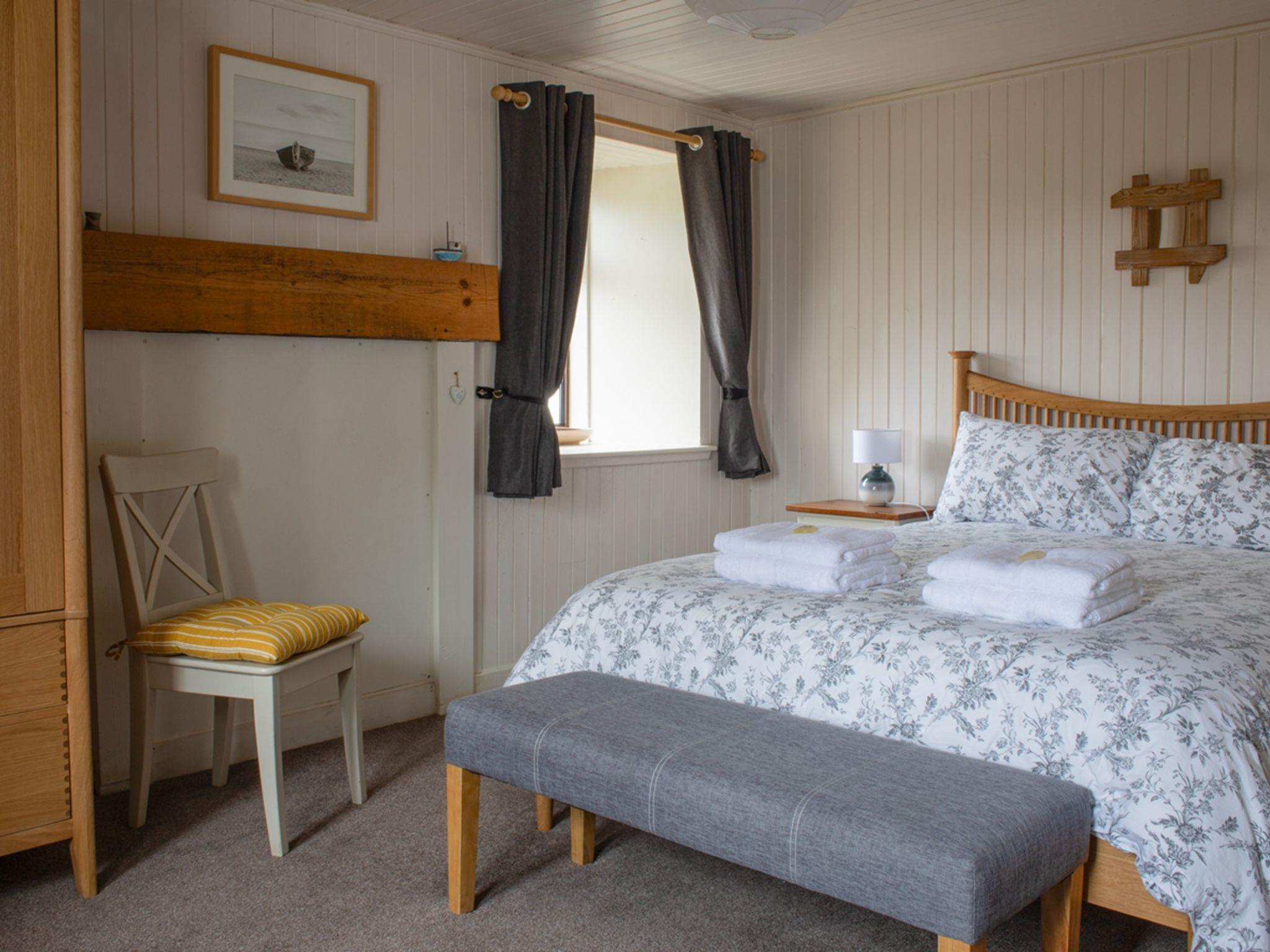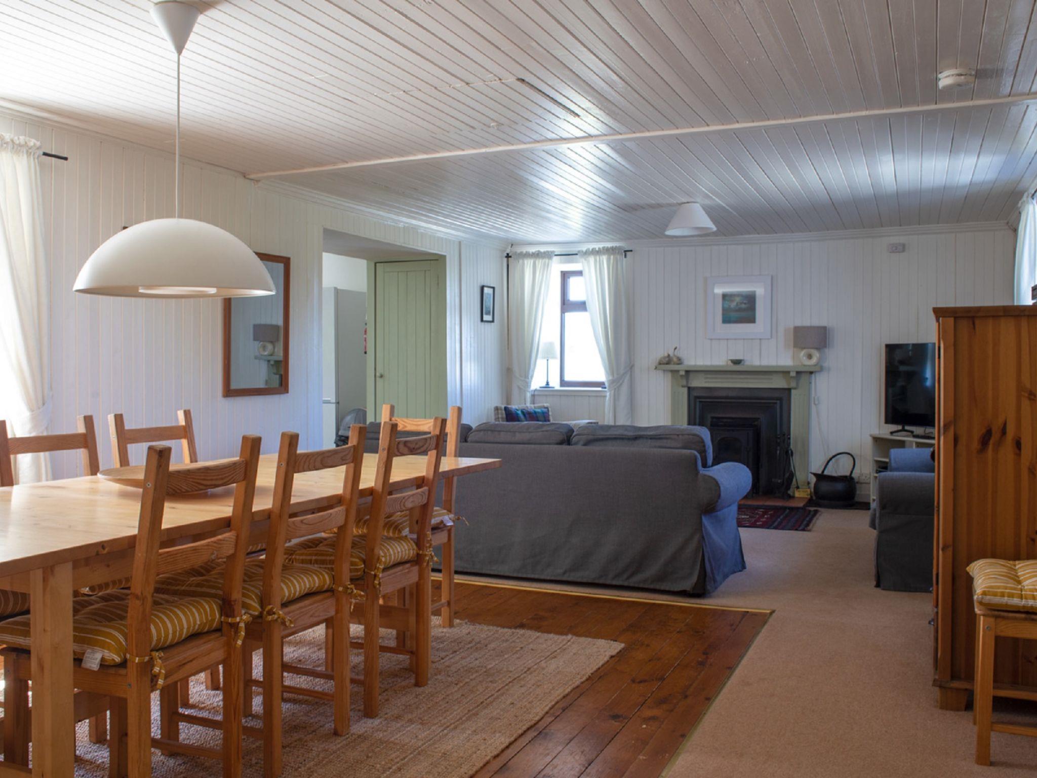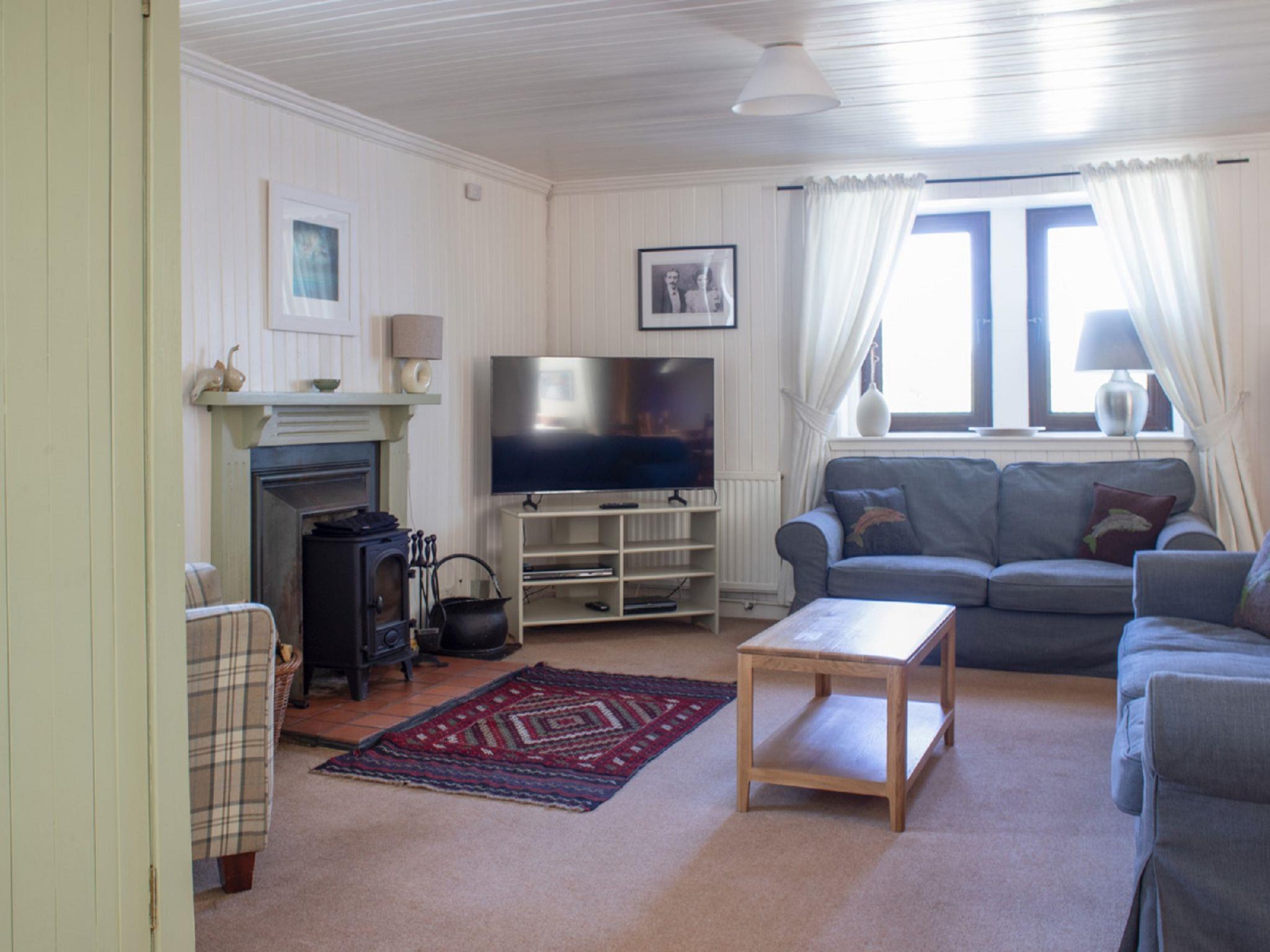 "Ploughman's Cottage", 4-room cottage 103 m2, on the ground floor. Modern and tasteful furnishings: entrance hall. Open living/dining room with dining table, TV and satellite TV (flat screen), radio, CD-player, DVD and wood-burning stove. 1 double bedroom with 1 double bed. 2 rooms, each room with 2 beds. Open kitchen (4 hot plates, oven, dishwasher, microwave, freezer) with small dining table. Sep. WC, bath/shower/WC. Heating. Small terrace, garden. Terrace furniture. Very beautiful view of the sea and the countryside. Facilities: washing machine, dryer, children's high chair, baby cot for up to 2 year olds, hair dryer. Internet (WiFi, free). Parking (2 cars) at the house. Please note: suitable for families. Non-smoking house. Maximum 1 pet/ dog allowed. TV only EN. Please note: the driveway is shared with Finnan's Byre.