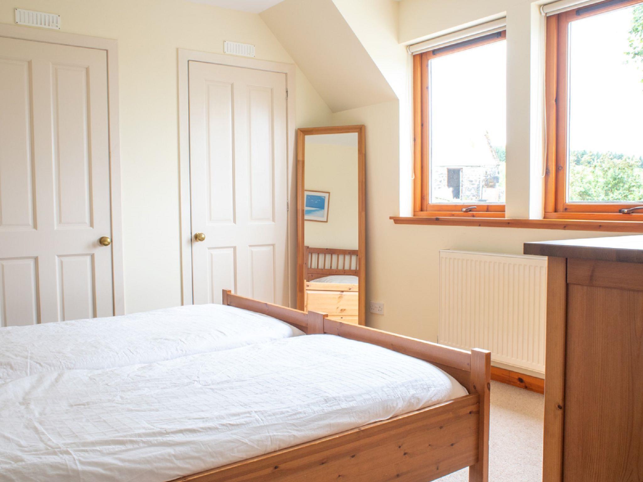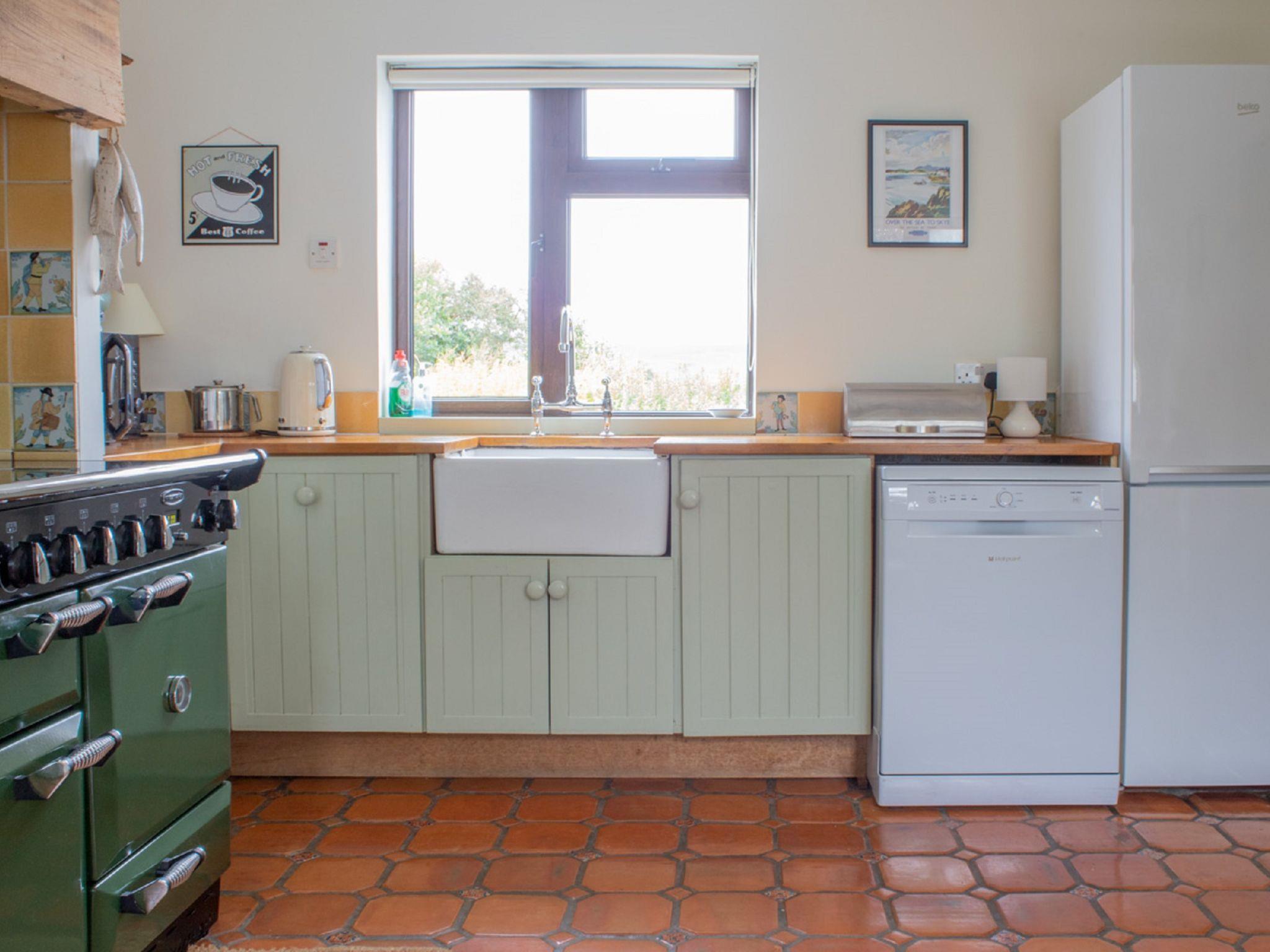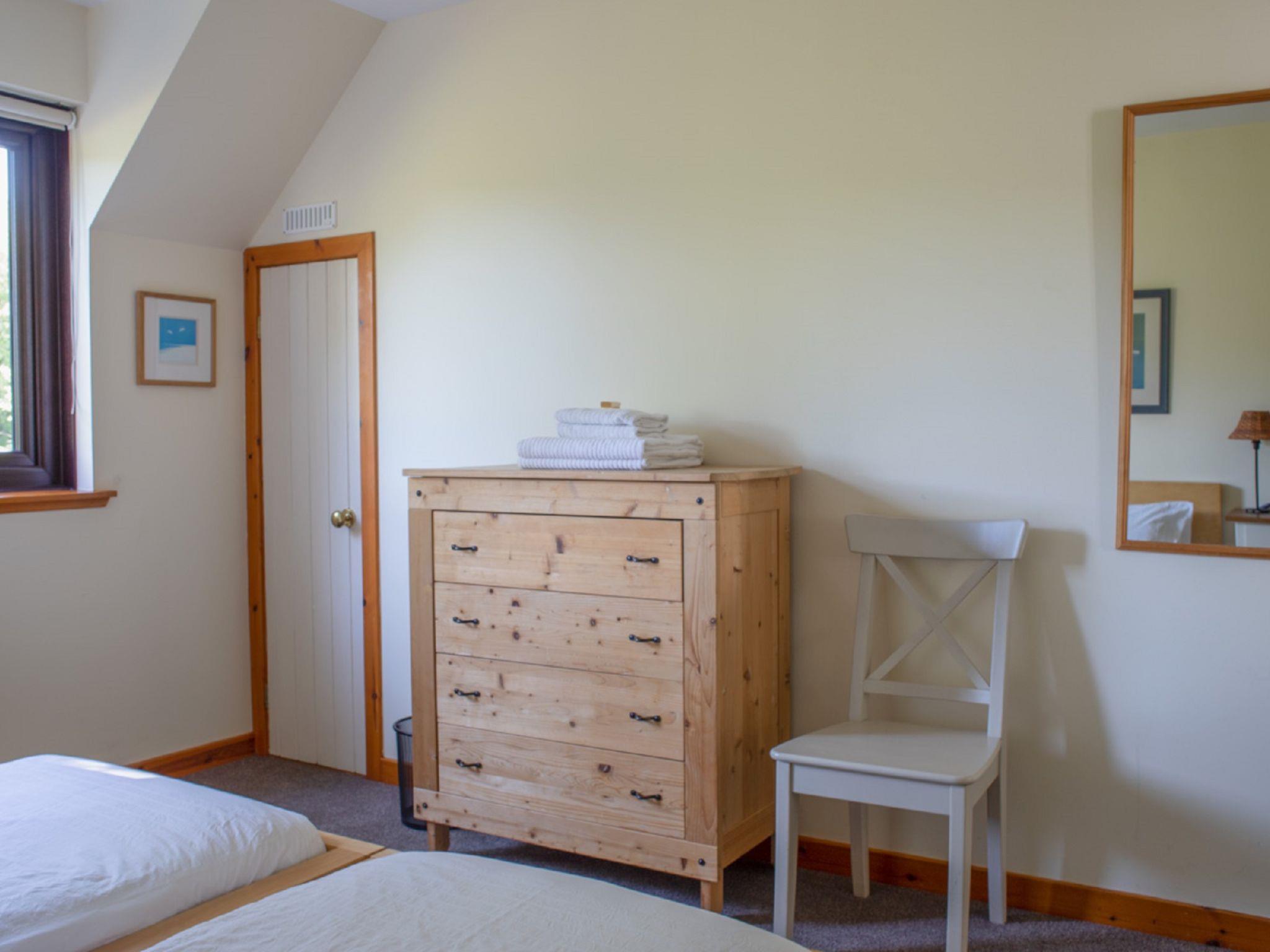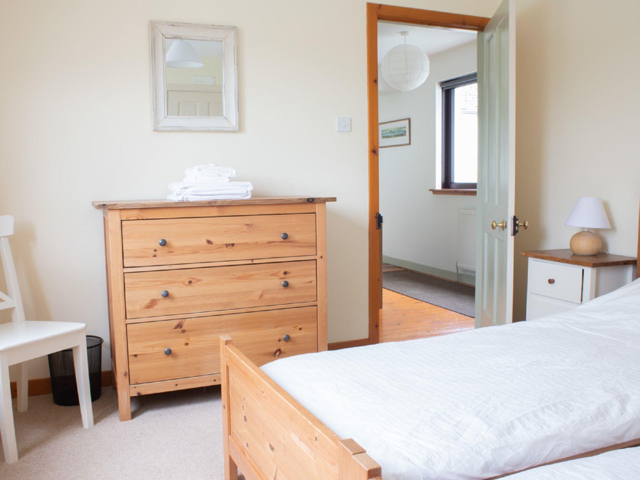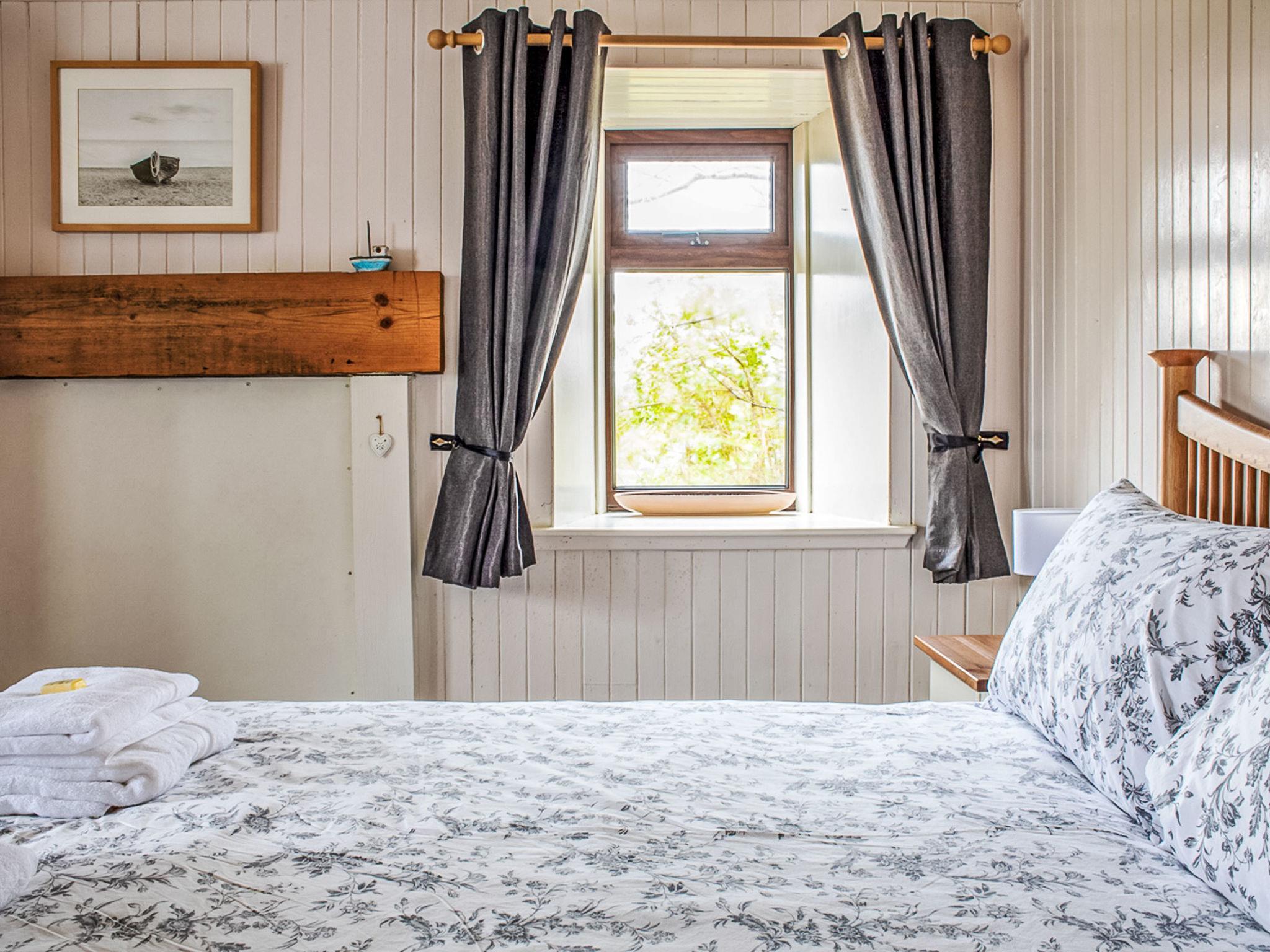 "Ploughman's Cottage", 4-room cottage 103 m2, on the ground floor. Modern and tasteful furnishings: entrance hall. Open living/dining room with dining table, TV and satellite TV (flat screen), radio, CD-player, DVD and wood-burning stove. 1 double bedroom with 1 double bed. 2 rooms, each room with 2 beds. Open kitchen (4 hot plates, oven, dishwasher, microwave, freezer) with small dining table. Sep. WC, bath/shower/WC. Heating. Small terrace, garden. Terrace furniture. Very beautiful view of the sea and the countryside. Facilities: washing machine, dryer, children's high chair, baby cot for up to 2 year olds, hair dryer. Internet (WiFi, free). Parking (2 cars) at the house. Please note: suitable for families. Non-smoking house. Maximum 1 pet/ dog allowed. TV only EN. Please note: the driveway is shared with Finnan's Byre.