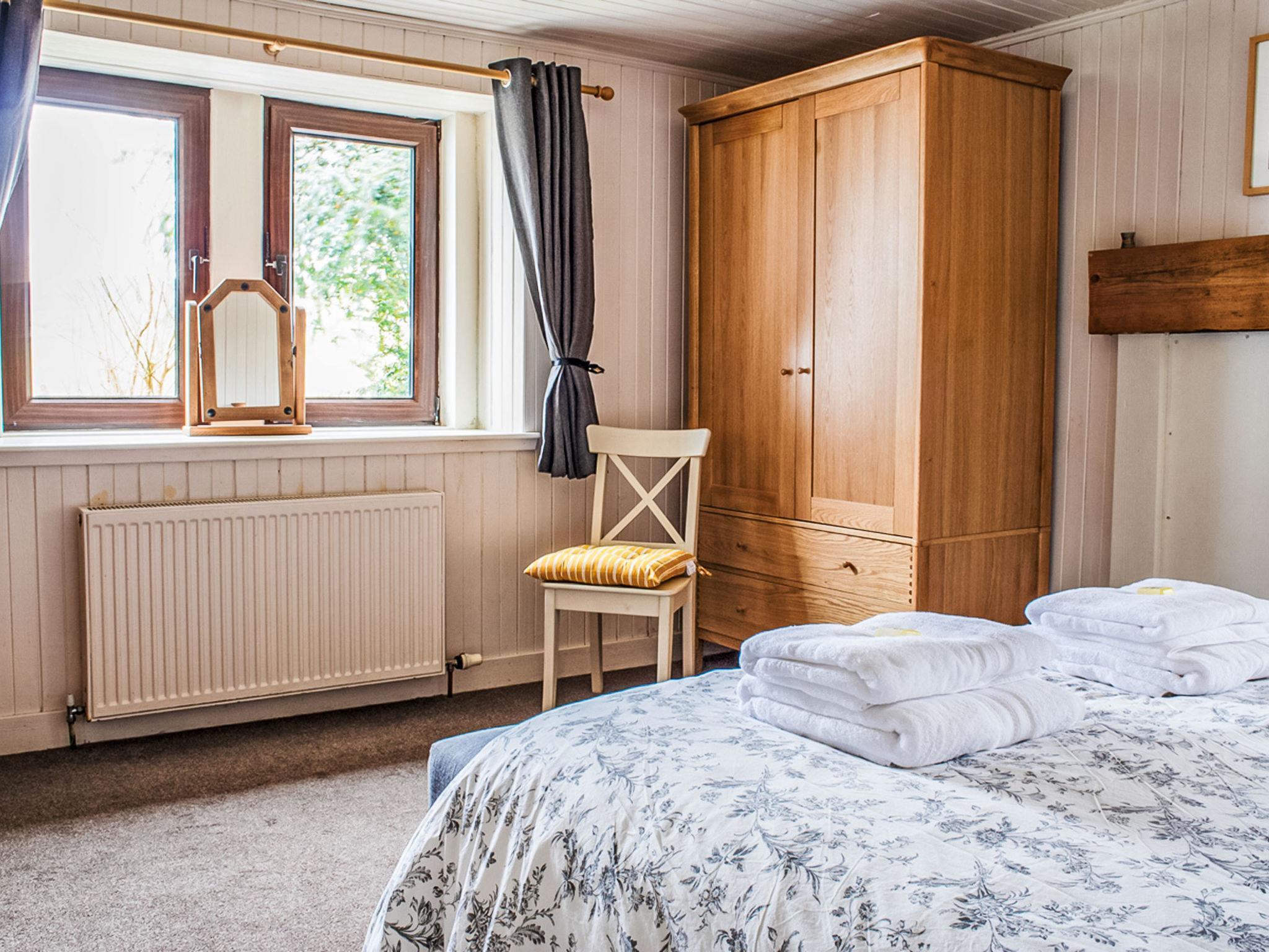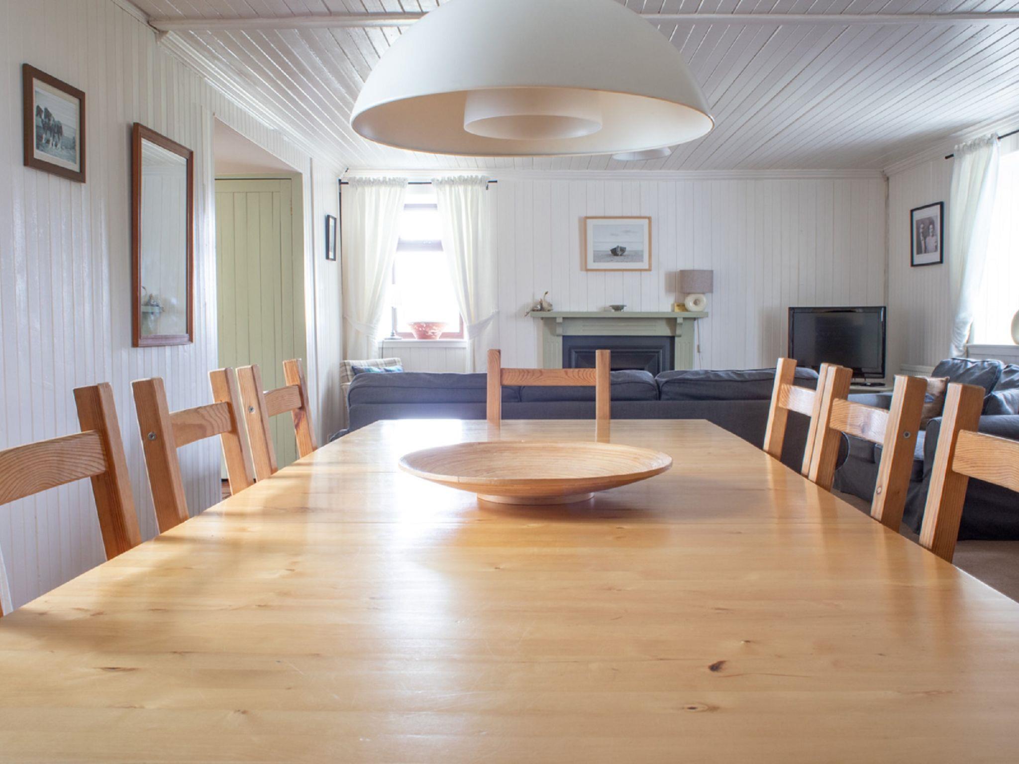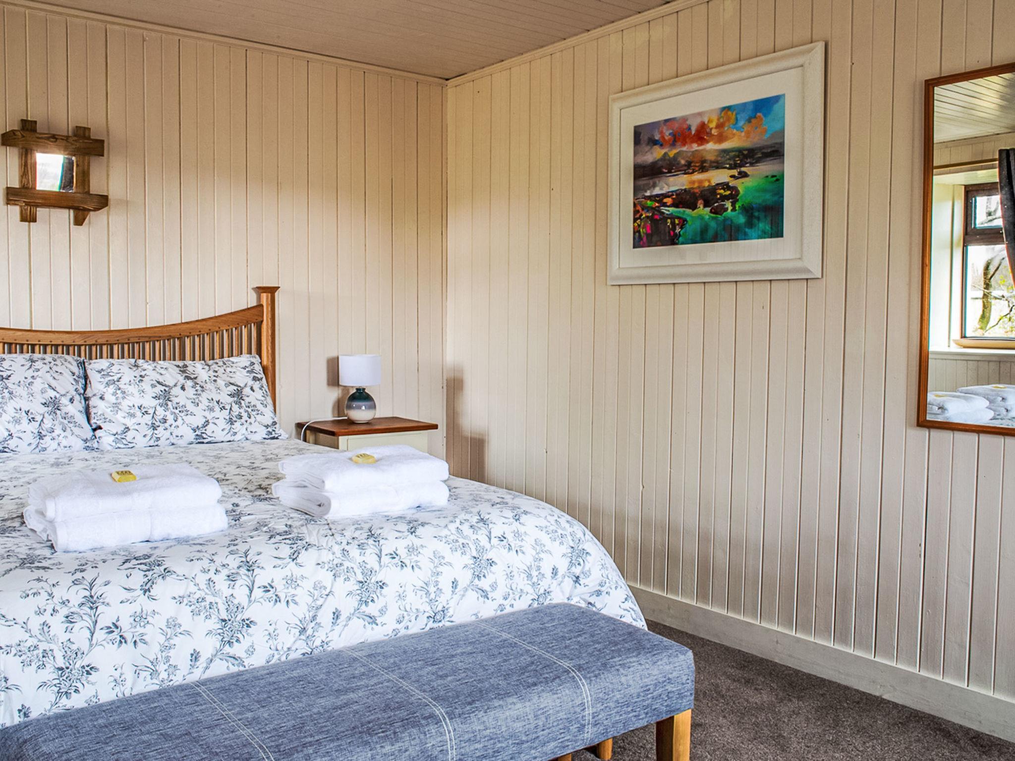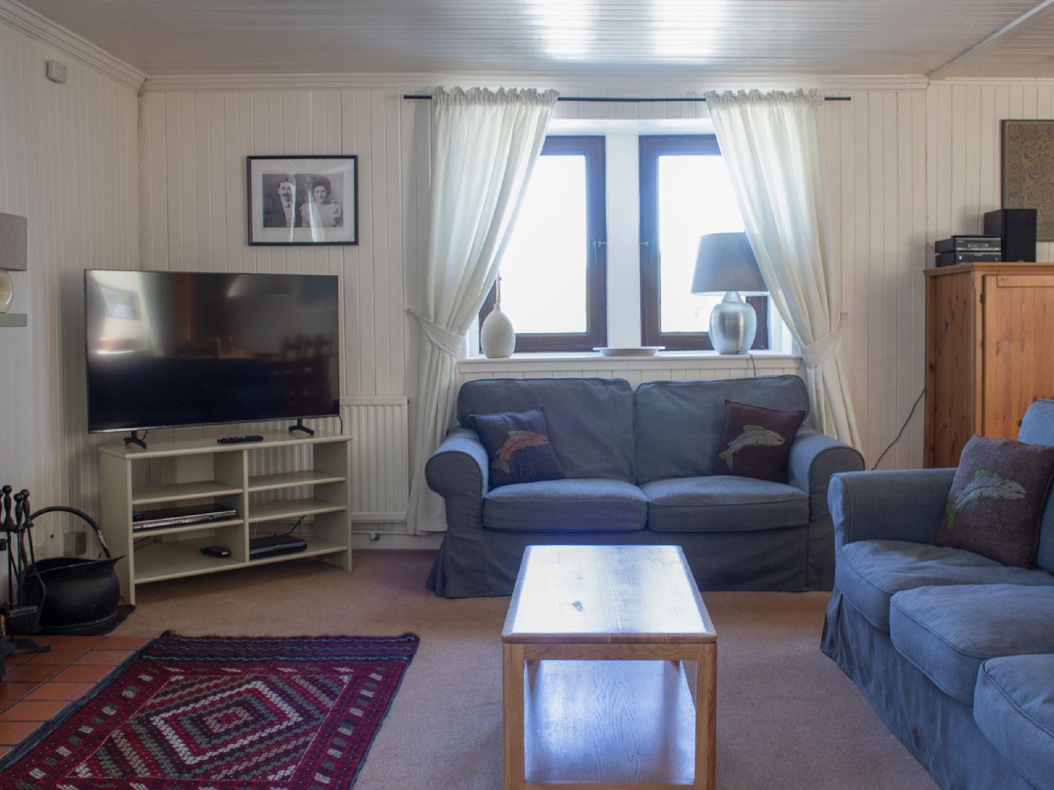 "Ploughman's Cottage", 4-room cottage 103 m2, on the ground floor. Modern and tasteful furnishings: entrance hall. Open living/dining room with dining table, TV and satellite TV (flat screen), radio, CD-player, DVD and wood-burning stove. 1 double bedroom with 1 double bed. 2 rooms, each room with 2 beds. Open kitchen (4 hot plates, oven, dishwasher, microwave, freezer) with small dining table. Sep. WC, bath/shower/WC. Heating. Small terrace, garden. Terrace furniture. Very beautiful view of the sea and the countryside. Facilities: washing machine, dryer, children's high chair, baby cot for up to 2 year olds, hair dryer. Internet (WiFi, free). Parking (2 cars) at the house. Please note: suitable for families. Non-smoking house. Maximum 1 pet/ dog allowed. TV only EN. Please note: the driveway is shared with Finnan's Byre.