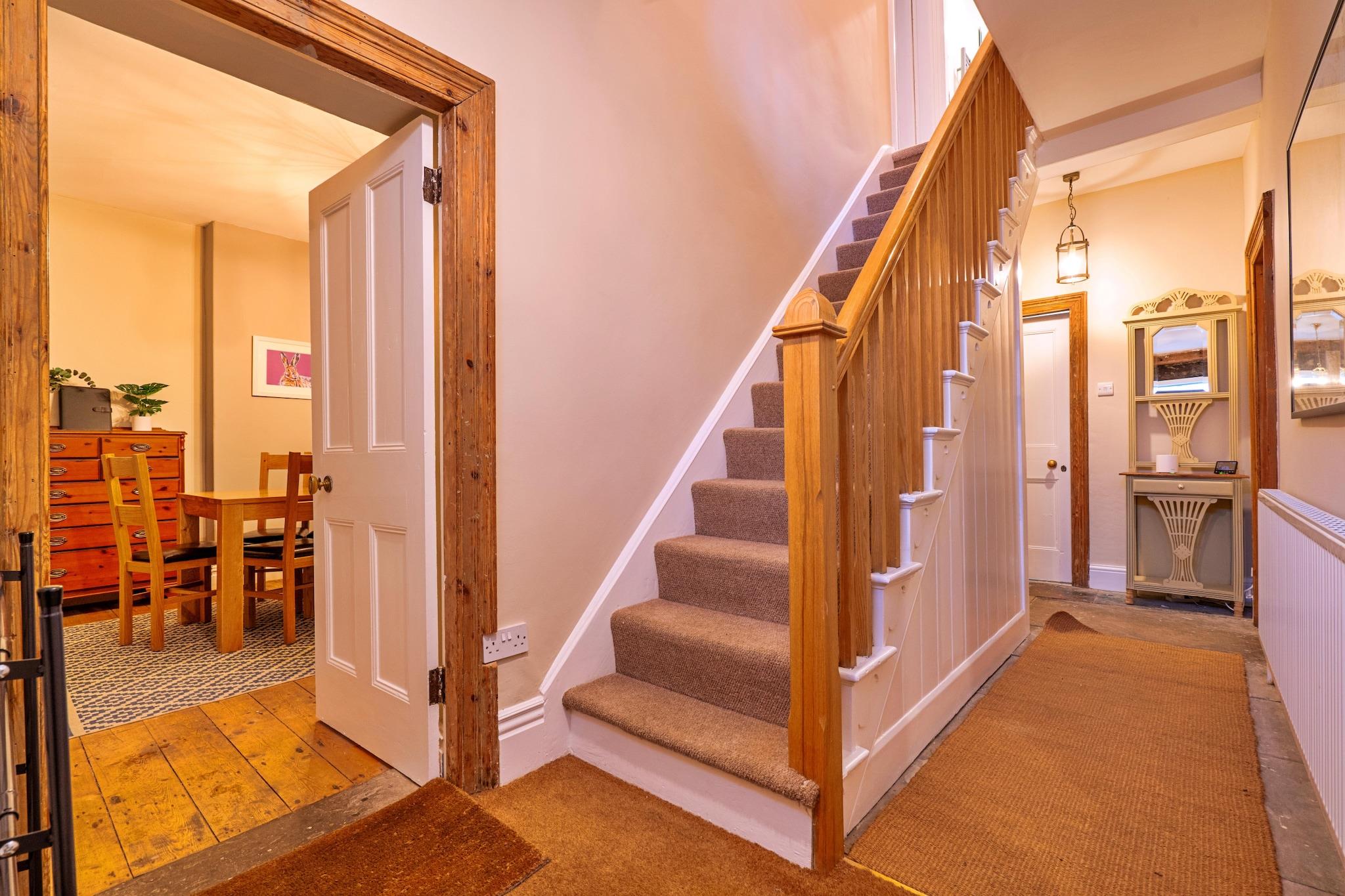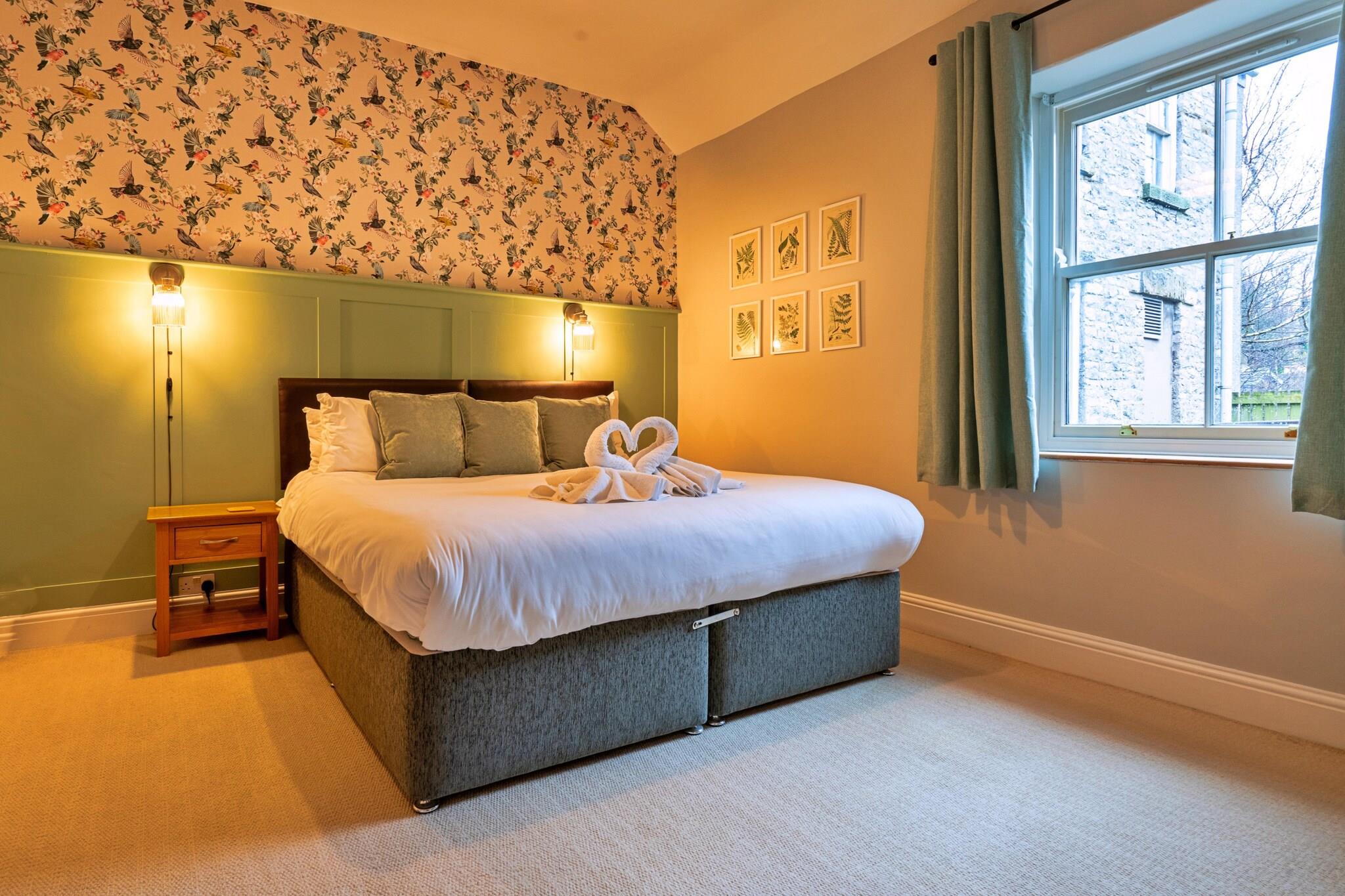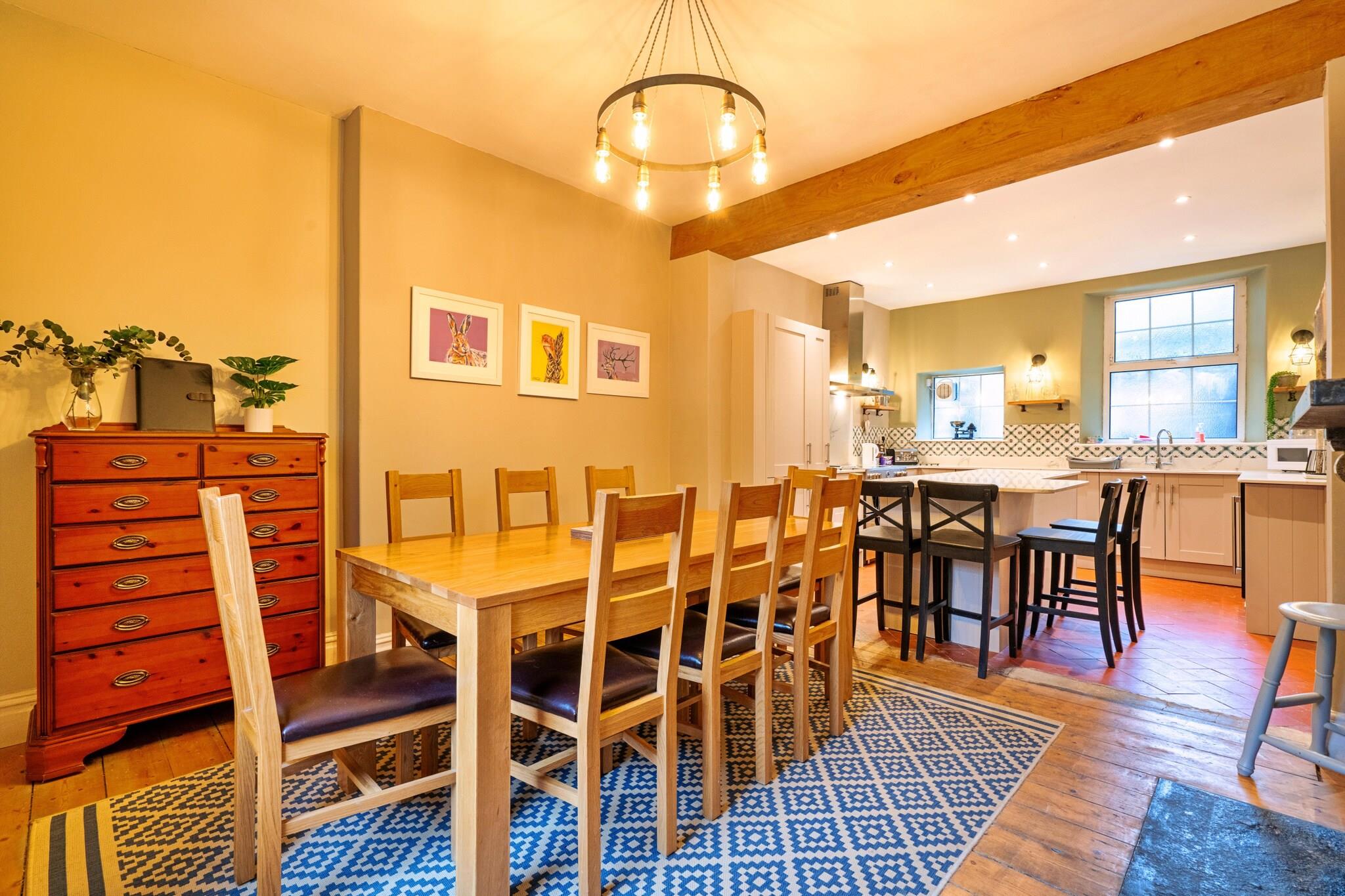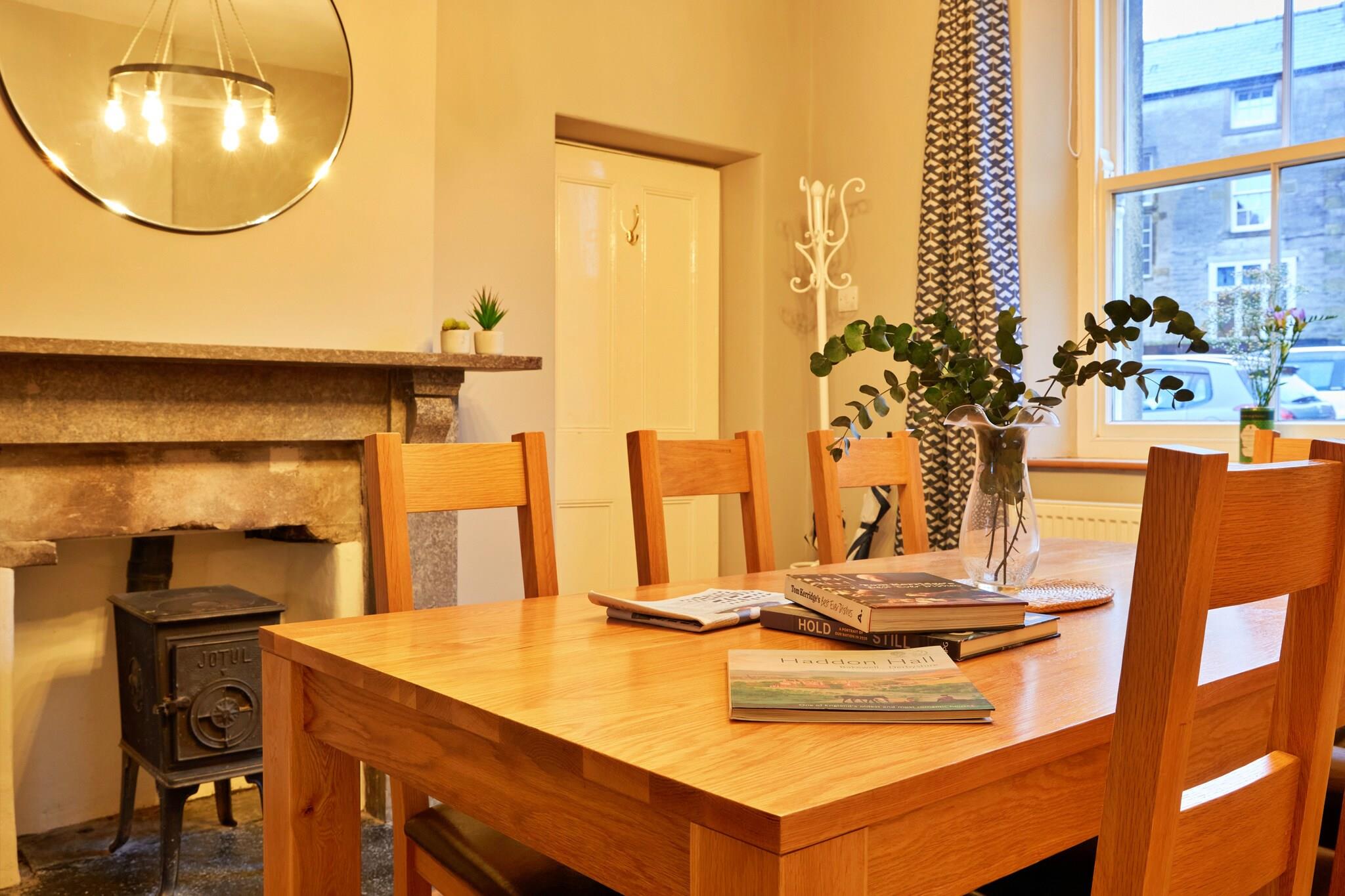 Beliggende i den pulserende landsby Tideswell i Peak District, er dette smukt renoverede store hus perfekt til familier eller grupper med plads til op til 8 gæster fordelt på fire rummelige soveværelser. Ejendommen tilbyder en perfekt base for at udforske de lokale faciliteter og det fantastiske omkringliggende landskab. Indvendigt har køkkenet og spisepladsen i åbent plan moderne marmor-arbejdsflader, en central ø og charmerende synlige murstensaccenter, der blander moderne komfort med rustik karakter. Det fuldt udstyrede køkken er ideelt til at tilberede måltider, mens nærliggende restauranter og takeaways tilbyder yderligere spisemuligheder. Stueetagen kan prale af en stor stue og et hyggeligt område med et tv, brændeovn og rigelig med komfortable siddepladser, hvilket skaber et hyggeligt rum til afslapning, spil og familiebinding. Et badeværelse med bruser og toilet er bekvemt placeret på dette niveau. Ovenpå inkluderer de fire soveværelser et fleksibelt queensize-værelse (som kan laves om til to singler efter anmodning), et kingsize-værelse, en dobbeltseng og en tvilling, der kan rumme forskellige sovearrangementer for gæster. Udenfor kan gæsterne nyde den lokale scene, hvor The Star Inn tilbyder ægte ale og solide måltider, og Merchants Yard serverer lokale retter - reservationer anbefales på grund af dets popularitet. De omkringliggende byer Buxton, Bakewell og Matlock er let tilgængelige, og byder på attraktioner som Buxtons operahus, Bakewells berømte tærter og Matlock's Baths. Det berømte Chatsworth House ligger også i nærheden. Friluftsentusiaster kan drage fordel af Peak Districts vandre- og cykelruter, uanset om de krydser Mam Tor eller udforsker Deep Dale Nature Reserve. Ejendommen er kæledyrsvenlig, med parkering på gaden og cykelopbevaring til rådighed. Bemærk venligst, at rygning ikke er tilladt.