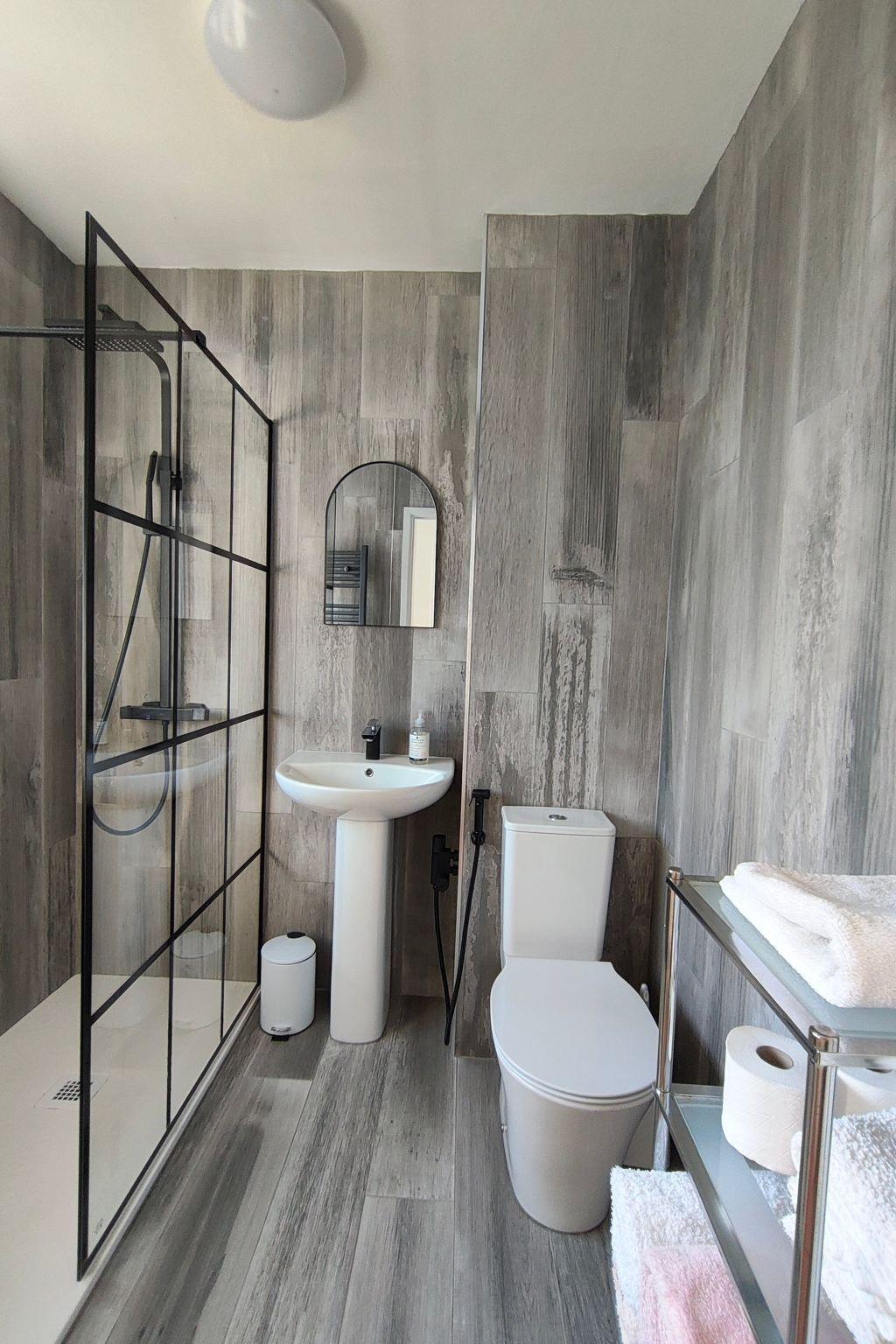 There is one fully refurbished master bathroom with a luxurious walk-in rainfall shower, high-end fittings, and a hygienic handheld douche. There is also a separate guest WC which includes a washbasin, toilet and a second douche next to the third bedroom.