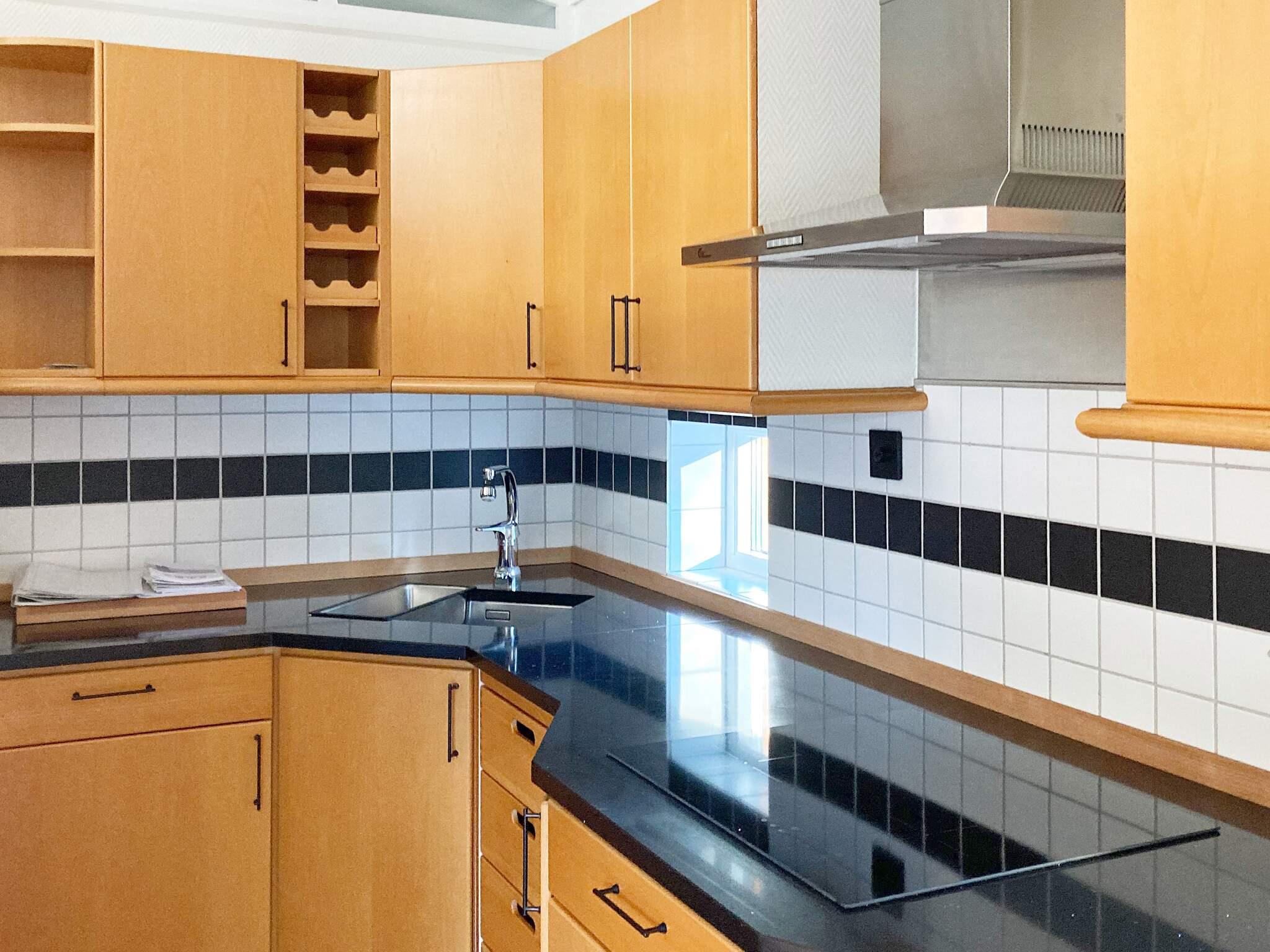 Køkken: Høj stol, el-komfur, ovn, køle-frys, mikroovn, kaffemaskine, opvaskemask.