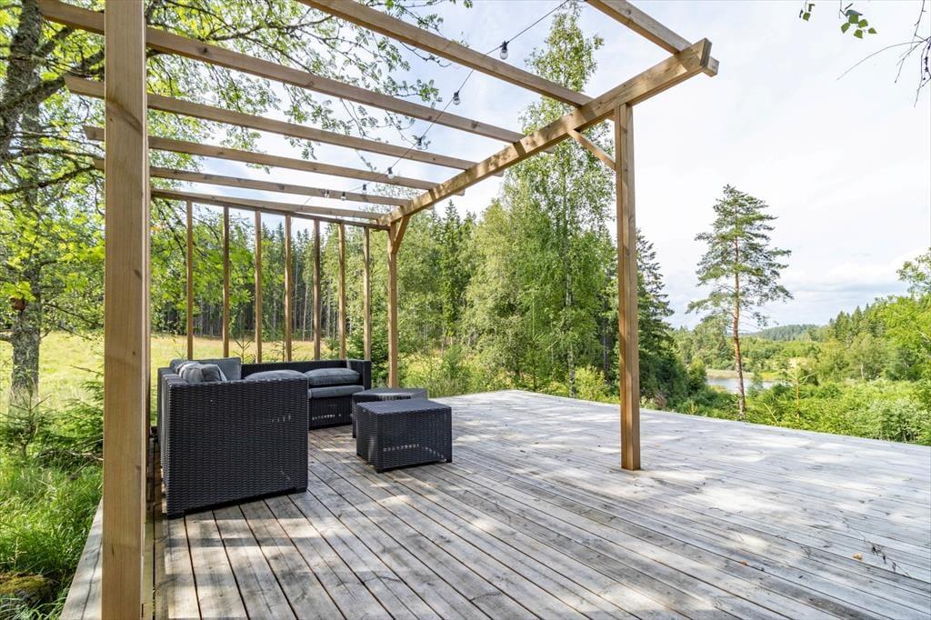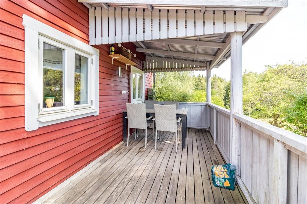Feriehuset Ögårdsbacken ligger idyllisk på en grund på ca. 4 hektar i absolut afsondret beliggenhed nær Töcksfors i Värmland-regionen, ikke langt fra grænsen til Norge. Kun ca. 250 m væk finder du den nordlige del af søen Foxen med privat badestrand og en lille bro – perfekt til afslappende timer ved vandet. Vejen til søen går gennem et lille skovområde med smalle, delvist stejle stier, så børn bør ikke færdes uden opsyn, og ældre gæster bør gå forsigtigt.