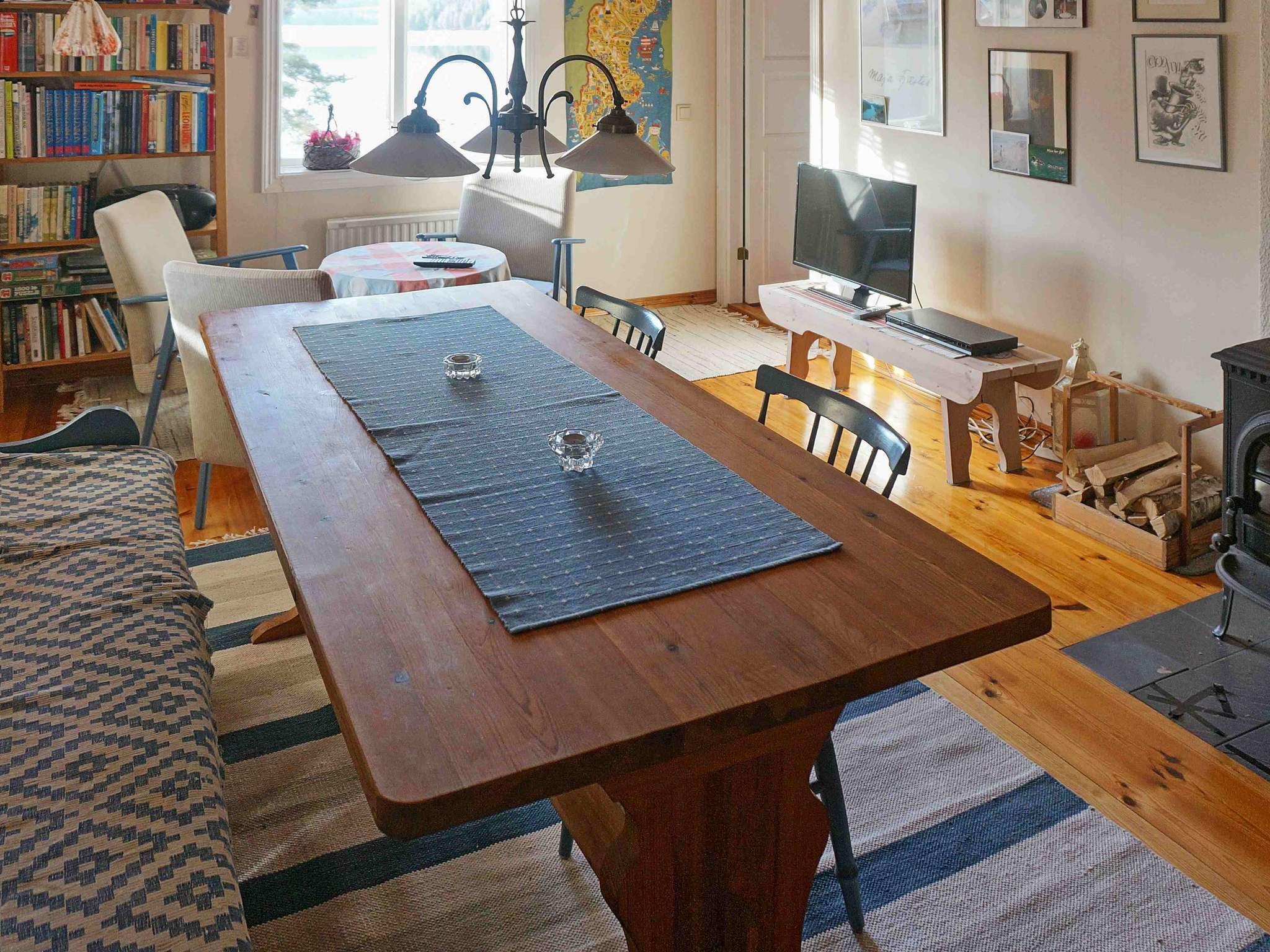 Stugan har ett öppet kök med matplats och en tydlig avgränsning till vardagsrum.