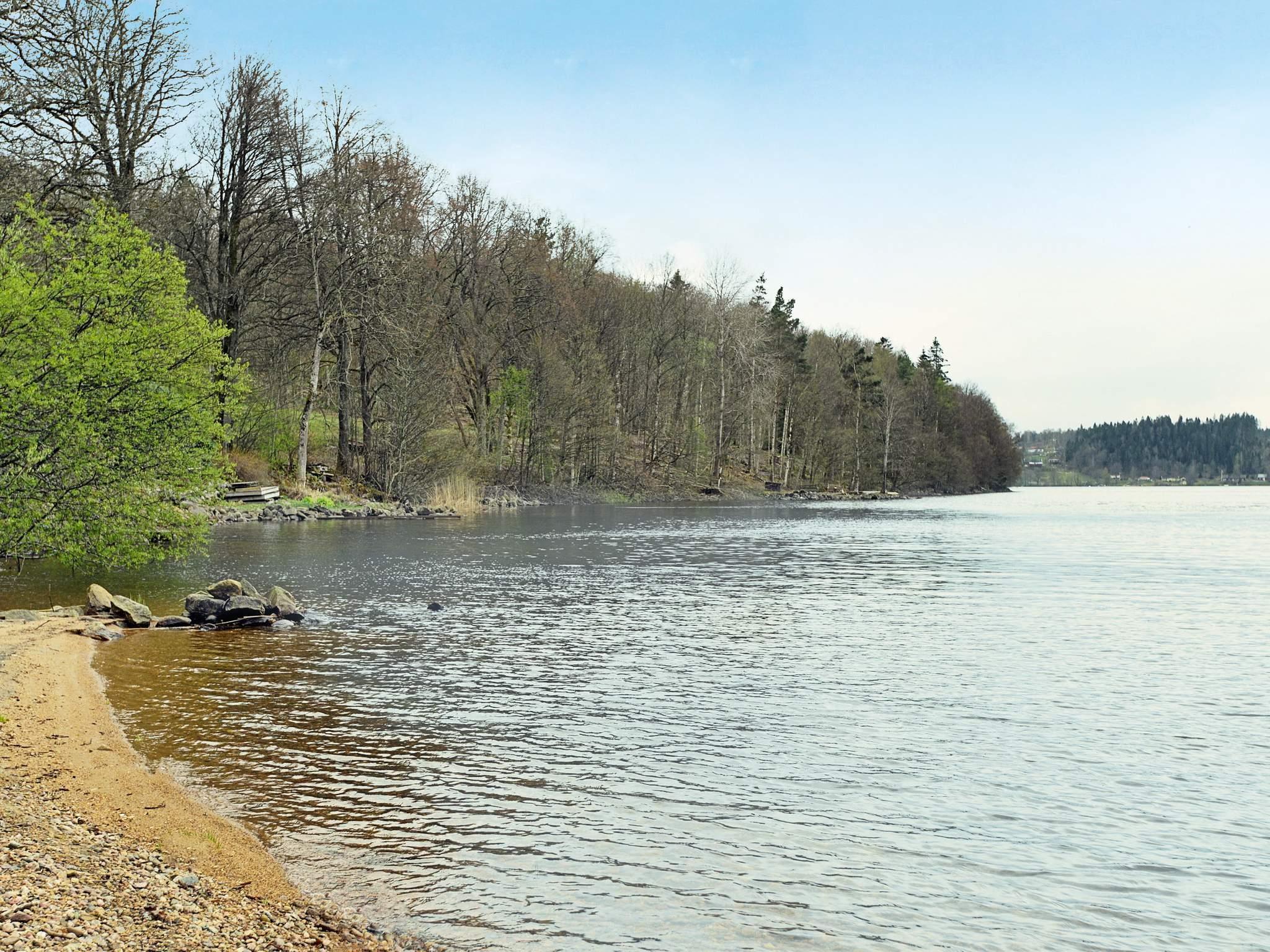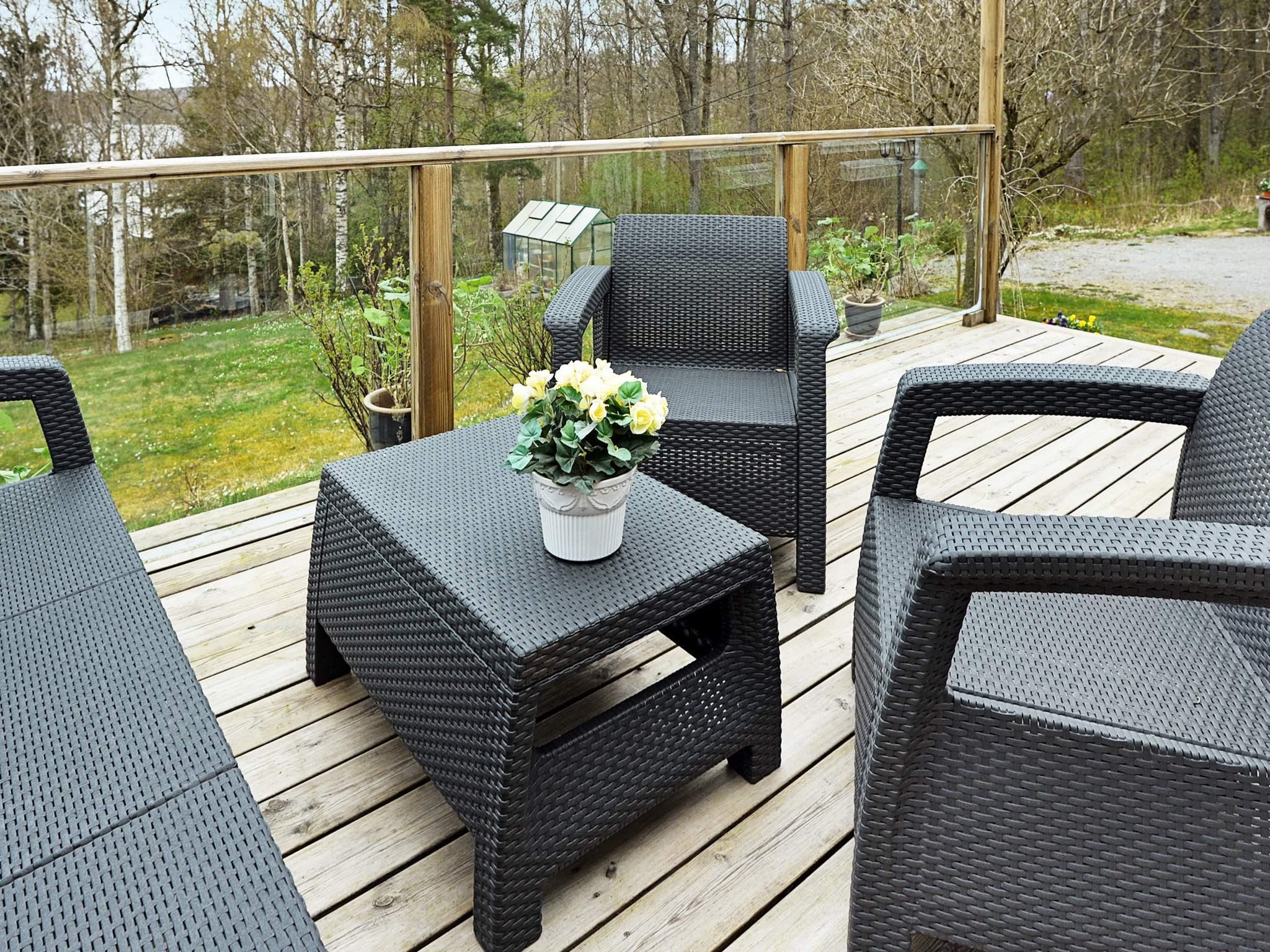 Uteplats finns även på andra sidan av huset så att man kan välja sol eller skugga efter behag. Med öppen utsikt över sjön Stora Färgens rena vatten, (kommunen hämtar sitt dricksvatten här), och med en bäckravin på tomten ligger denna pärla fint för den som vill njuta av de ljumma sommarkvällarna från altanen.