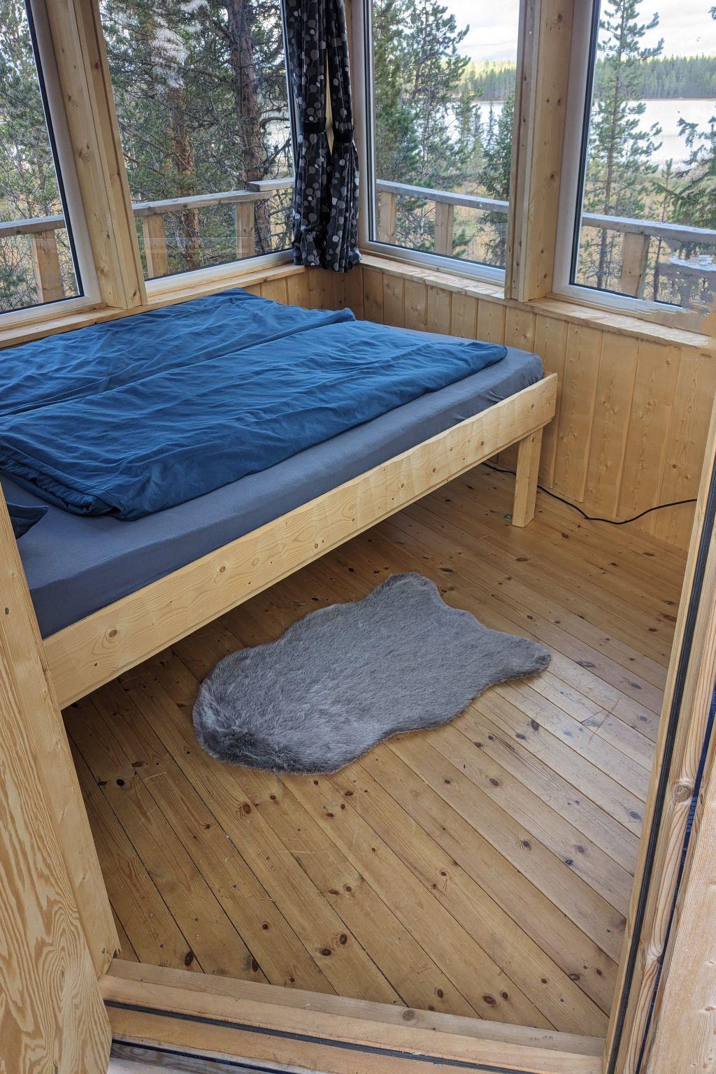 The "Aurora Lodge" tree house is practically and cosily furnished to make your stay as comfortable as possible. In addition to a cosy bedroom with a 140 cm wide double bed, the accommodation has a small bathroom equipped with a camping toilet and hand basin. Here you will find everything you need for a comfortable stay in the middle of the forest.