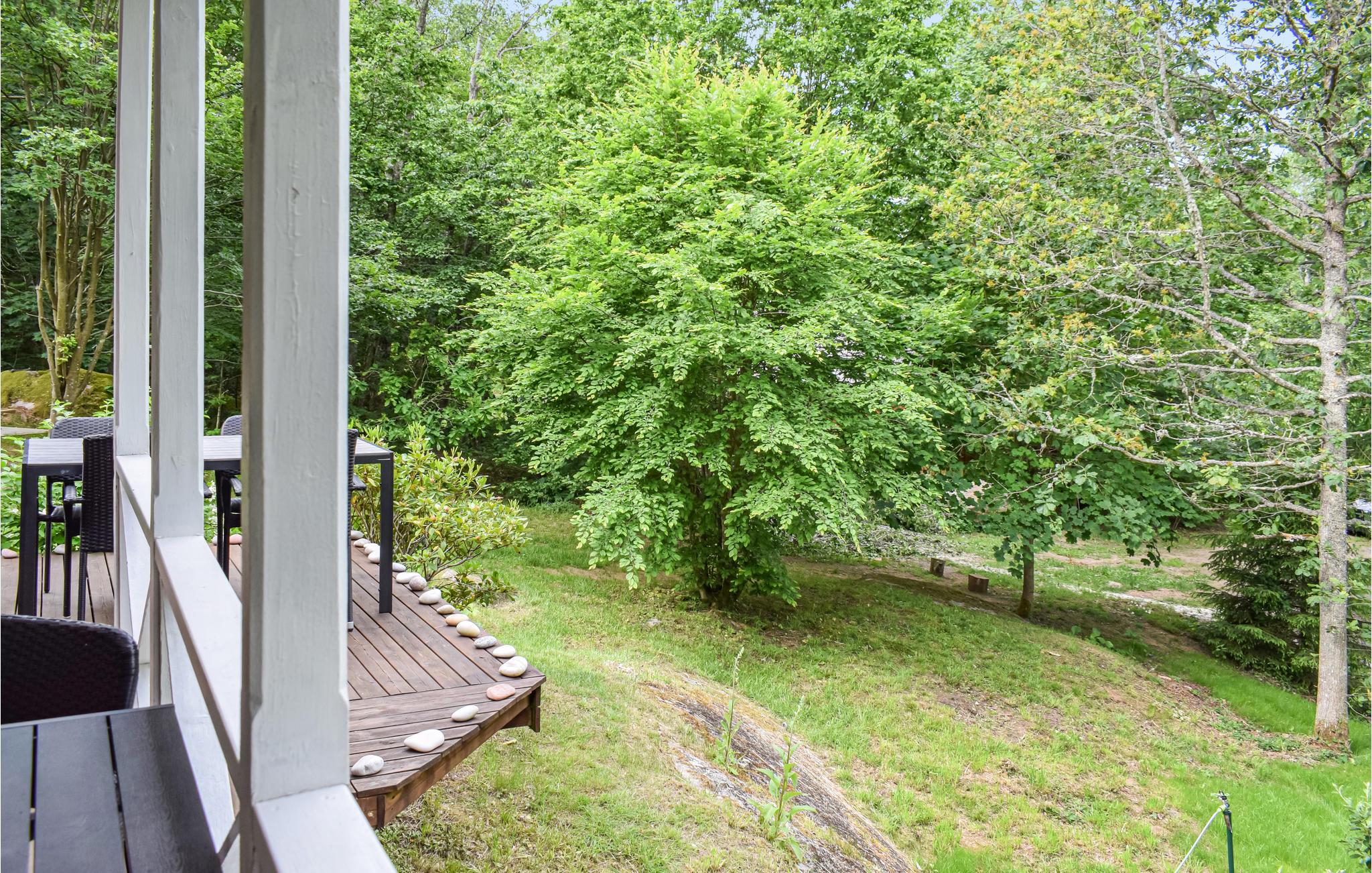 Huset har en åben have og ligger på en bakke, og foran finder du en stor dejlig veranda under taget. Her er højt til loftet i store dele af huset. Nederst finder du en stor og åben stue med plads til at mange kan både socialisere og sidde og spise. Nedenunder er der også et køkken samt et badeværelse og et soveværelse. Midt i stuen går trappen lige op i luften og fører dig til den åbne hems i venstre side og hall med soveværelse og badeværelse på højre side. I den store stue på underetagen er der også en pejs.