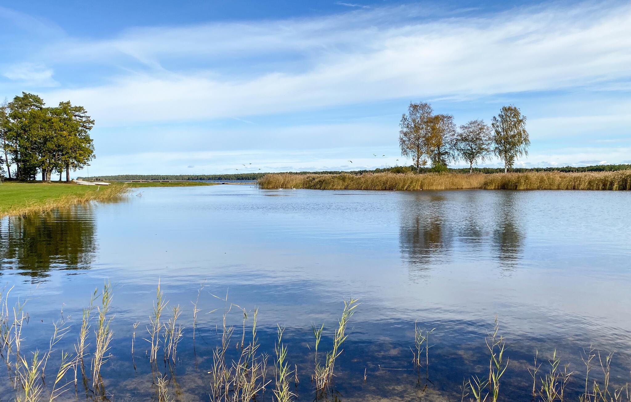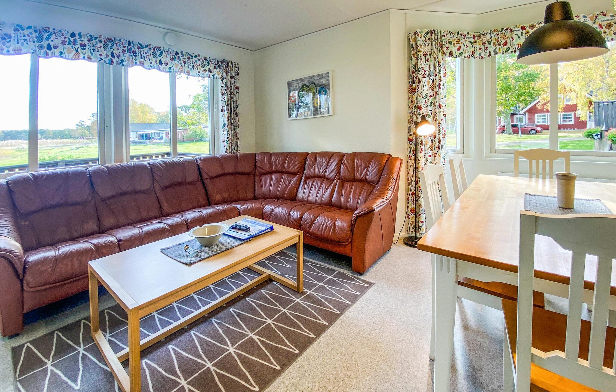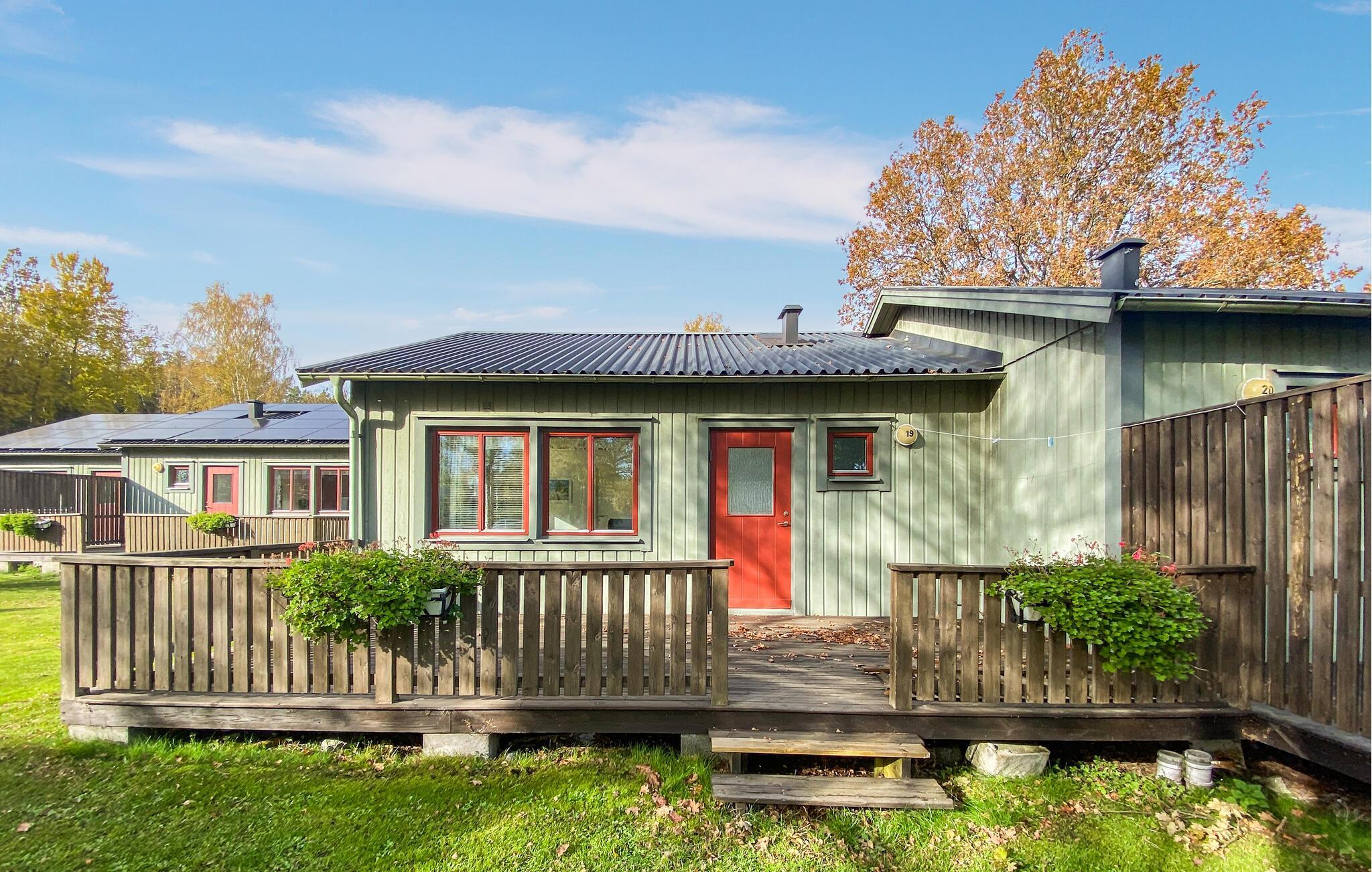 Tilbring en afslappende ferie i dette komfortable feriehus ved havet. Dette velholdte feriehus byder jer velkommen kun få skridt fra en smuk sandstrand med en badebro og inviterer jer til at nyde en afslappende ferie i sit lyse og hyggelige interiør. Tilbered lækre måltider i det åbne køkken og planlæg jeres aktiviteter ved det indbydende spisebord. Efter en begivenhedsrig dag i naturen kan I krybe sammen i sofaen til en sjov spilleaften eller en stille bog. Gå en tur ned til stranden for en forfriskende dukkert og nyd en god morgenmad på verandaen om morgenen. Lad jeres børn få nye venner, mens de leger på den rummelige, fælles grund, og nyd hyggelige samtaler omkring grillen. Prøv lykken med fiskeri, tag lange vandreture og pluk blåbær om efteråret. Gå en tur til det nærliggende Långe Erik fyr og udforsk den populære Trollskov.
