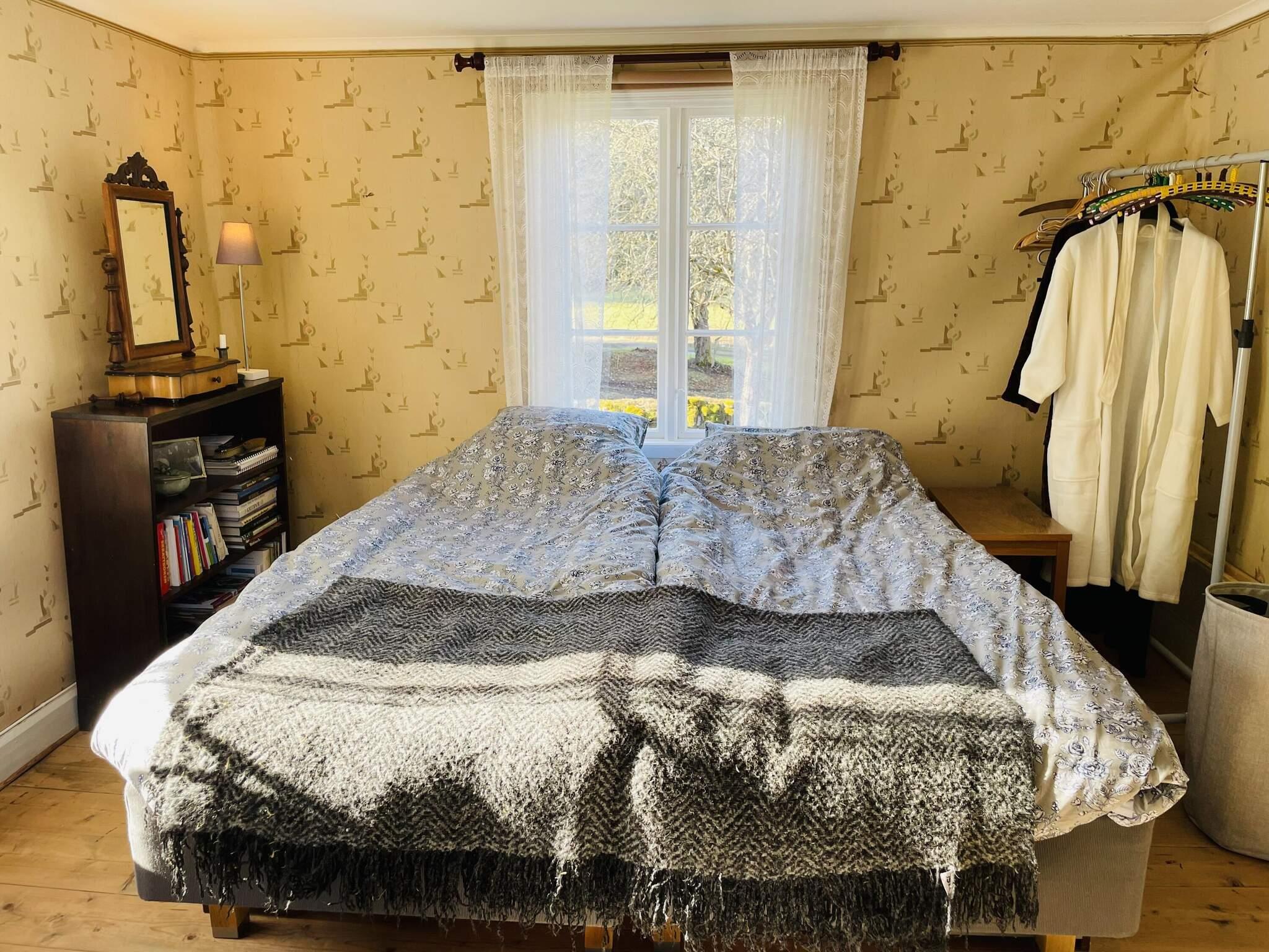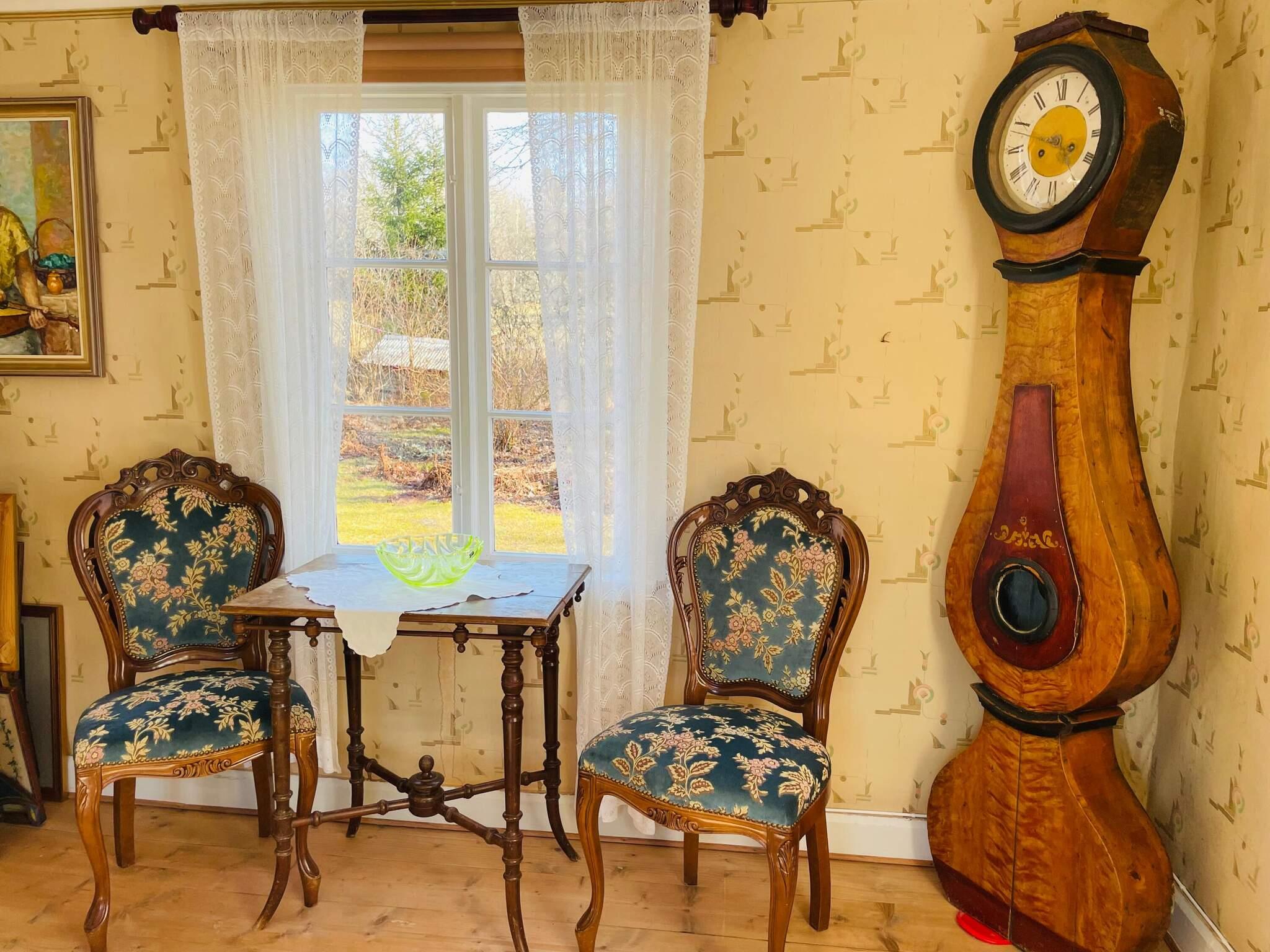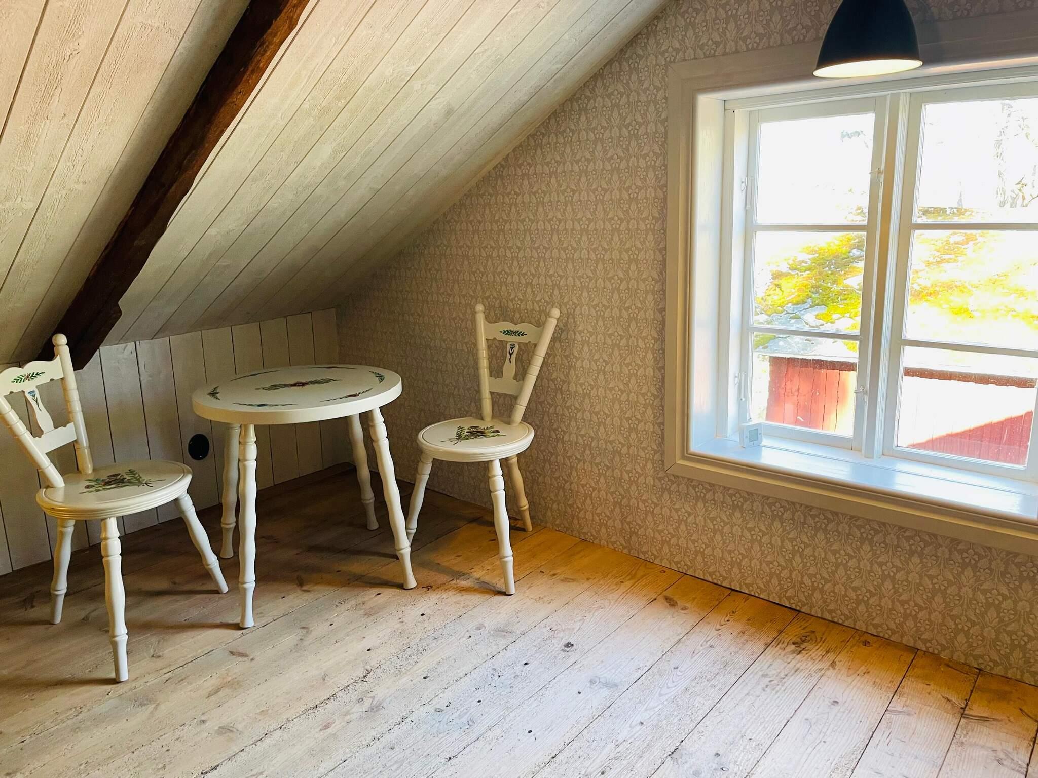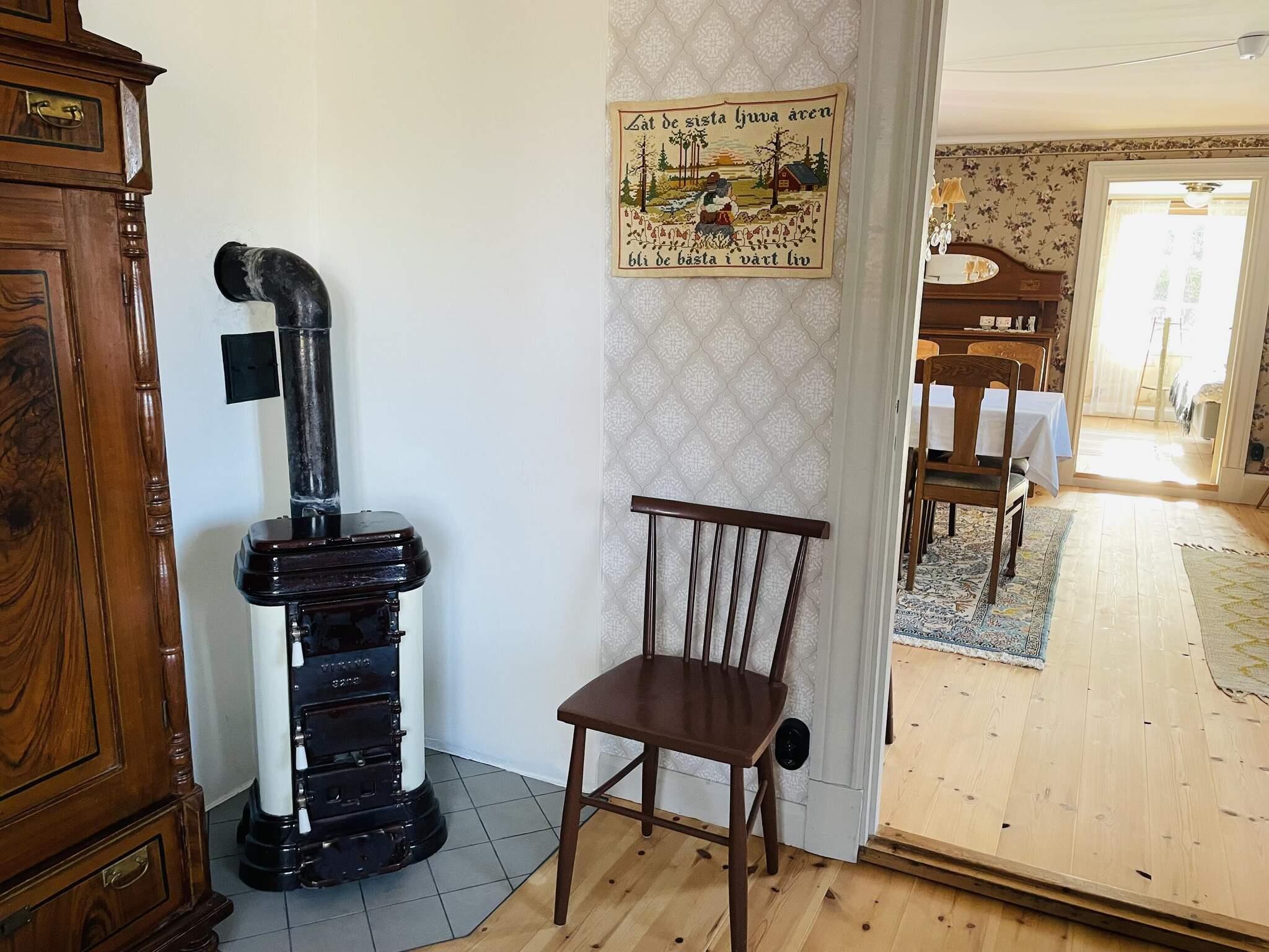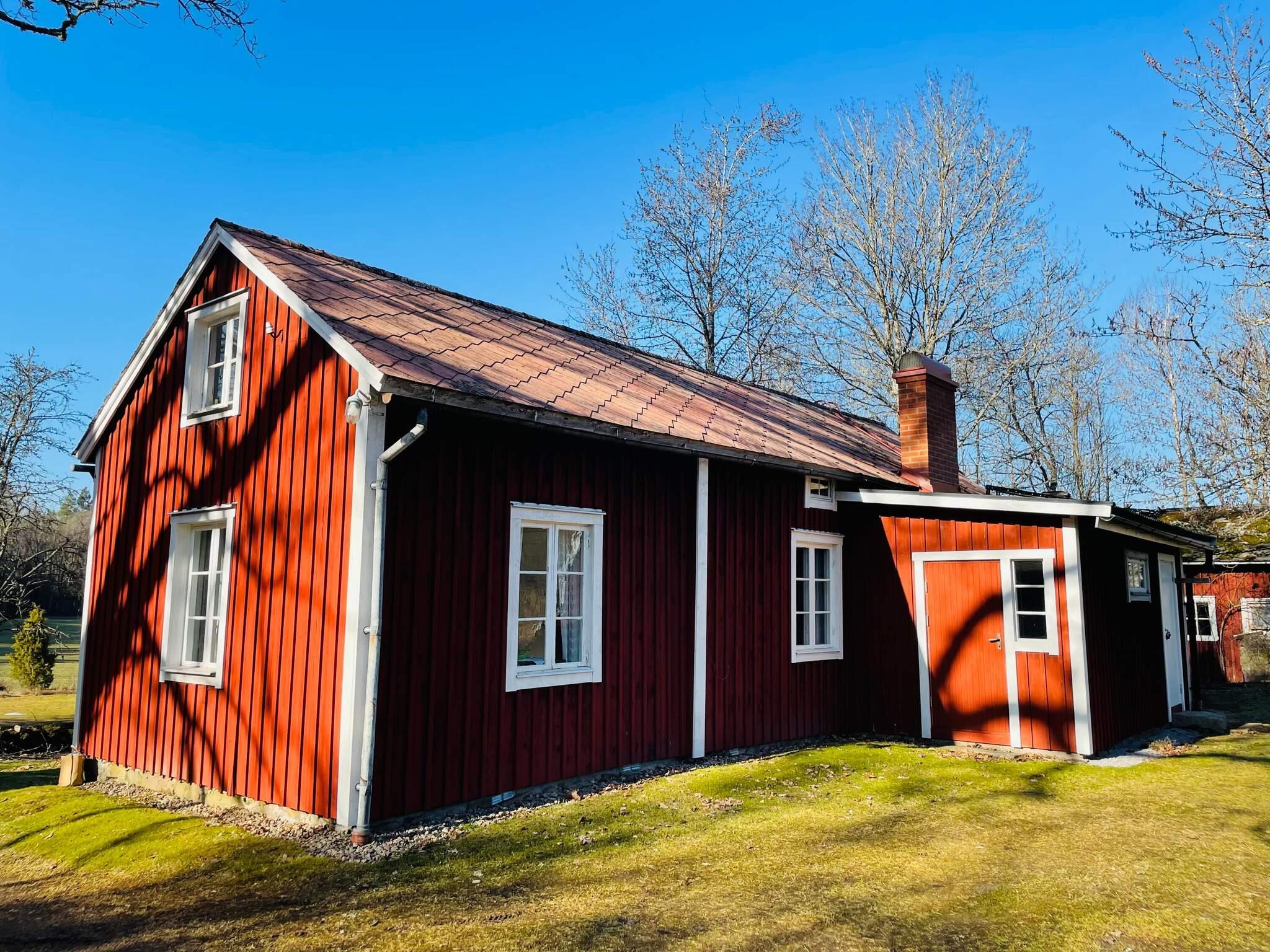 Invändigt möts du av en varm och inbjudande atmosfär. Köket med alla möjligheter till självhushåll har även en kamin som kan eldas i för extra värme och trivsel, se användnings beskrivning på plats. Allrum med plats för alla runt gediget matsalsbord och trivsam soffgrupp för gemensamma stunder. Den bästa utsikten över trädgård, åkrar och skog får man från verandan på husets framsida. Ett sovrum med dubbelsäng på nedervåningen. En brant, smal trappa leder dig upp till övervåningen med fler bäddar att välja på. Med synliga träbjälkar och trägolv i större delen av ovanvåningen finns gott om plats för lek, spel och avkoppling. I mittenrummet finns både dubbelsäng och två enkelsängar att bädda för natten men också en myshörna för avkoppling övrig tid. Vill man hellre dela upp bäddarna så finns det ytterligare ett sovrum med dubbelsäng att tillgå. Huset är dock anpassat för max 6 gäster samtidigt.