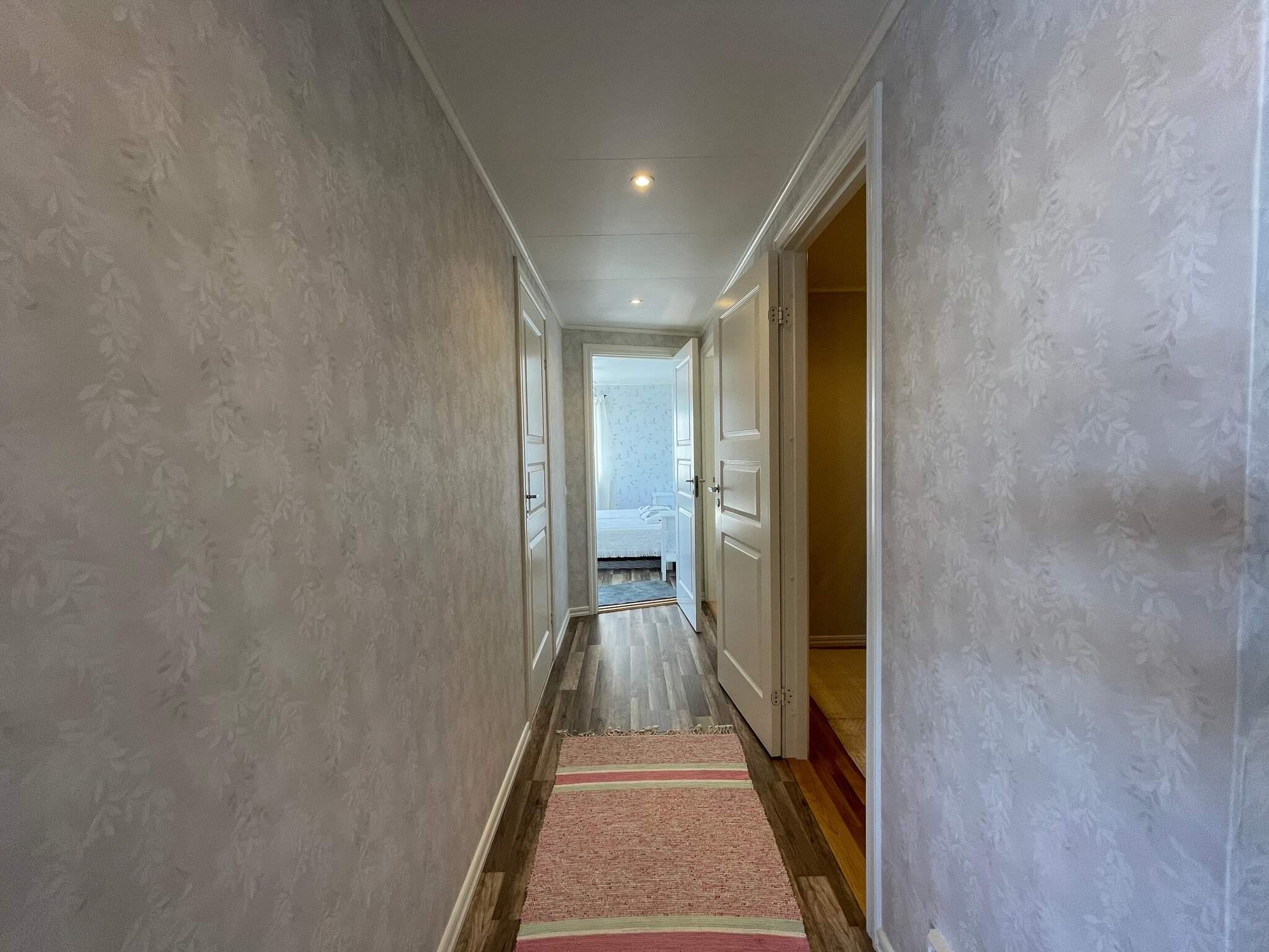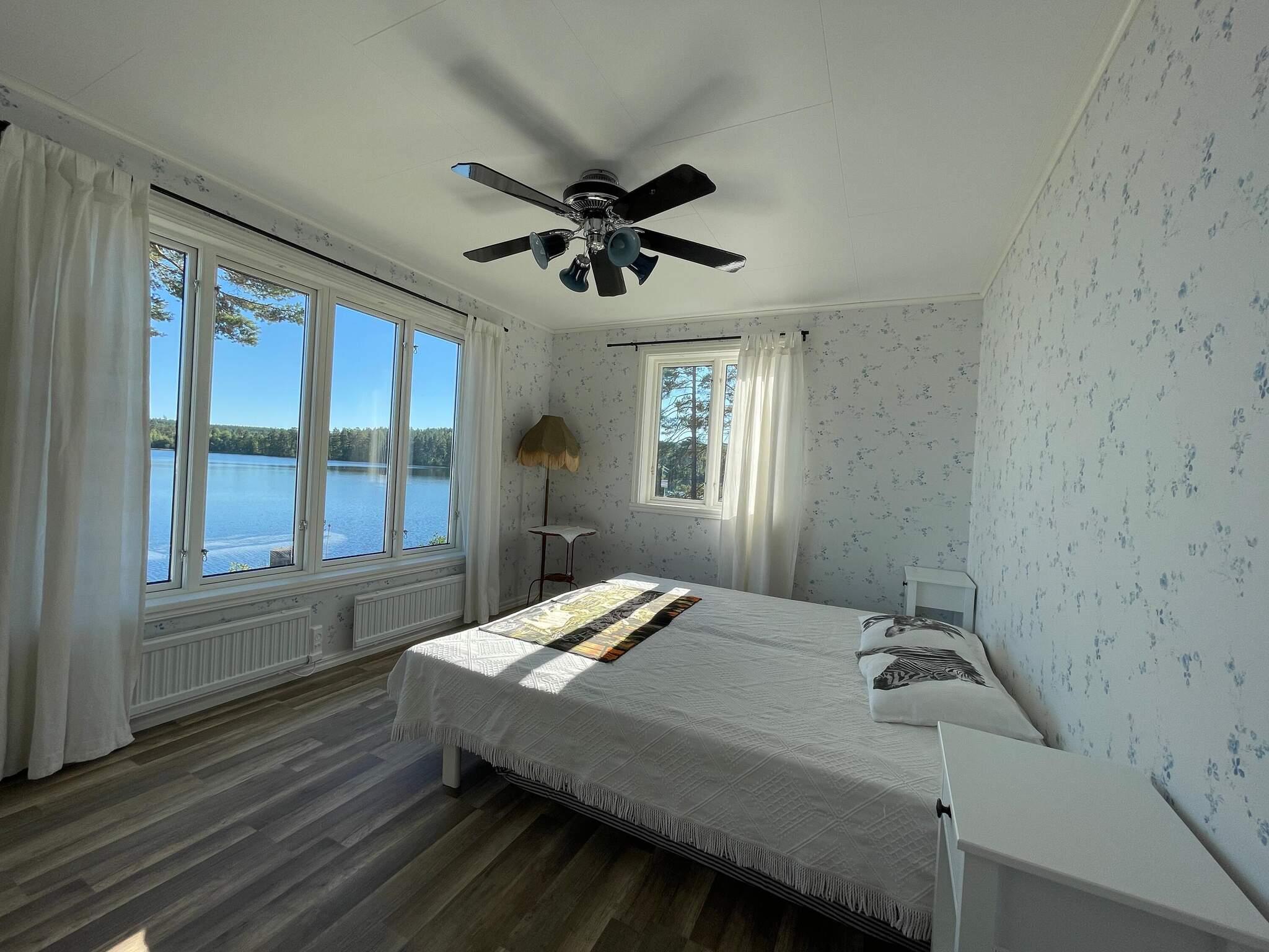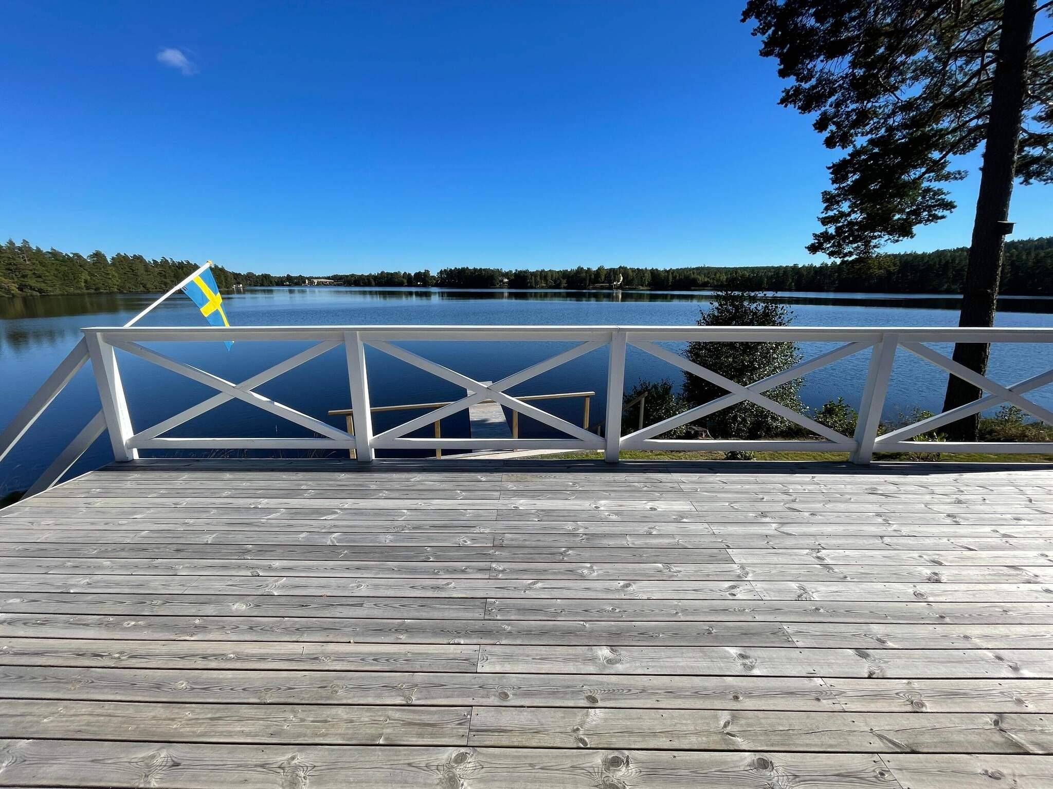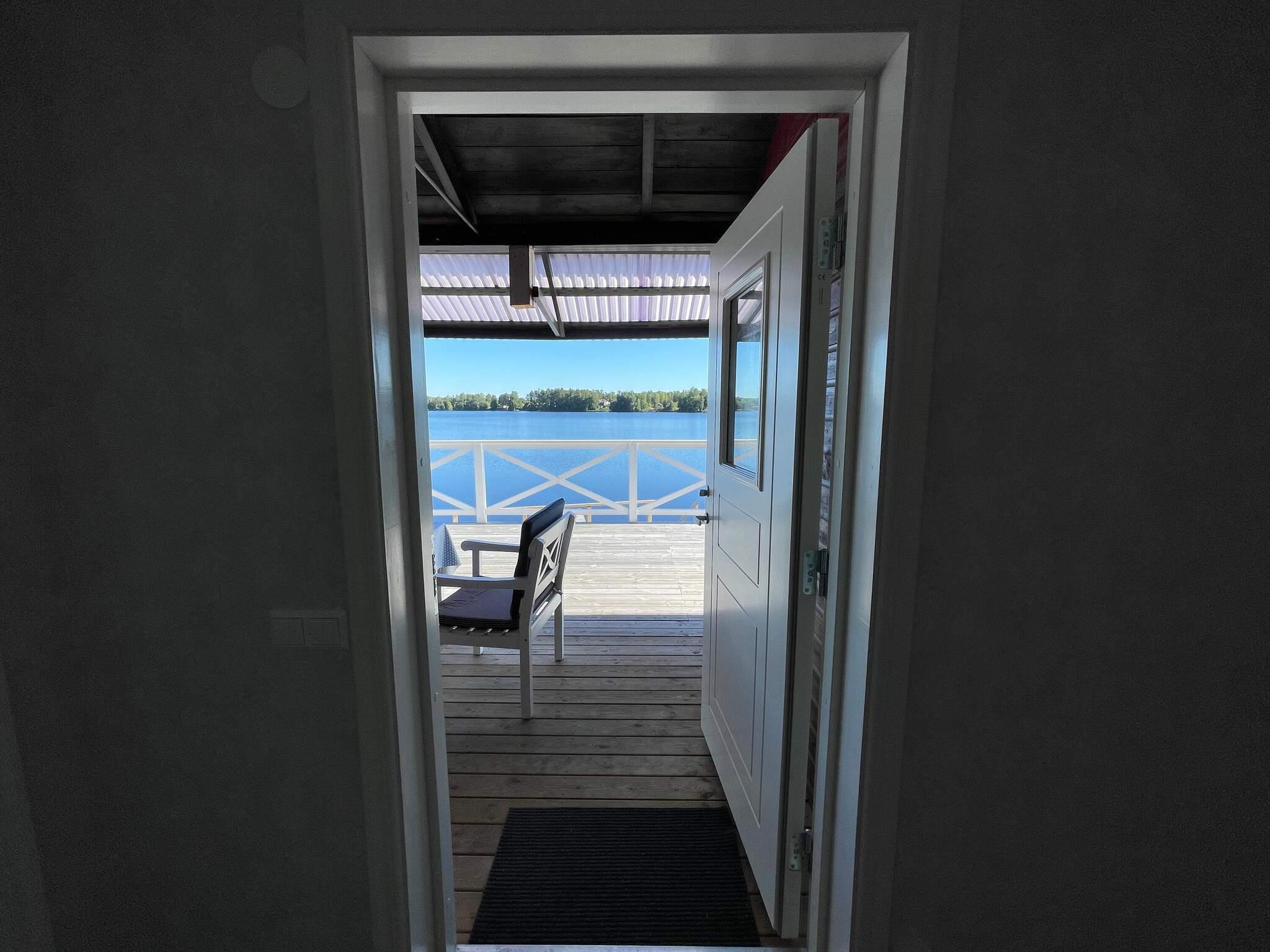 Du parkerar bilen och tar sedan den fint gjutna betongtrappan upp till stugan och finner ett stort trädäck. Väl där kan du bara vända dig mot sjön och insupa lugnet. Vänder du dig mot stugan och kliver innanför dörren finner du en hall där du kan välja tre olika riktningar. Tar du till höger kommer du till ett matrum där ett runt bord och stolar finns, och fortsätter du framåt kommer du till vardagsrummet. Här har du ett ljuvligt ljusinsläpp med stora fönster vilka alla vetter mot vattnet. Här finns också en kamin att tända ruggiga sommardagar eller kanske framåt hösten. Du finner även en stor hörnsoffa och ytterligare en matsalsgrupp att slå dig ned vid, om du vill avnjuta middagen här eller varför inte duka upp ett brädspel! Rummet är gjort för avslappnat umgänge. Tar du i stället till vänster finner du ett nybggt sovrum med våningssäng. Takspotligts gör rummet ljust och väldigt inbjudande. Du finner även två större sovrum vilka också är ljusa och fina, det ena med två enkelsängar och det andra med en dubbelsäng. Från båda dessa rum har du magnifik sjöutsikt. Ett nyrenoverat badrum återfinns också i den här delen av huset. Även härifrån kan du njuta av sjöutsikt. Går du rakt fram i hallen innanför dörren kommer du till ett fullutrustat kök, också det med sjöutsikt. Det finns ett stort matbord och utgång till ytterligare en altan på vilket det också finns utemöbler.