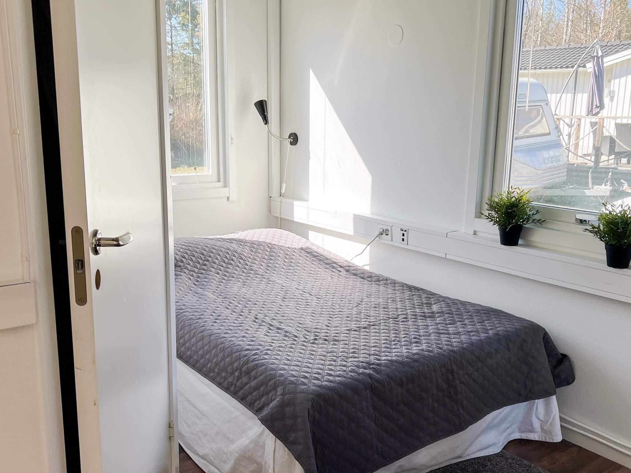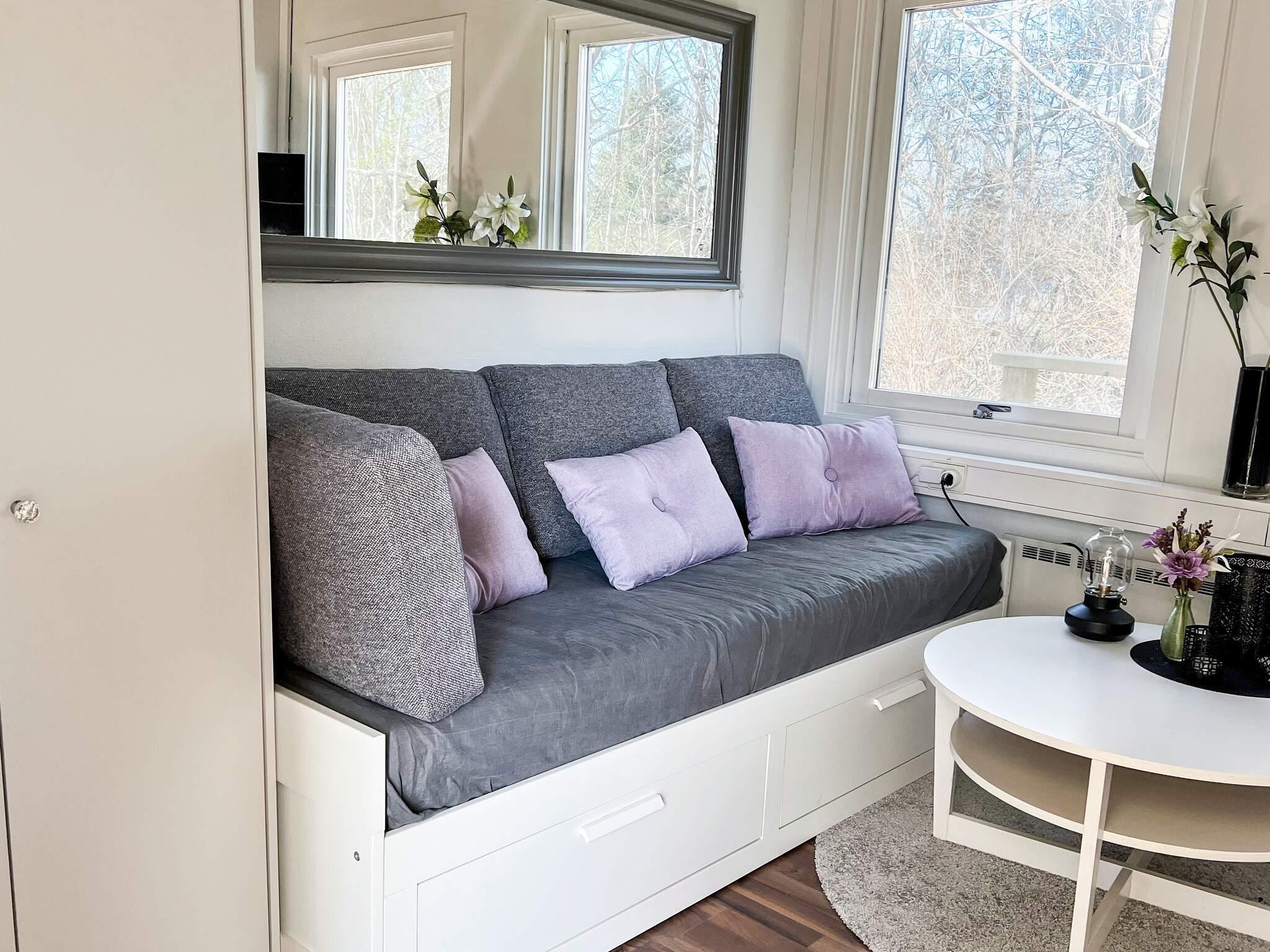 Huset är fint och modernt inrett med en altan med utemöbler och grill för mysiga sommarkvällar. Huset har ett sovrum med en 140 säng och en dagbädd i vardagsrummet. Ett fint helkaklat badrum med WC, massagedusch och tvättmaskin finns. Mellan sovrummet och vardagsrummet finns ett litet kök och ett köksbord med två stolar. Från altanen har ni en härlig ostörd utsikt över en stor gräsmatta för spel och lek, här ser ni också ut över fruktträd och bärbuskar.