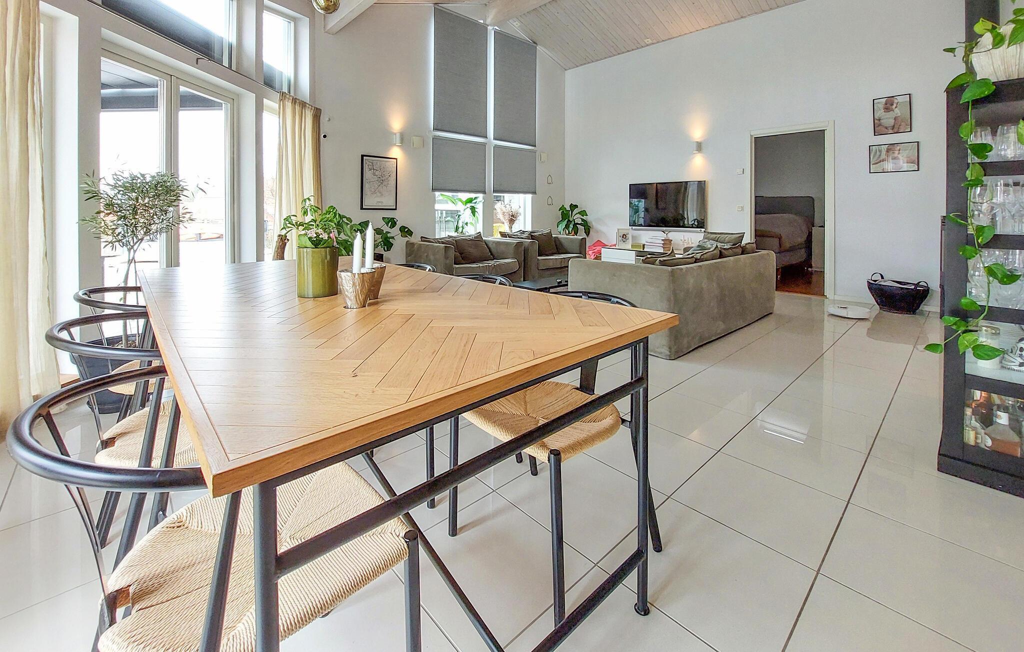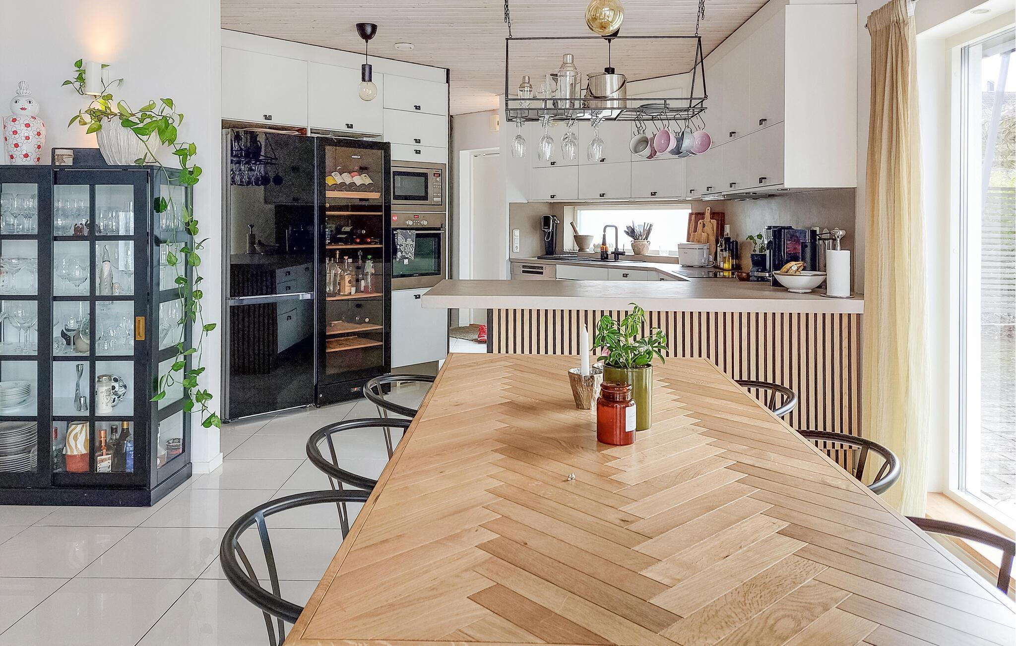 Dette feriehus med lækre kvalitetsløsninger tilbyder optimale betingelser for en afslappende og behagelig ferie med masser af plads til at slappe af. Oplev solrige dage og lune aftener i smagfulde omgivelser med eksklusive faciliteter. Træd ind i den rummelige opholdsstue med højt til loftet, stilfulde møbler og store vinduer. Slap af i de komfortable sofaer, læs en bog eller nyd en film sammen. Brug det åbne køkken med bardisk og moderne apparater til hyggelige madlavningsøjeblikke. Nyd jeres måltider ved det lange spisebord og kig ud i haven gennem de store glasvinduer.