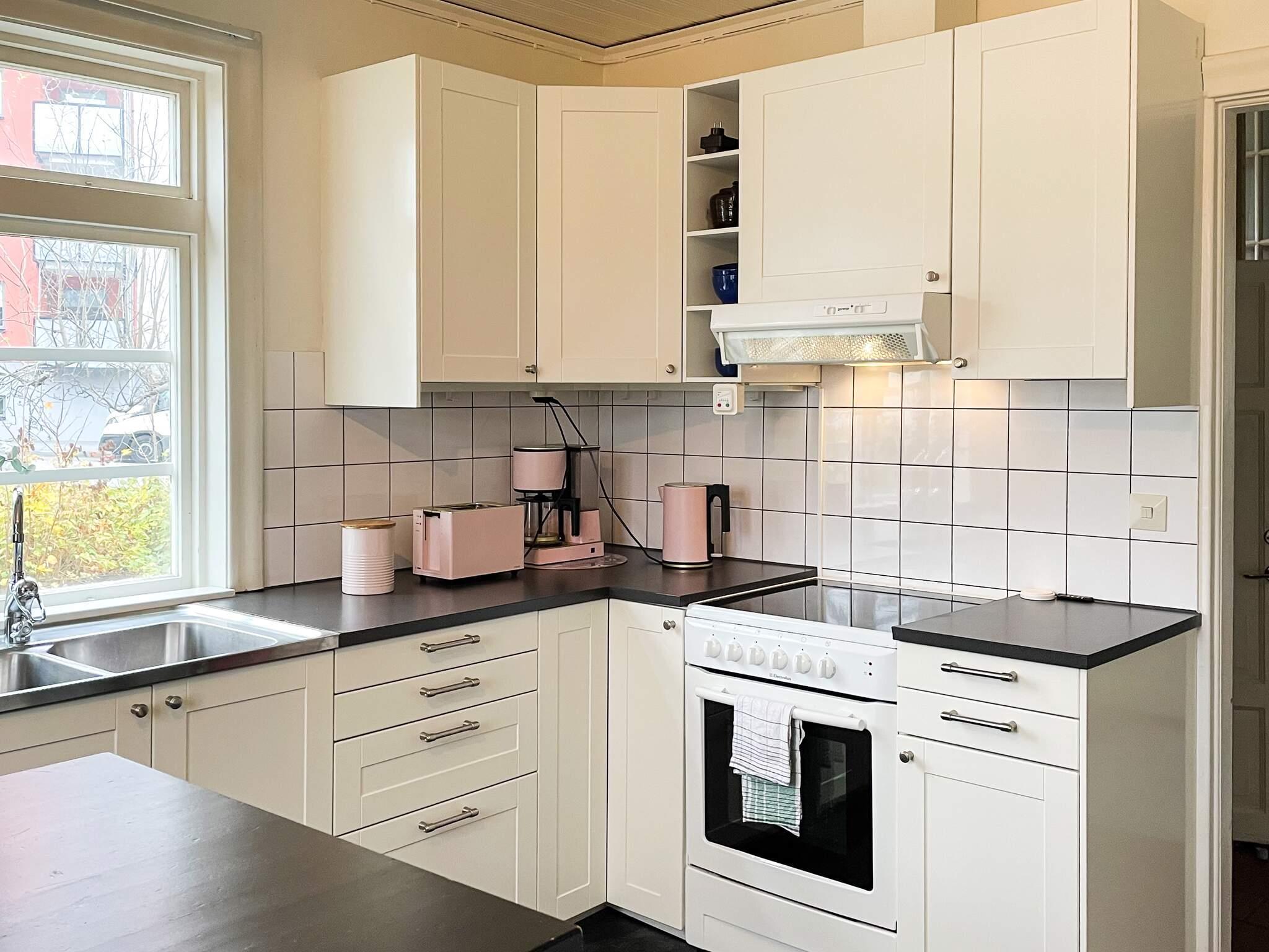 Køkken: El-komfur, køle-frys, mikroovn, kaffemaskine, opvaskemask.