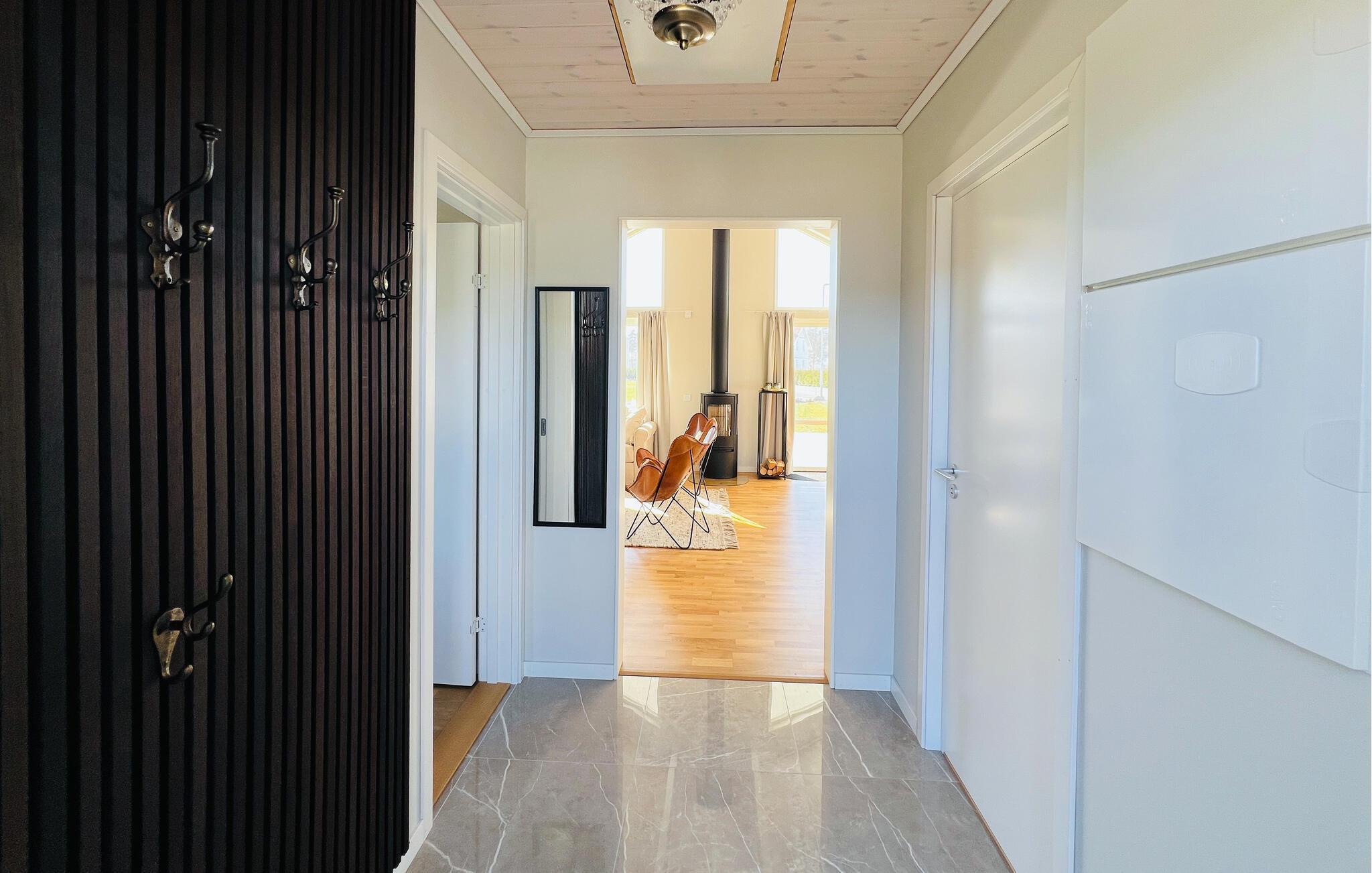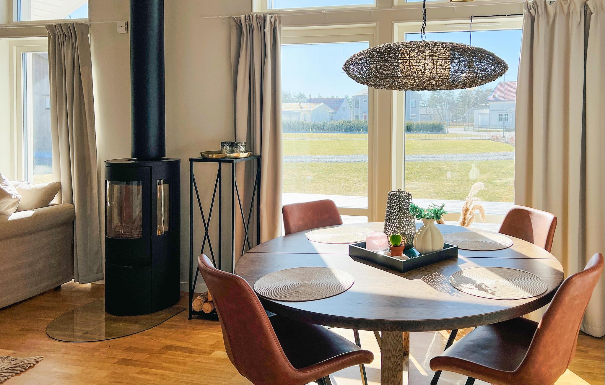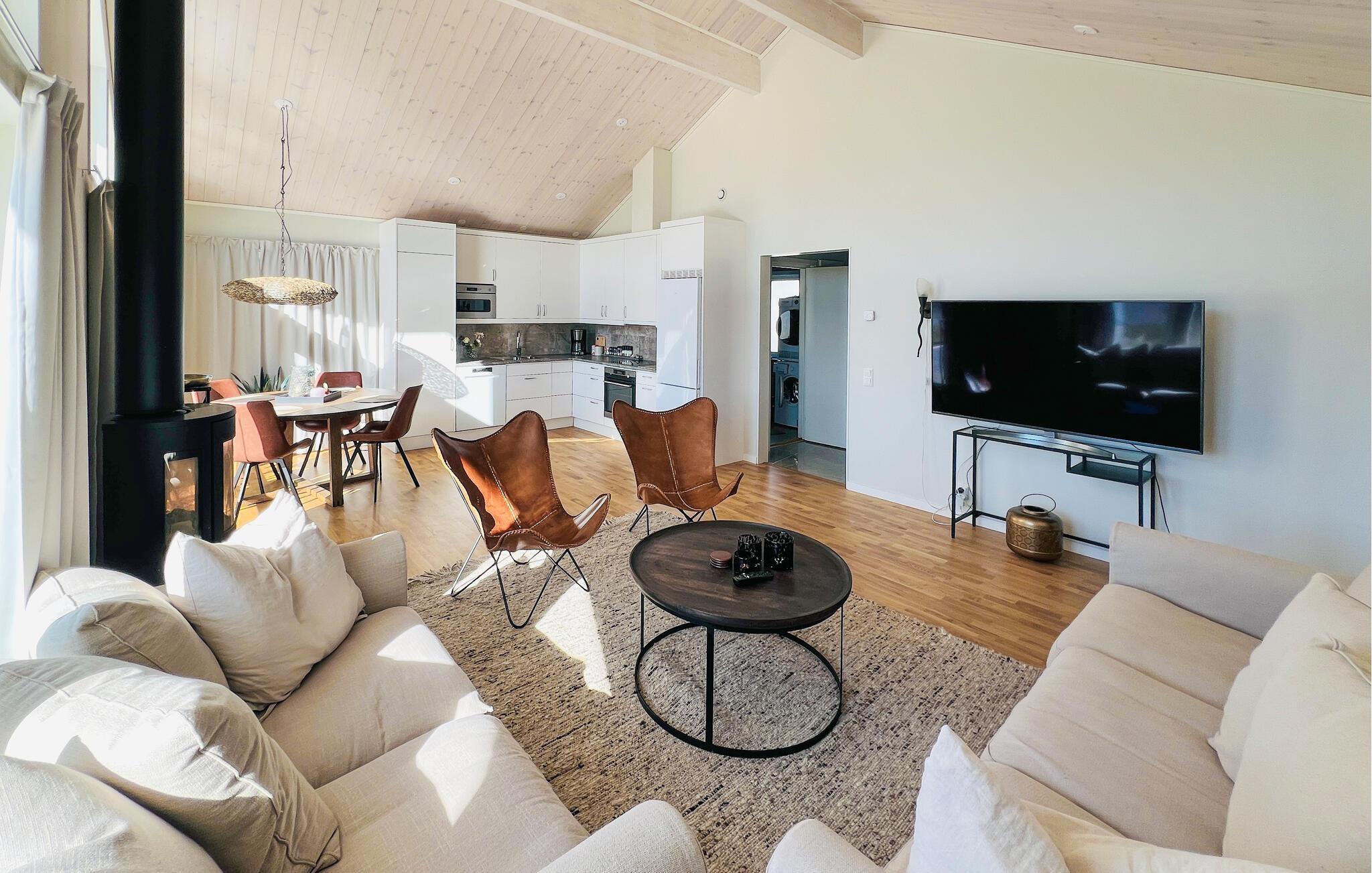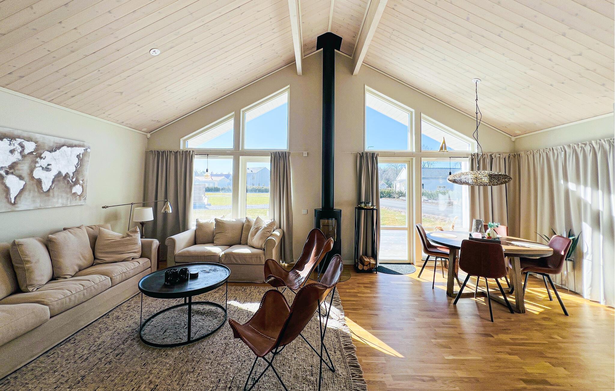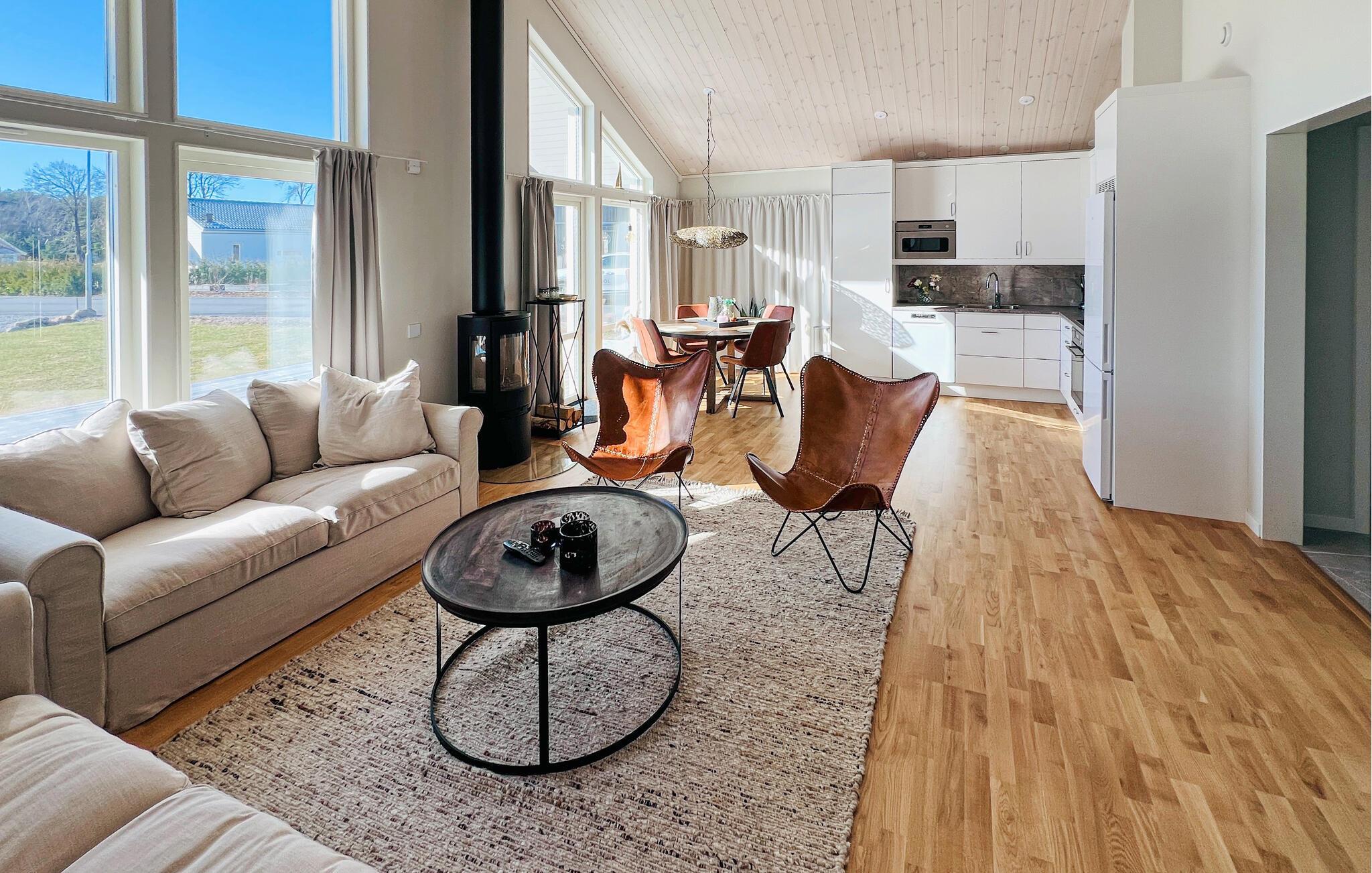 Velkommen til dette stilfulde feriehus, hvor store vinduesfronter skaber en venlig og lysfyldt stemning. Lav maden sammen i det åbne køkken og nyd dagens måltider ved det indbydende spisebord. Find jer godt til rette foran brændeovnen i den hyggelige opholdsstue, læs en god bog og lad brændeovnen give ekstra komfort på køligere dage.