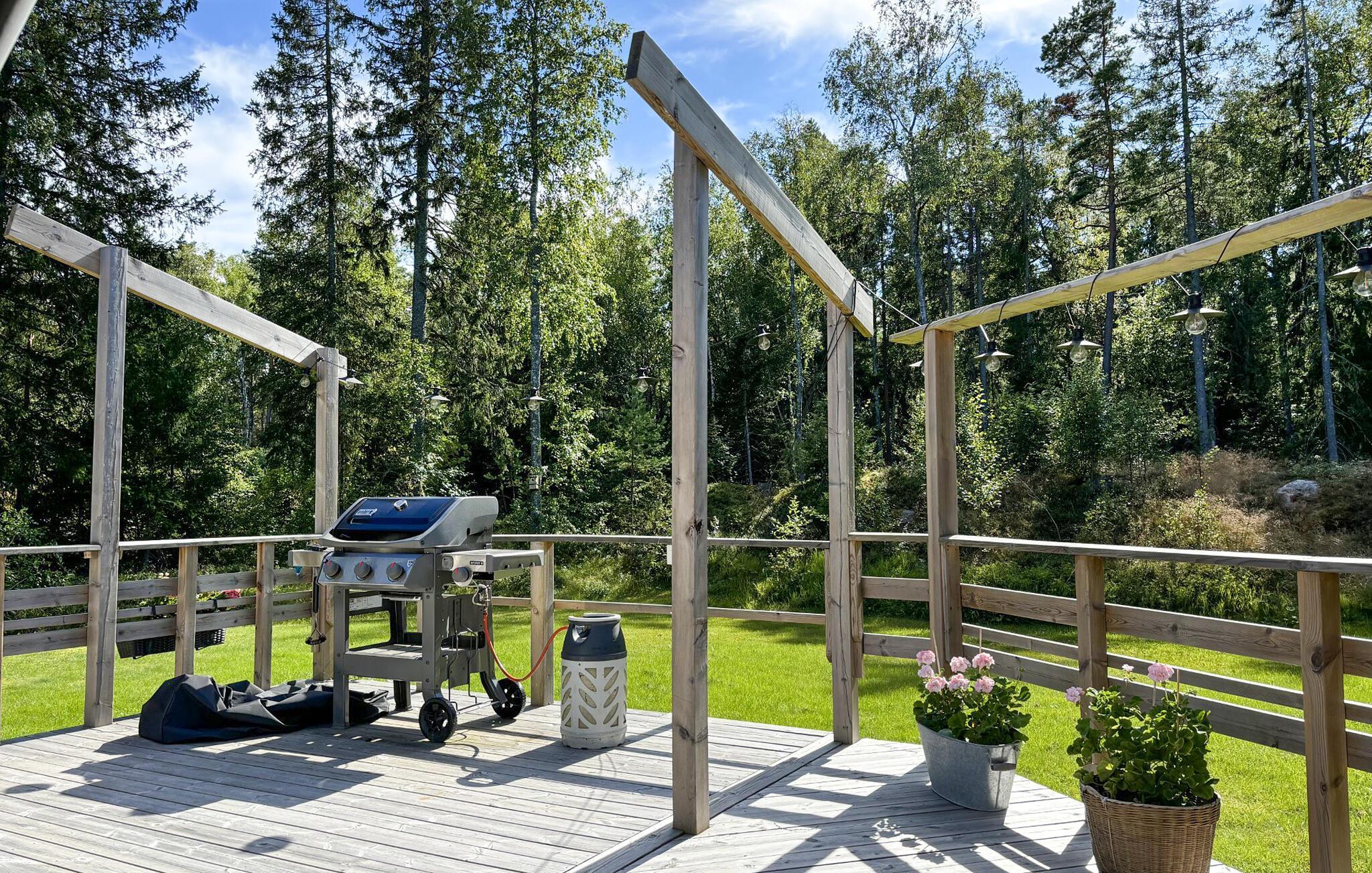 Tilbring dagen på den rummelige træterrasse med grill og lounge-siddegruppe under den overdækkede pavillon. Læg fødderne op, lyt til fuglene, eller rund dagen af i godt selskab. Haven er omgivet af skove, perfekt til en pause fra hverdagen.