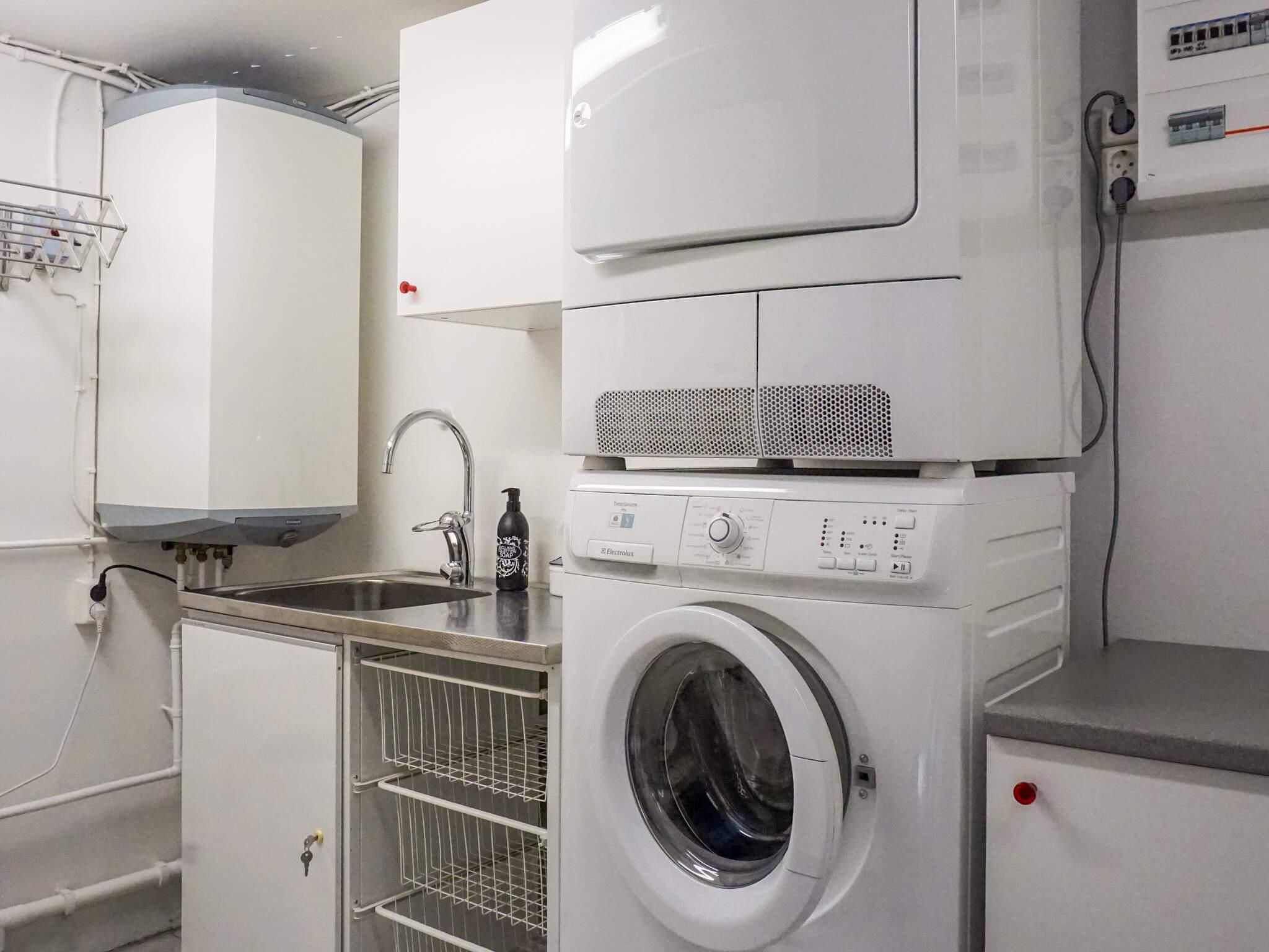 Køkken: El-komfur, køle-frys, mikroovn, emhætte, kaffemaskine, opvaskemask.