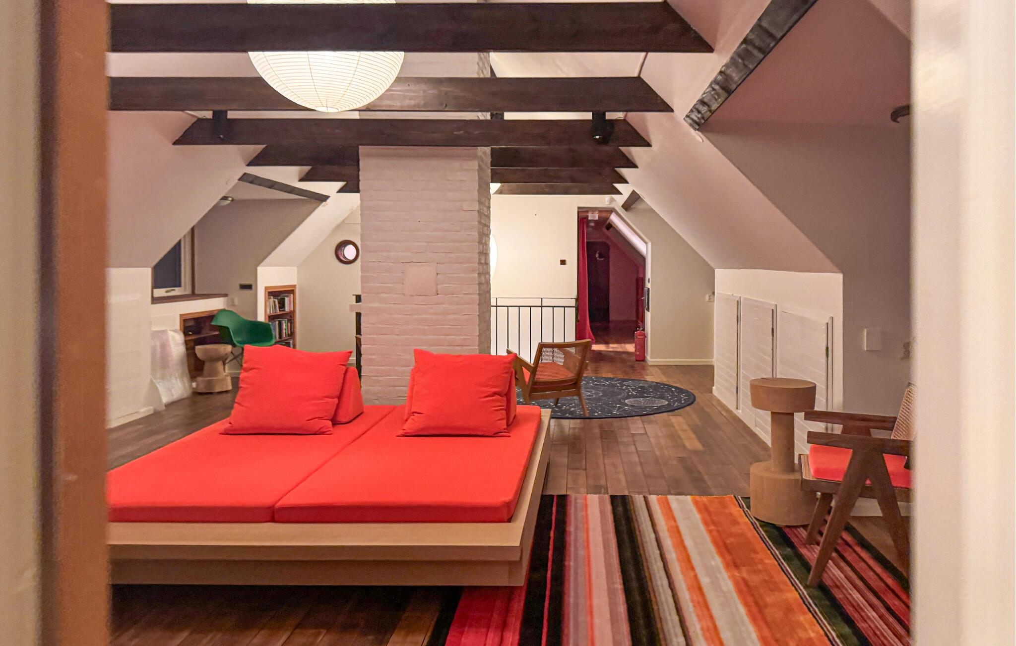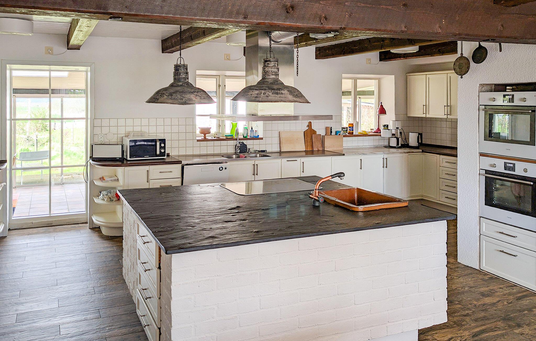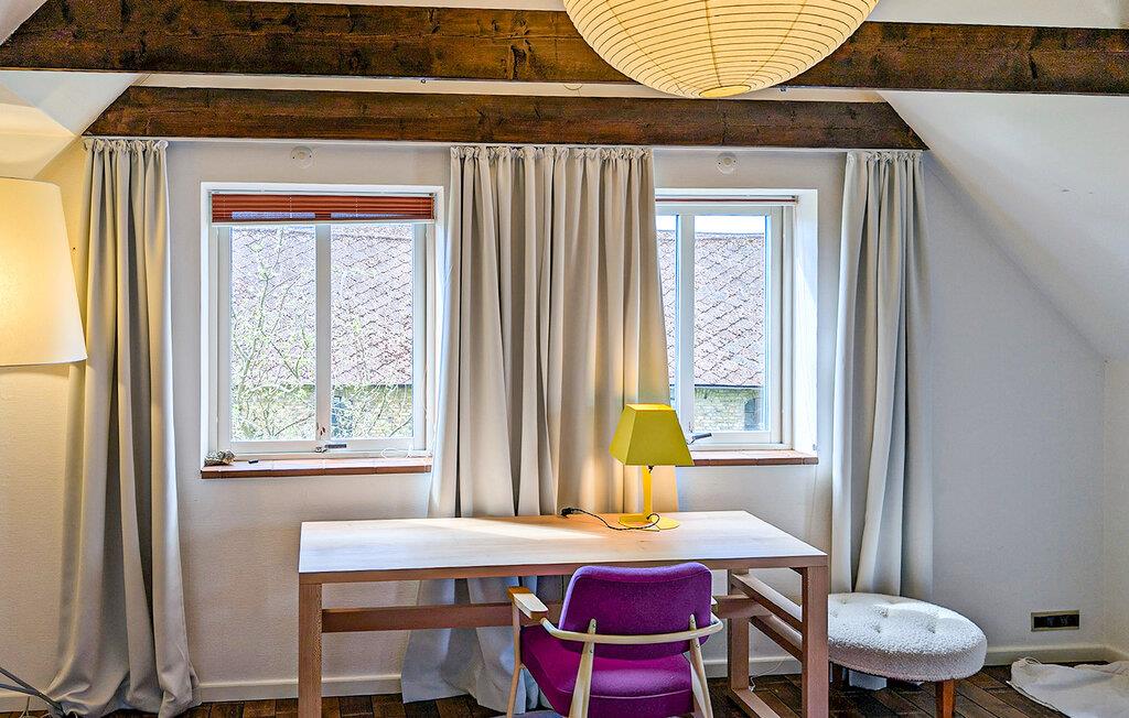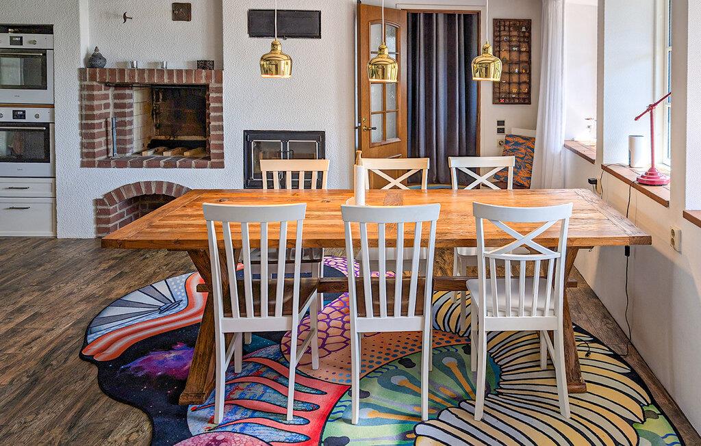 Dette hus har en dejlig blanding af rustik charme og moderne komfort. Imponerende træbjælker, farverige tekstiler og et smukt køkken skaber en atmosfære, hvor I øjeblikkeligt kan slappe af. Slap af i udestuen med en kop te, mens I nyder udsigten over de omkringliggende grønne områder eller tilbring en sjov eftermiddag med at spille kort med børnene.