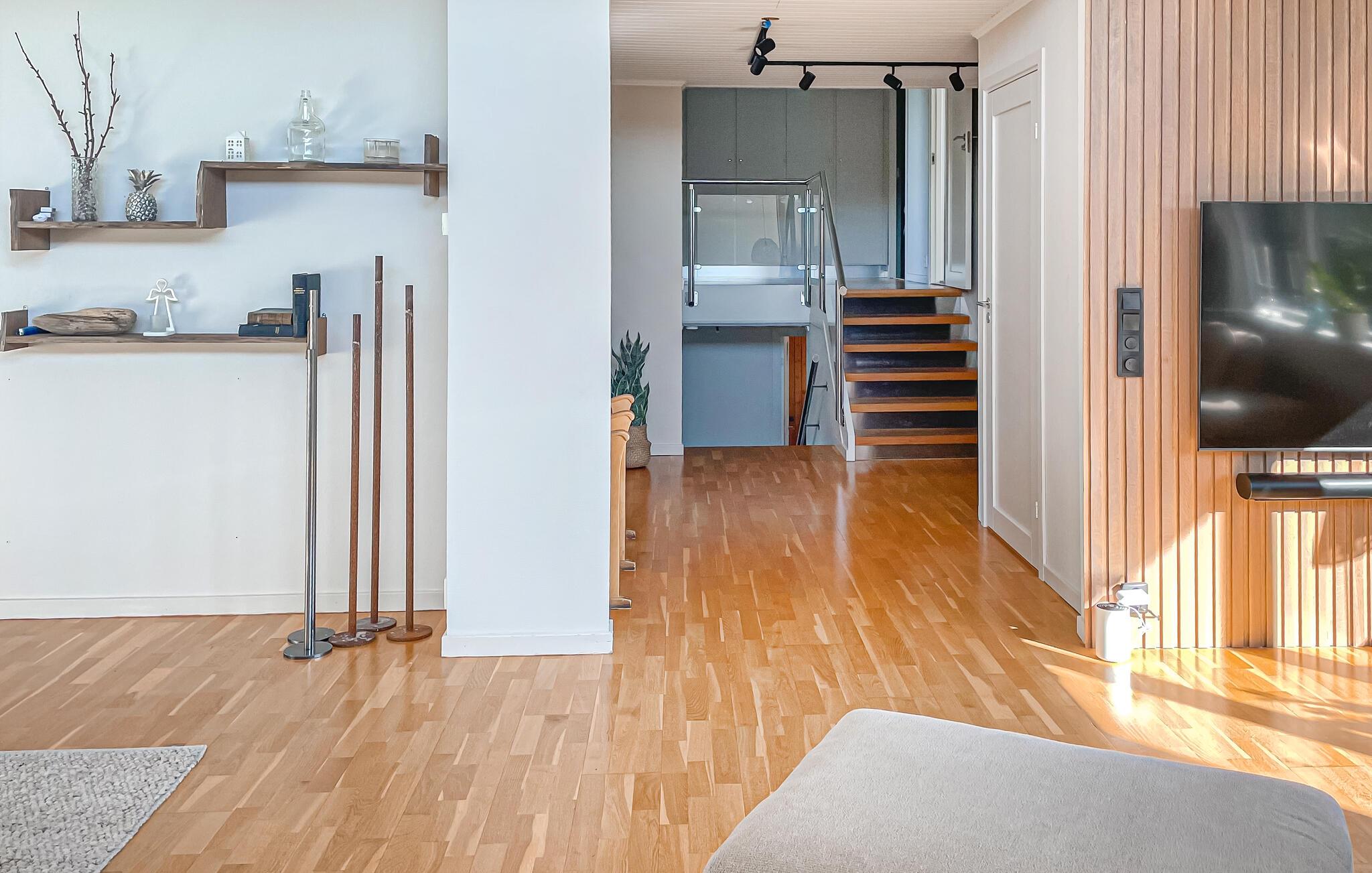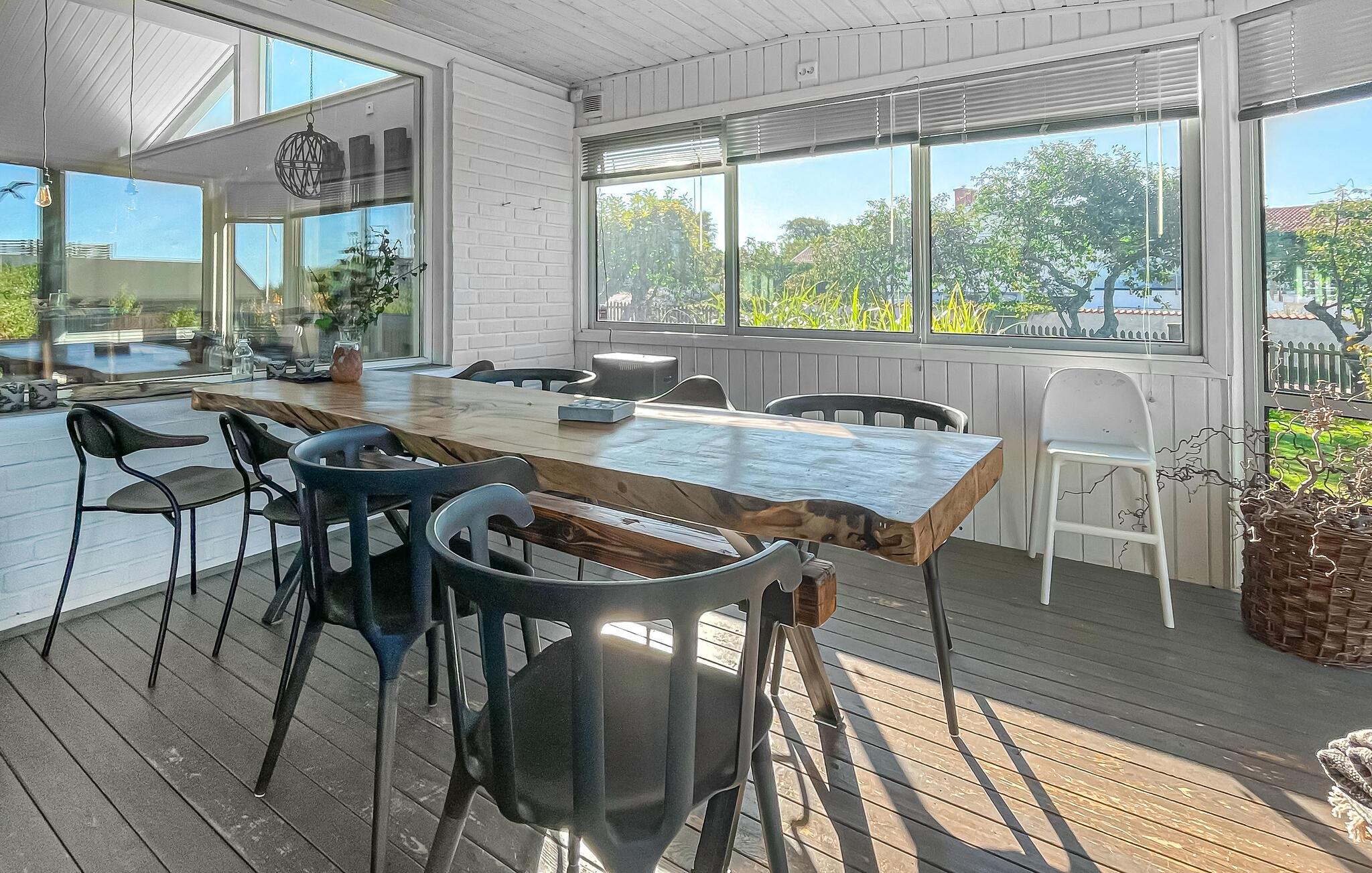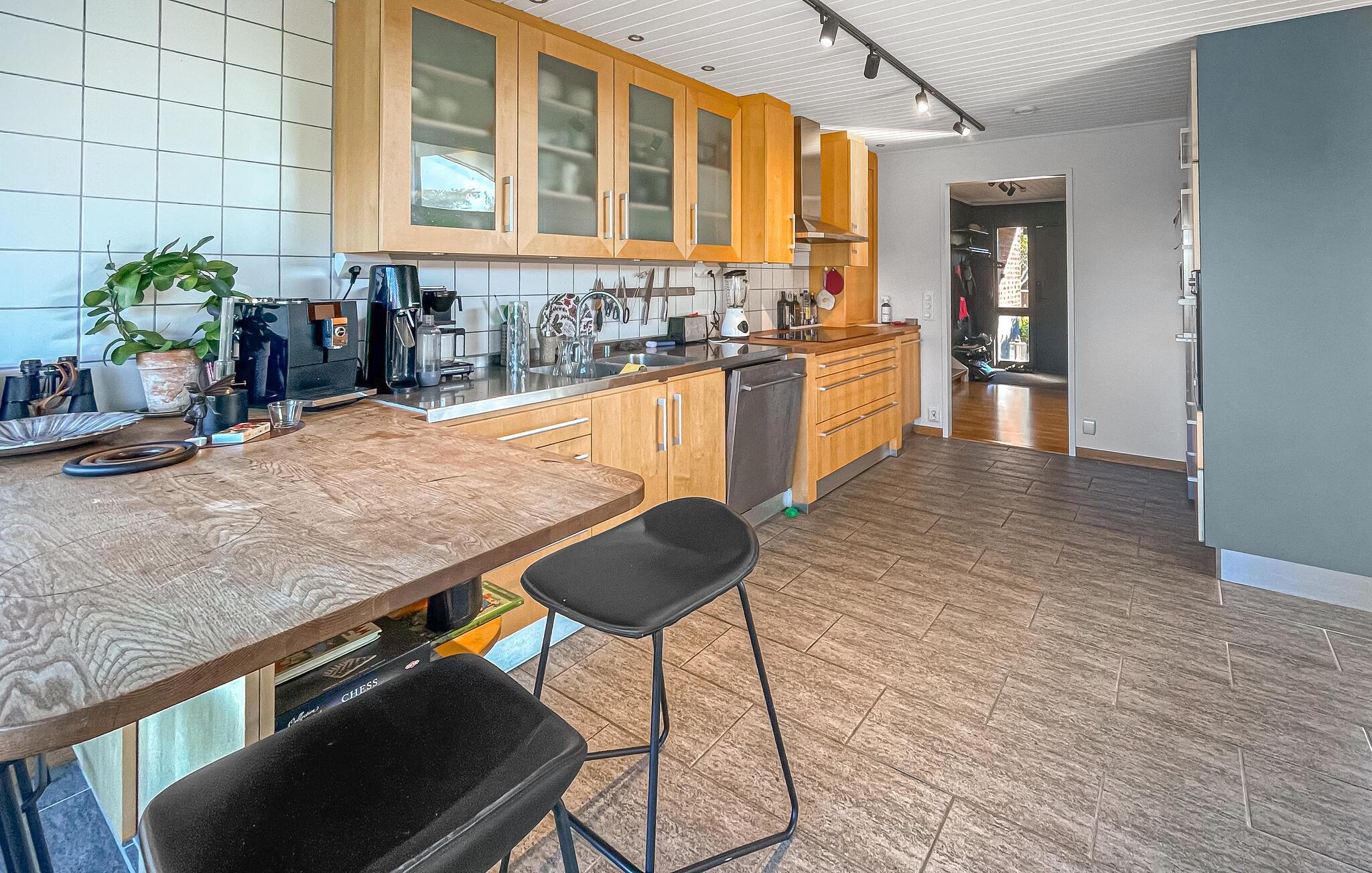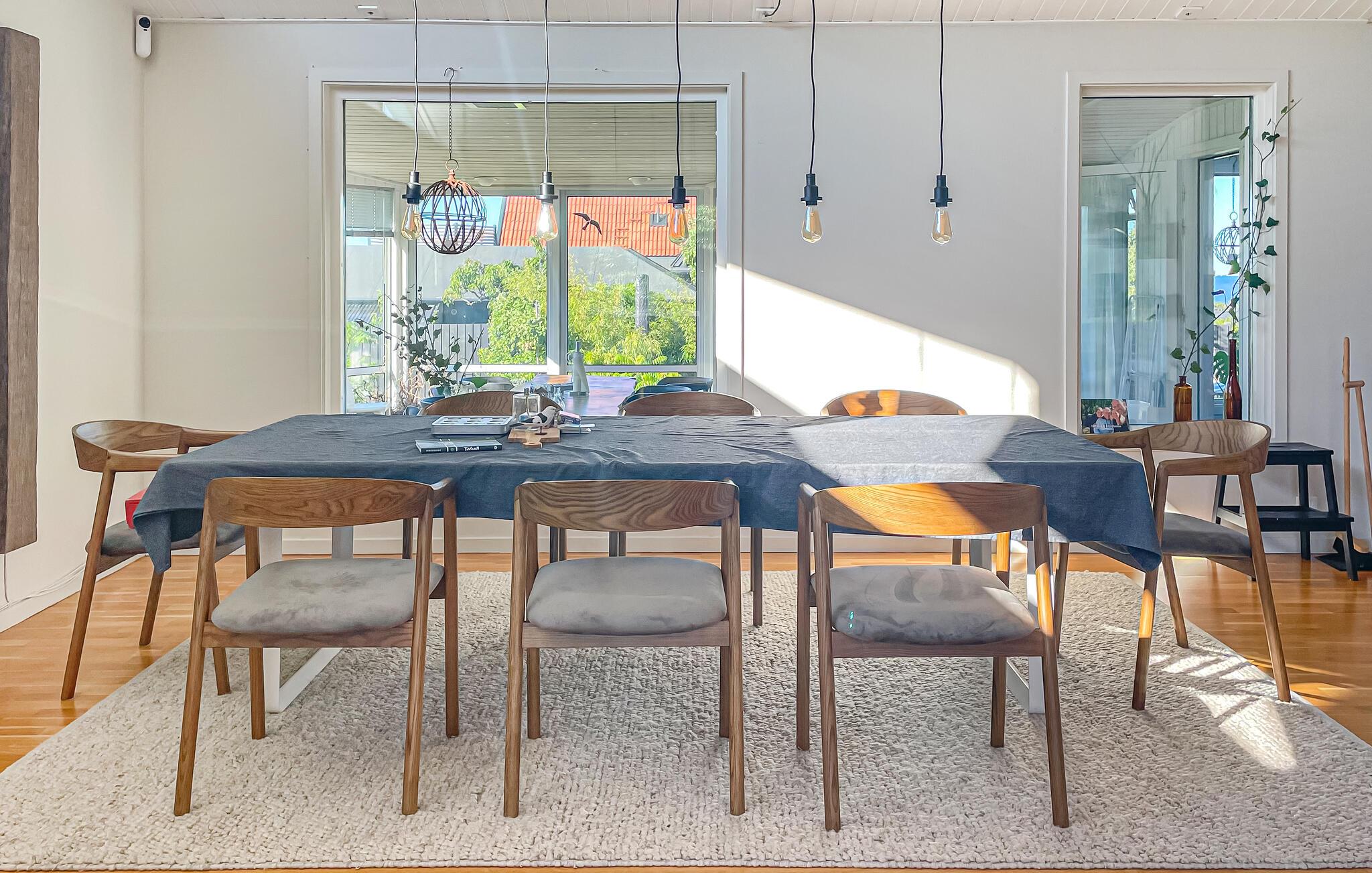 Dette smukke, komfortable feriehus giver jer rigelig plads til en dejlig ferie, selv med en større familie. Glæd jer til hyggelige madlavningsaftener og muntre måltider ved det lange spisebord. Slap af i saunaen efter en saltvandsdukkert i havet og tænd brændeovnen til hyggelige læsestunder, harmoniske spilleaftener eller stream en spændende film, som alle vil nyde.