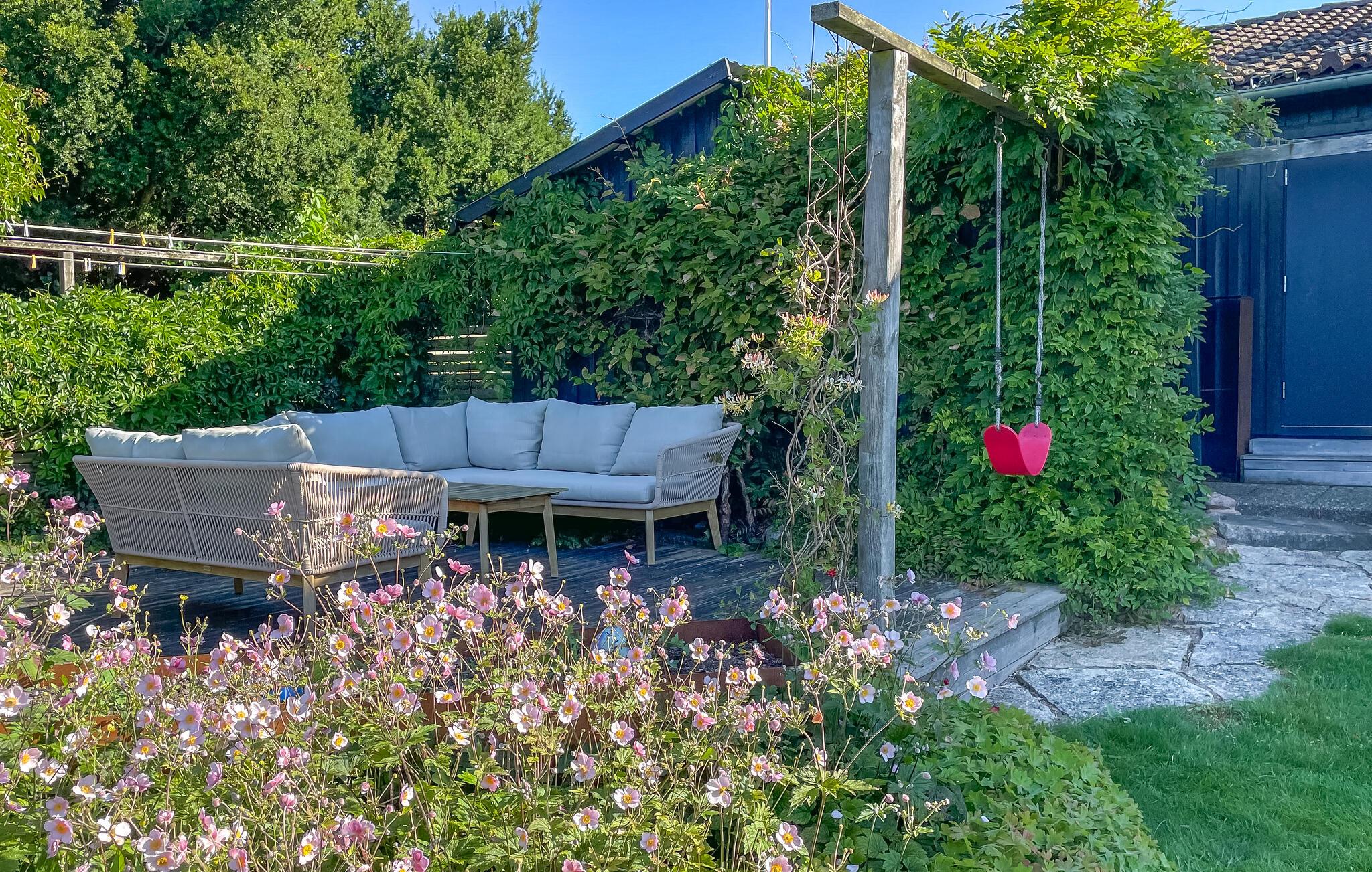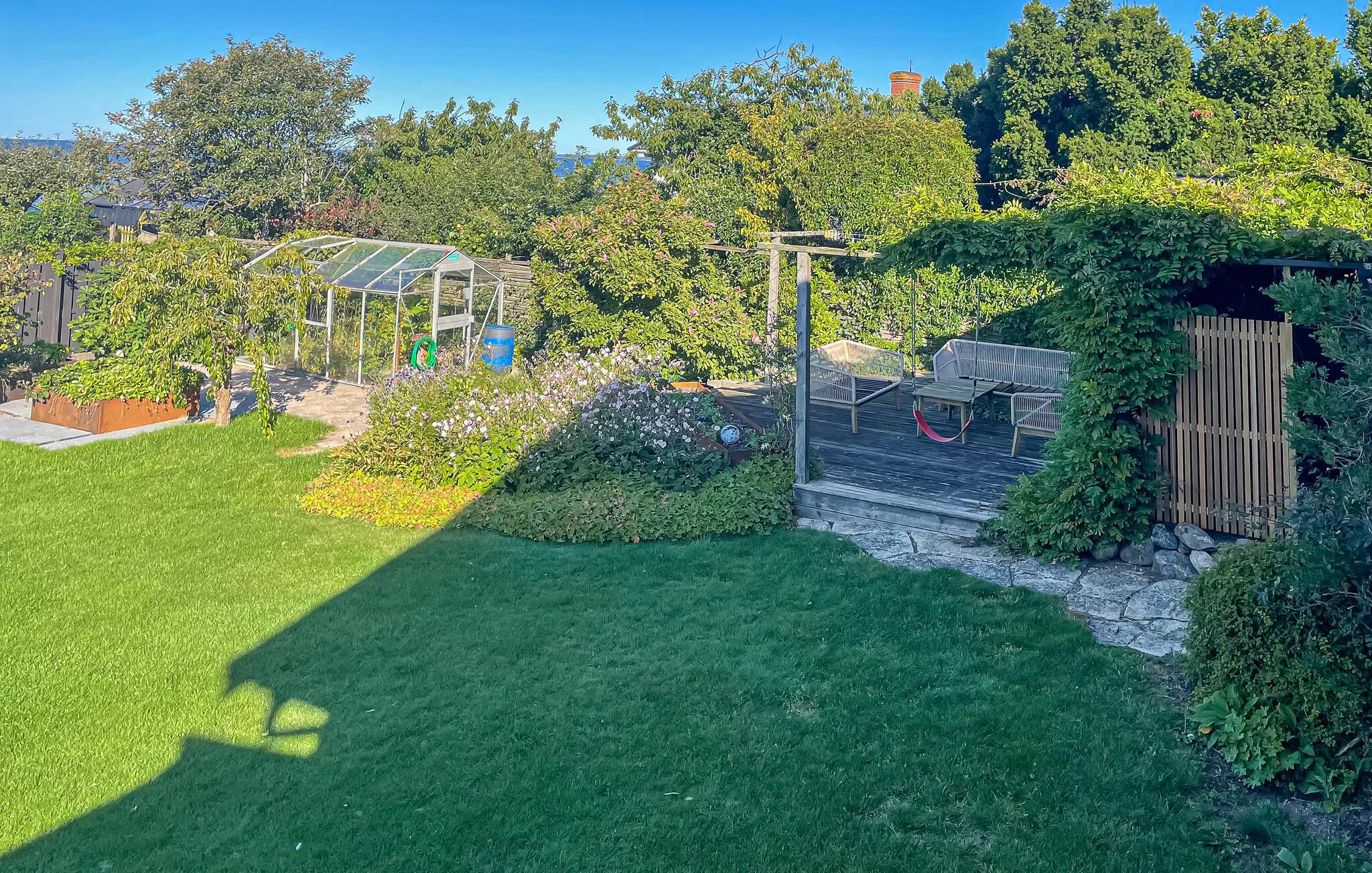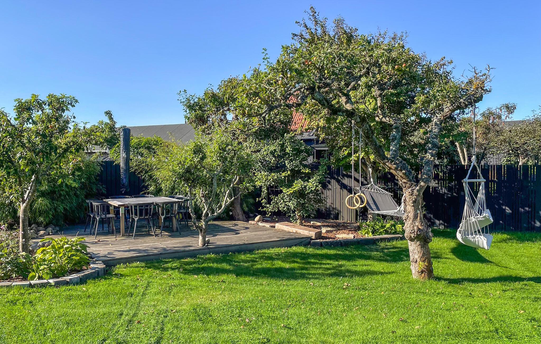 Den store, overdækkede have byder på hyggelige steder at spise og snakke i den behagelige havbrise. Mens børnene boltrer sig på trampolinen eller har picnic, kan I tænde op i grillen eller nyde et glas vin på den indbydende træterrasse.