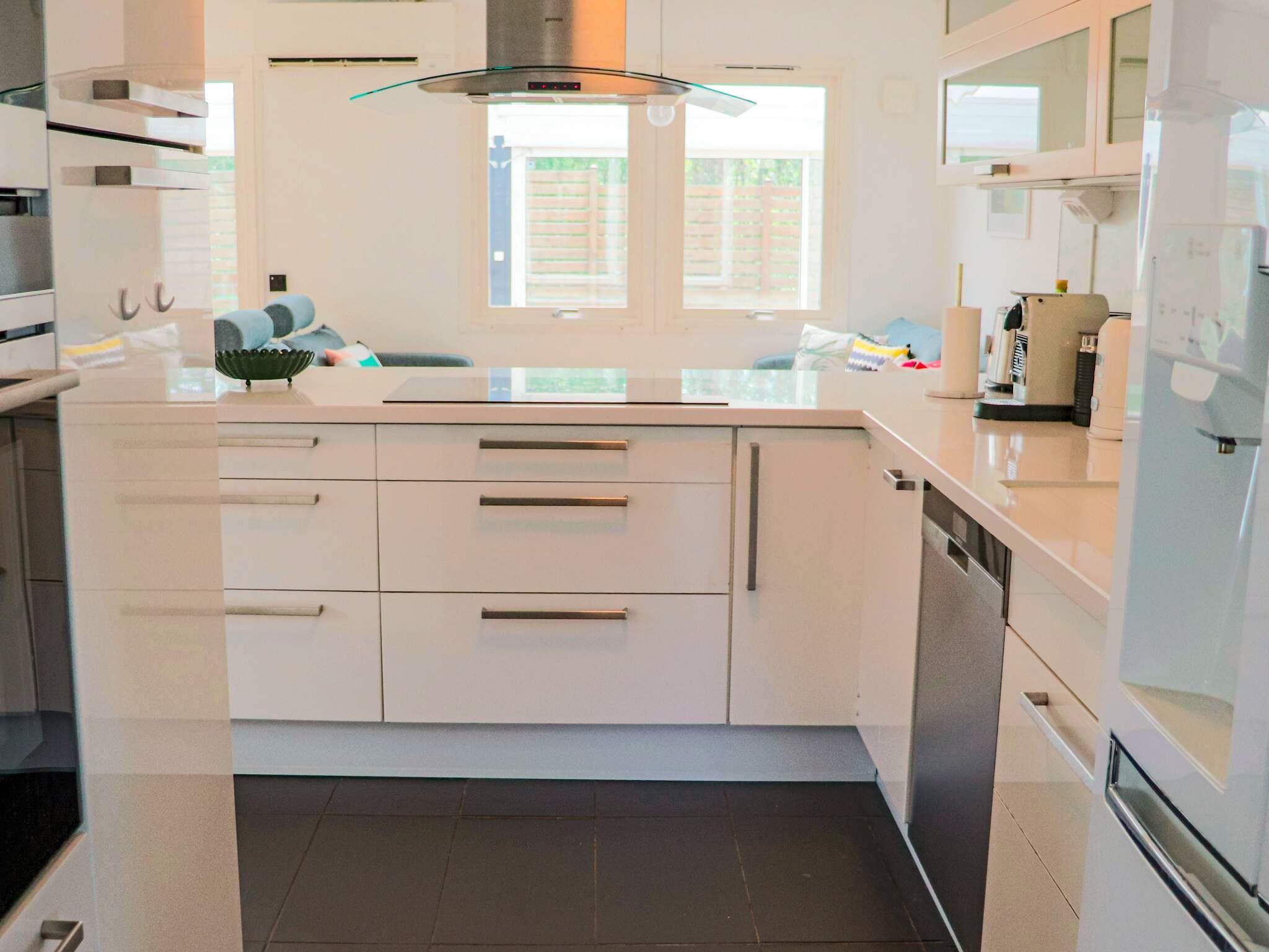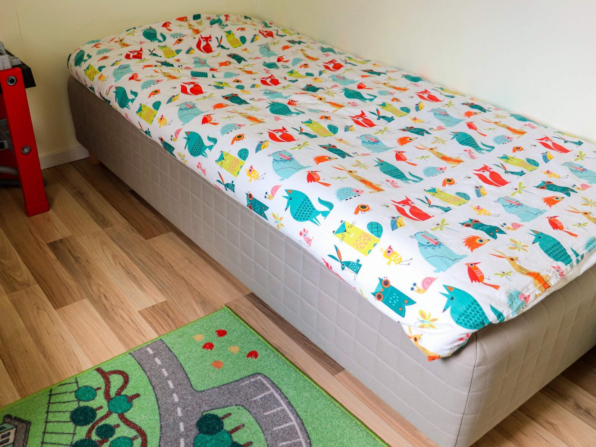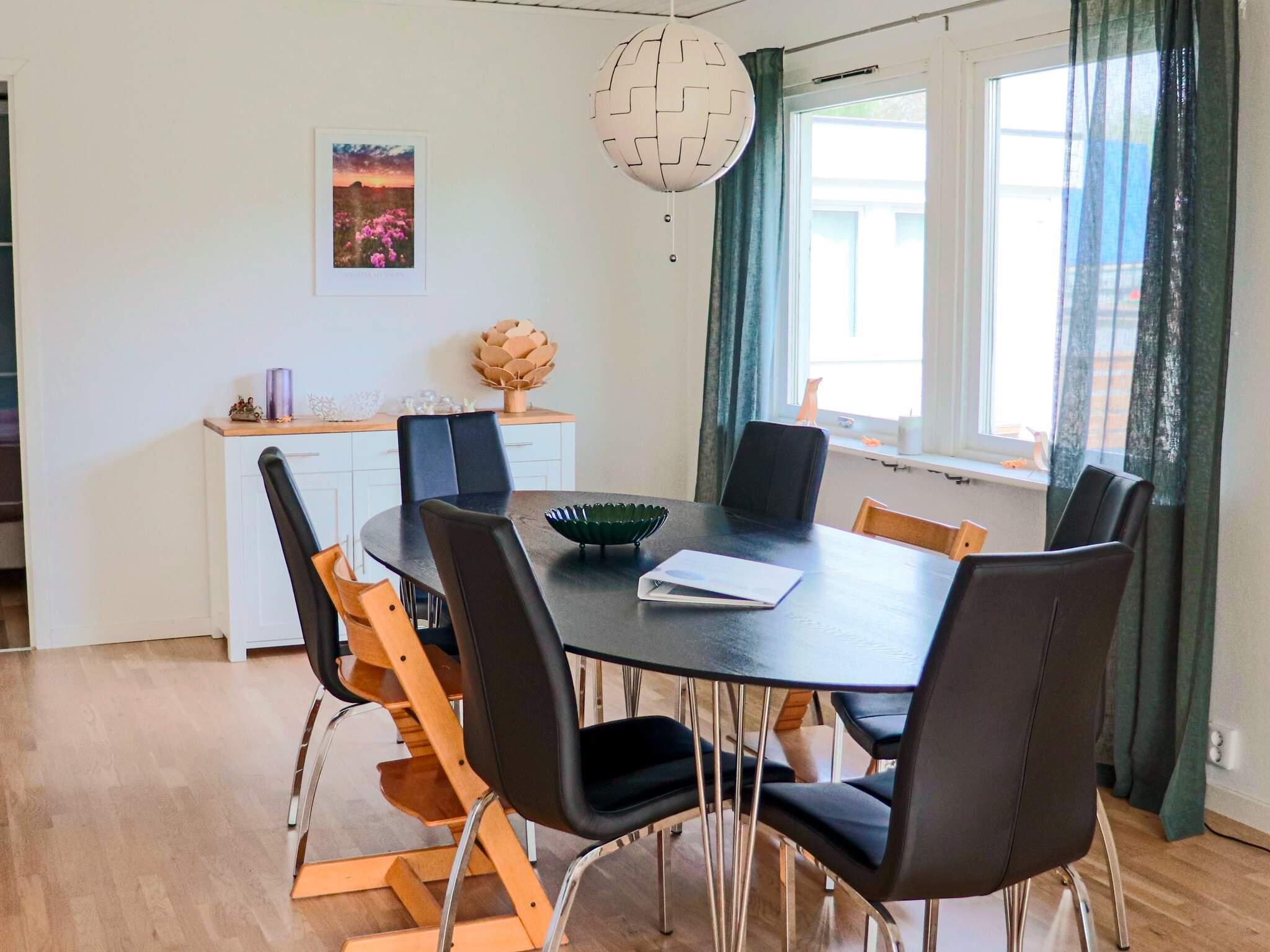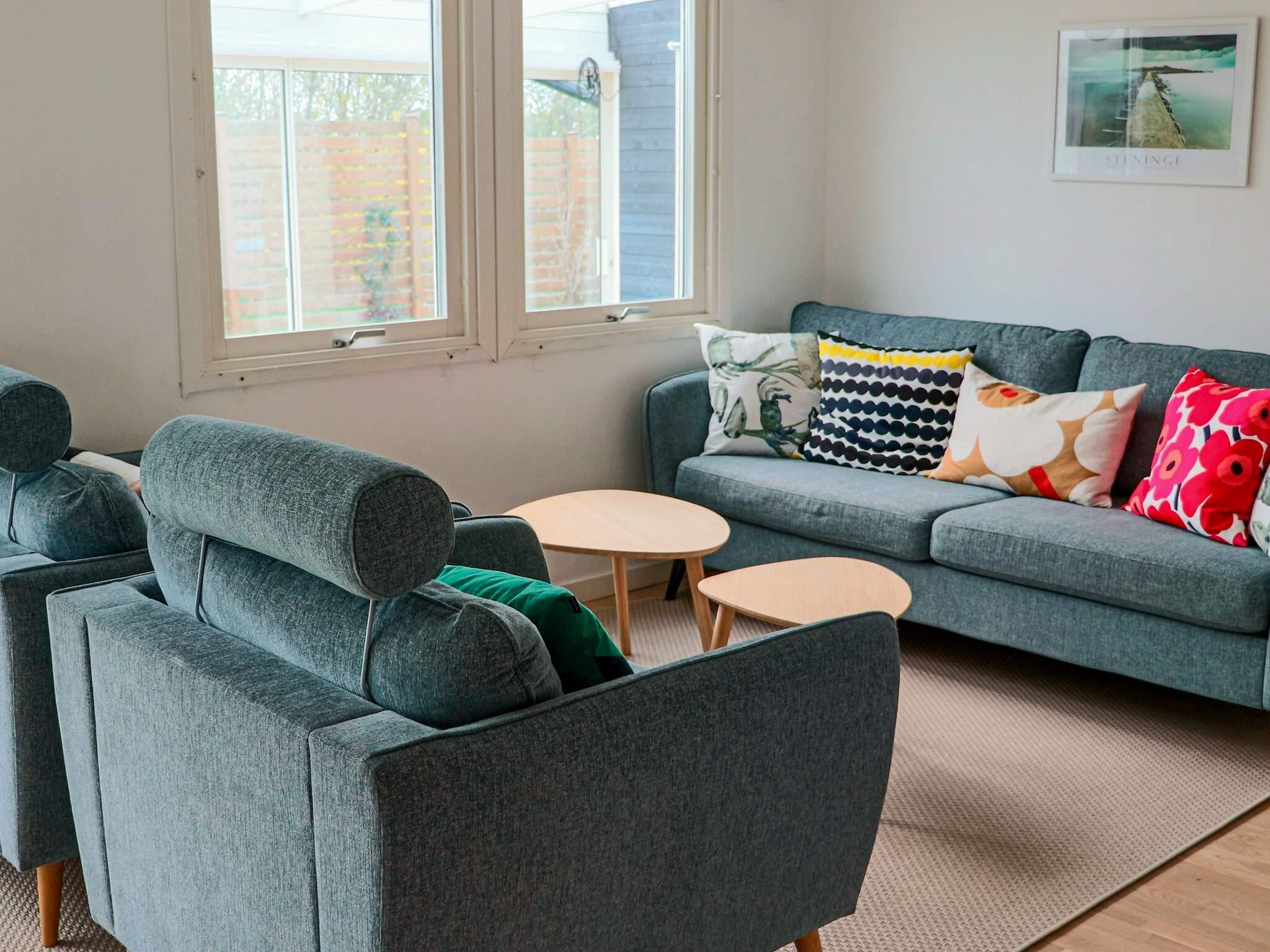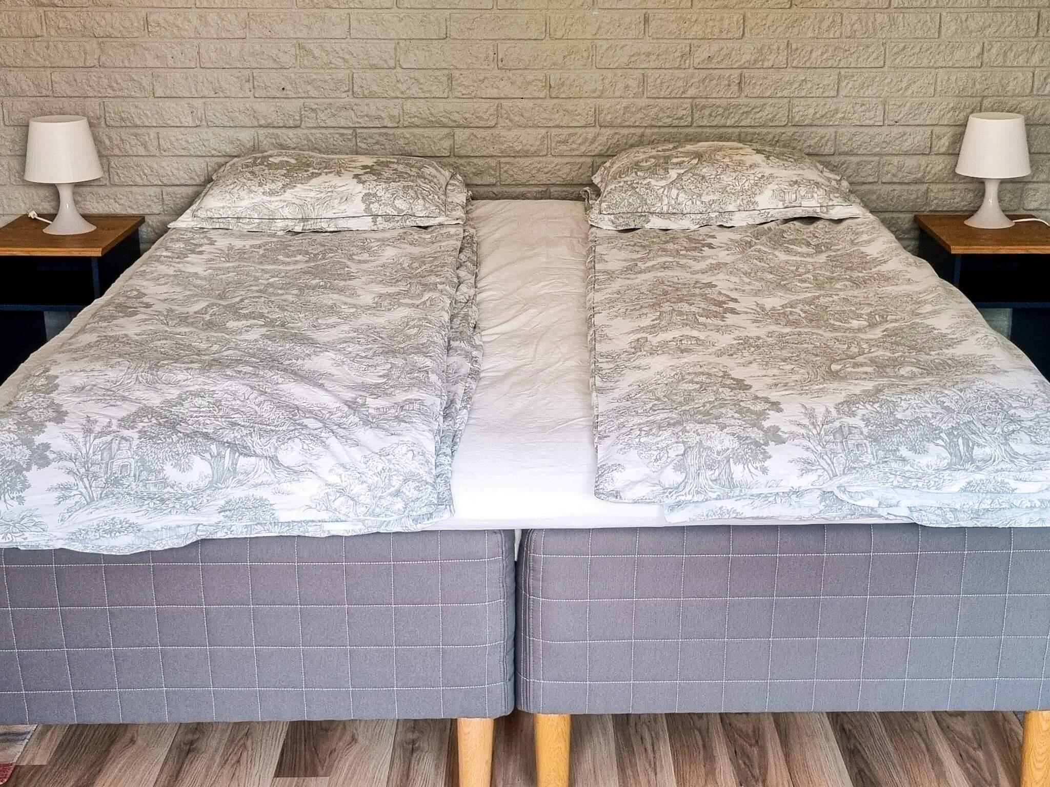 Från husets entré finns ett badrum med dusch. Det finns ett sovrum med en dubbelsäng och två mindre med vardera en enkelsäng. Det finns ytterligare ett sovrum lite avskilt med egen entré och toalett. Köket är öppet och välutrustat. Husets hjärta är det rymliga vardagsrummet som har både matplats och bekväma sittmöbler. Här finns också en braskamin om ni bor här den lite kyligare årstiden. Från vardagsrummet är utgången till ett inglasat uterum med både matplats och bekväma utemöbler. Tvättstugan har också en extra dusch. Tomten är delvis insynsskyddad och gräsmattan sköts av en robotklippare.