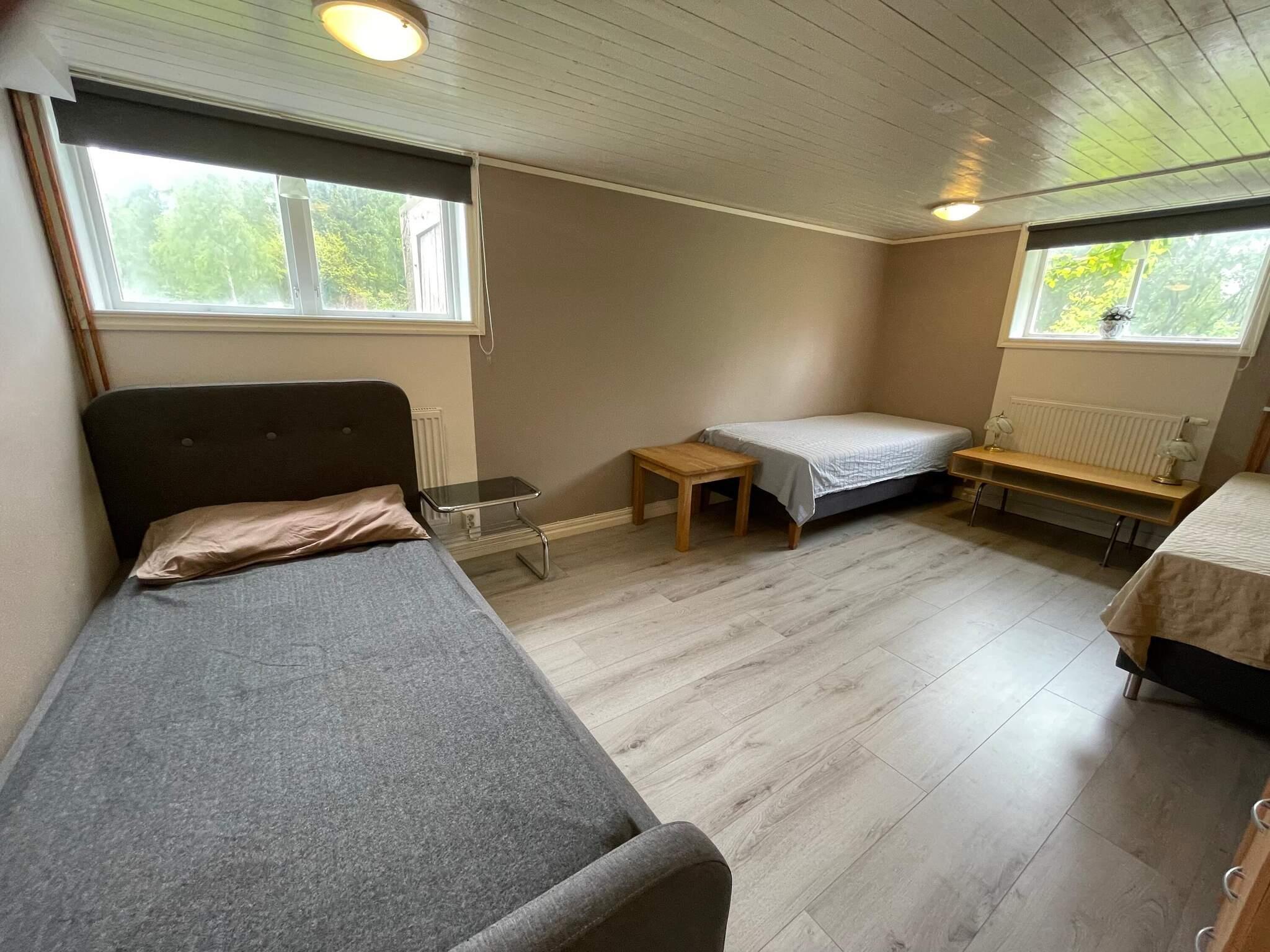 Huset med två våningar har sin huvudentré från trä decket på övervåningen. Vid ingången finns utemöbler att sitta på och med utsikt över hela trädgården. Den rymliga hallen har ingång till wc och två sovrum med en dubbelsäng vardera. Kök med alla möjligheter till självhushåll och matbord att samlas kring. Vardagsrummet med stor hörnsoffa framför smart tv som du kan använda med ditt eget programutbud. Här finns även utgång till balkong med morgonsol att njuta av. Nedervåningen nås via invändig trappa men även en ingång utifrån finns. I sovrummet med stort ljusinsläpp finns tre enkelsängar. Badrum och tvättstuga i angränsande utrymme.