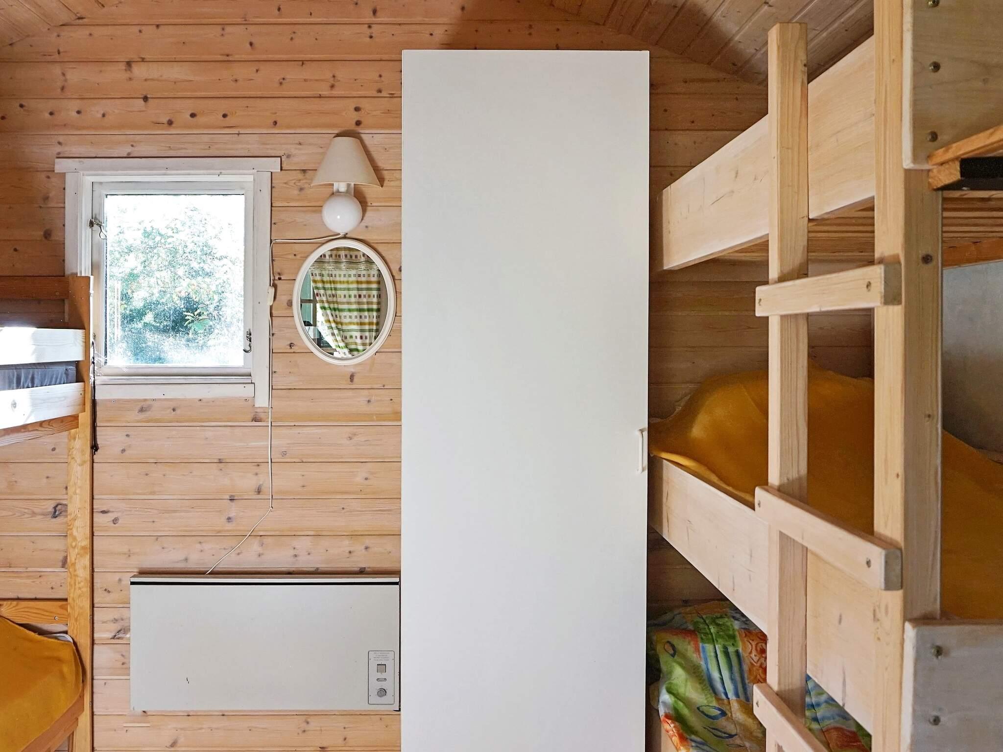 Ovanför huvudbyggnaden finns en friggebod där barnen älskar att sova och hänga tillsammans. Här finns två våningssängar. Den ena som är något smalare är lämpad för de yngre barnen då madrasserna enbart är 70cm breda. Den andra våningssängen är normala 90/90cm. Stugan har en liten mysig veranda med utemöbel.