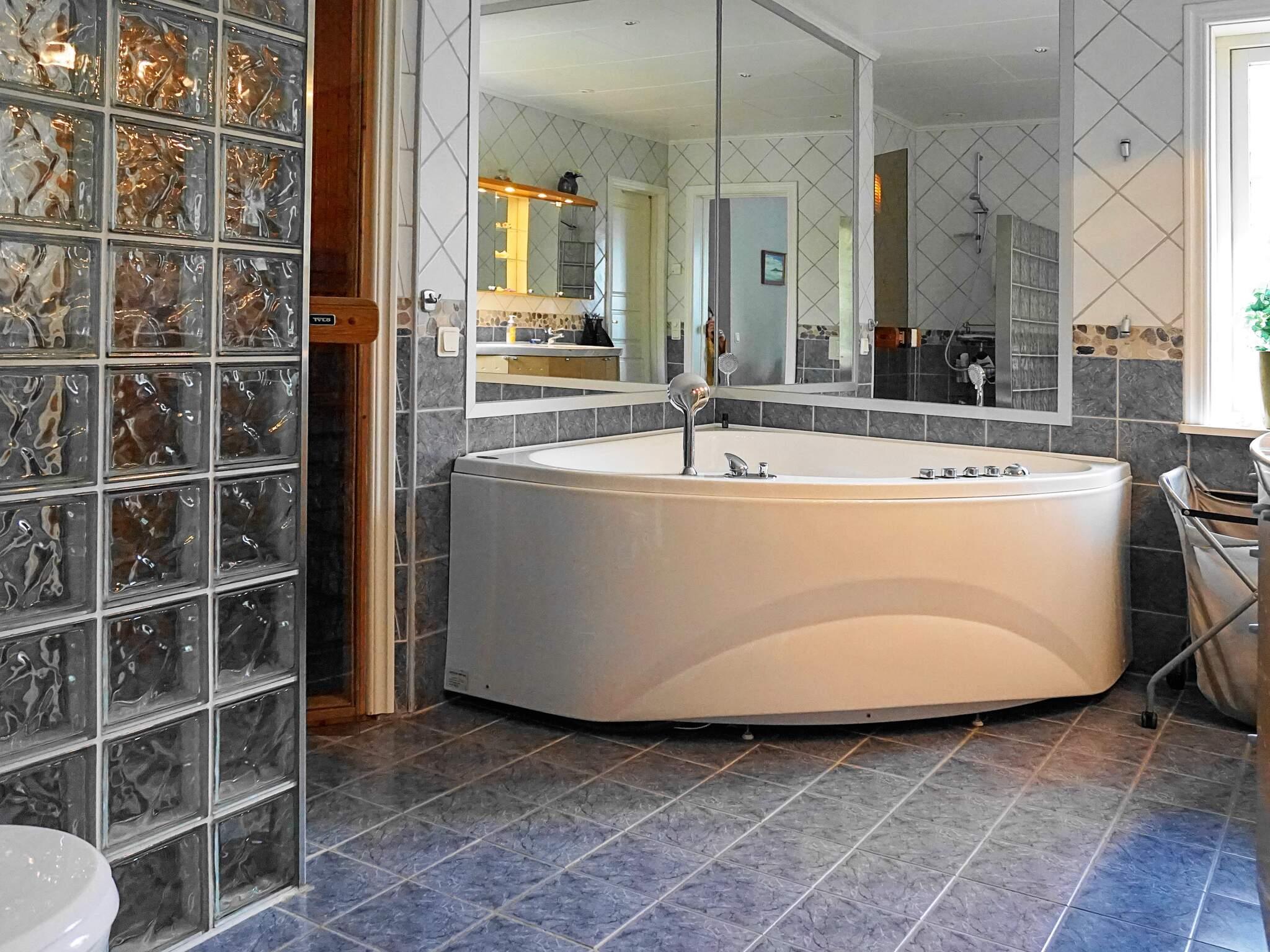 Två fina helkaklade badrum där det större har spa-avdelning med avkopplande bubbelbad samt bastu. En trappa ner (via allrum) finns tvättstuga med tvättmaskin och torkskåp.