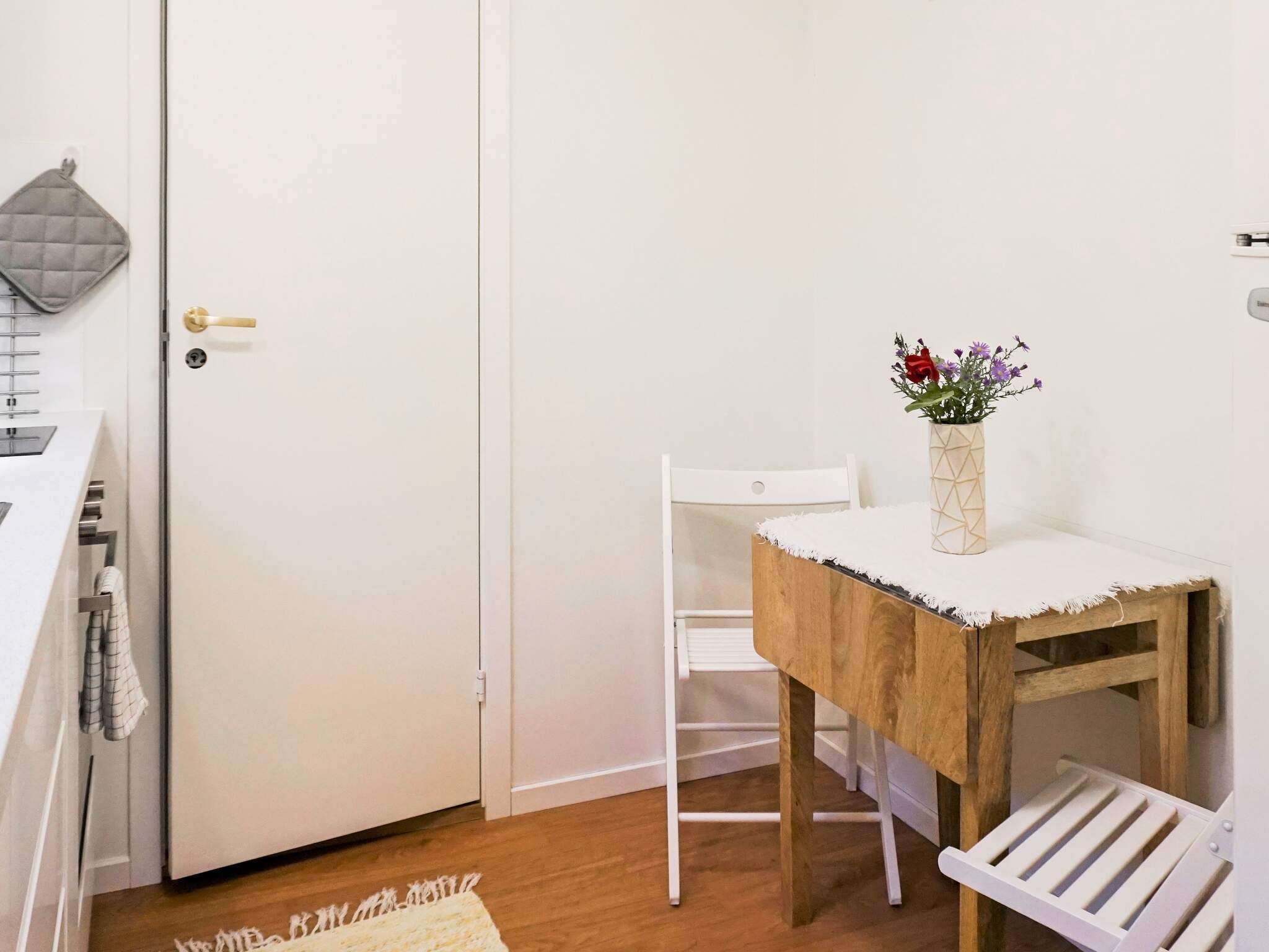 Køkken: Høj stol, el-komfur, køle-frys, mikroovn, kaffemaskine