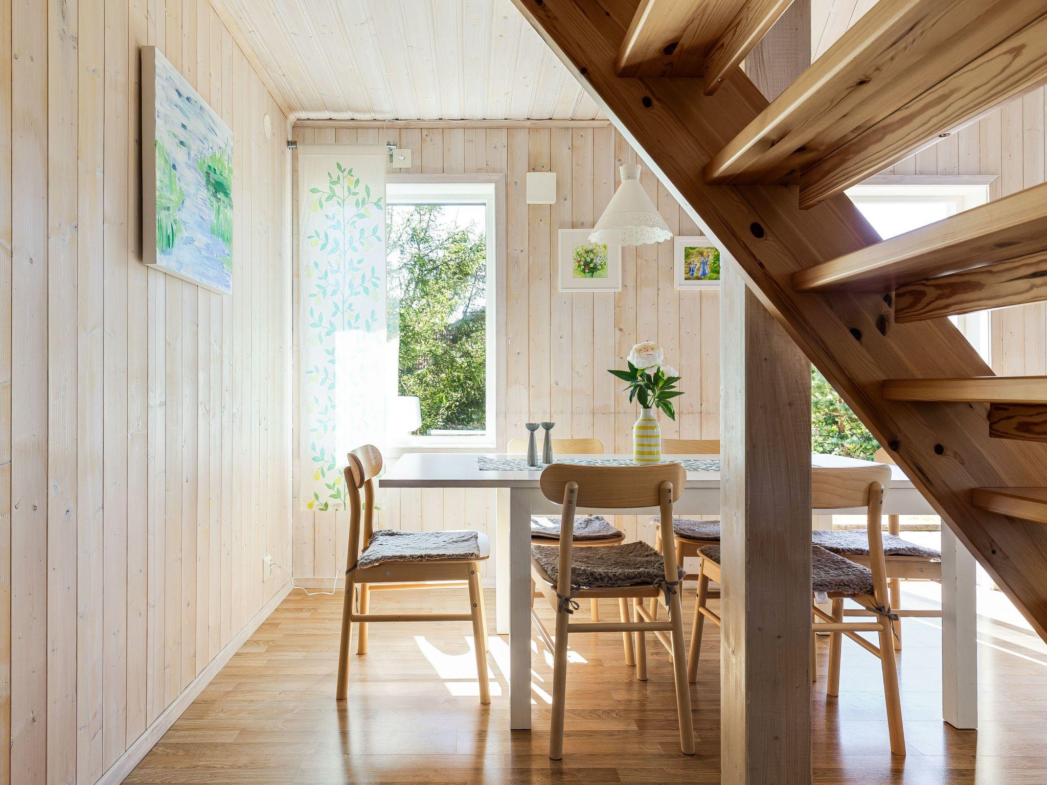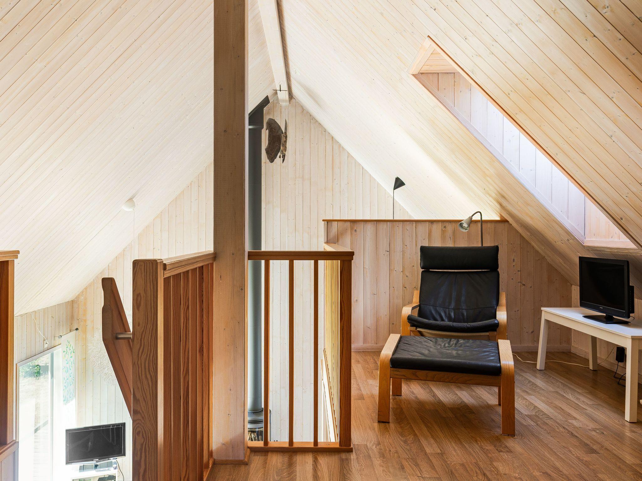 "Skogstorp", 4-room house 75 m2 on 2 levels. Modern and cosy furnishings: open living/dining room with sliding door, panoramic window with Scandinavian wood stove, dining table and DVD. Exit to the veranda. 1 room with 1 double bed. 1 room with 1 x 2 bunk beds. Open kitchen (oven, 4 ceramic glass hob hotplates, toaster, kettle, microwave, freezer, electric coffee machine). Exit to the veranda. Shower/WC. Floor heating. Upper floor: (steep stair) with sloping ceilings, 1 room with 1 double bed. Small living room with sloping ceilings with satellite TV. Parquet floors. Terrace partly roofed. Terrace furniture, barbecue. View of the lake. Facilities: washing machine, children's high chair, baby cot for up to 2 year olds. Internet (WiFi, free). Please note: non-smokers only. Smoke alarm, fire extinguisher.