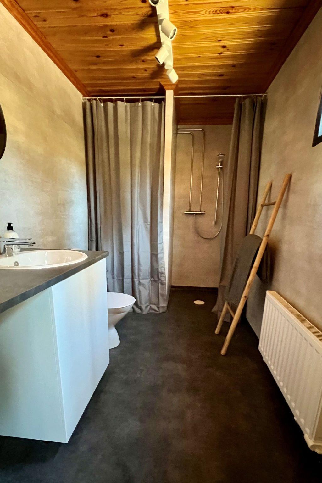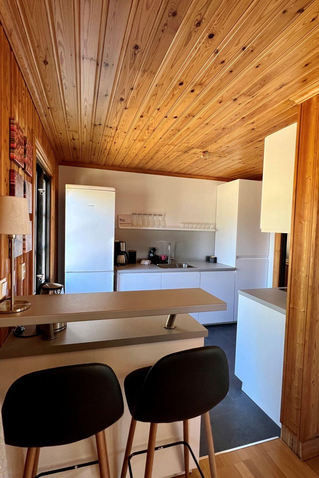 The house consists of the following rooms: An open-plan living, dining and kitchen area with fireplace, 2 bedrooms each with a double bed 180 x 200 and 160 x 200 cm and a shower room with washing machine. The fully equipped kitchen with cooker, dishwasher, extractor bonnet, stove/oven, coffee machine and equipment for self-catering is available to our guests for an additional charge.