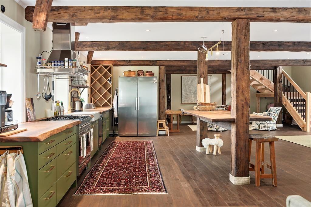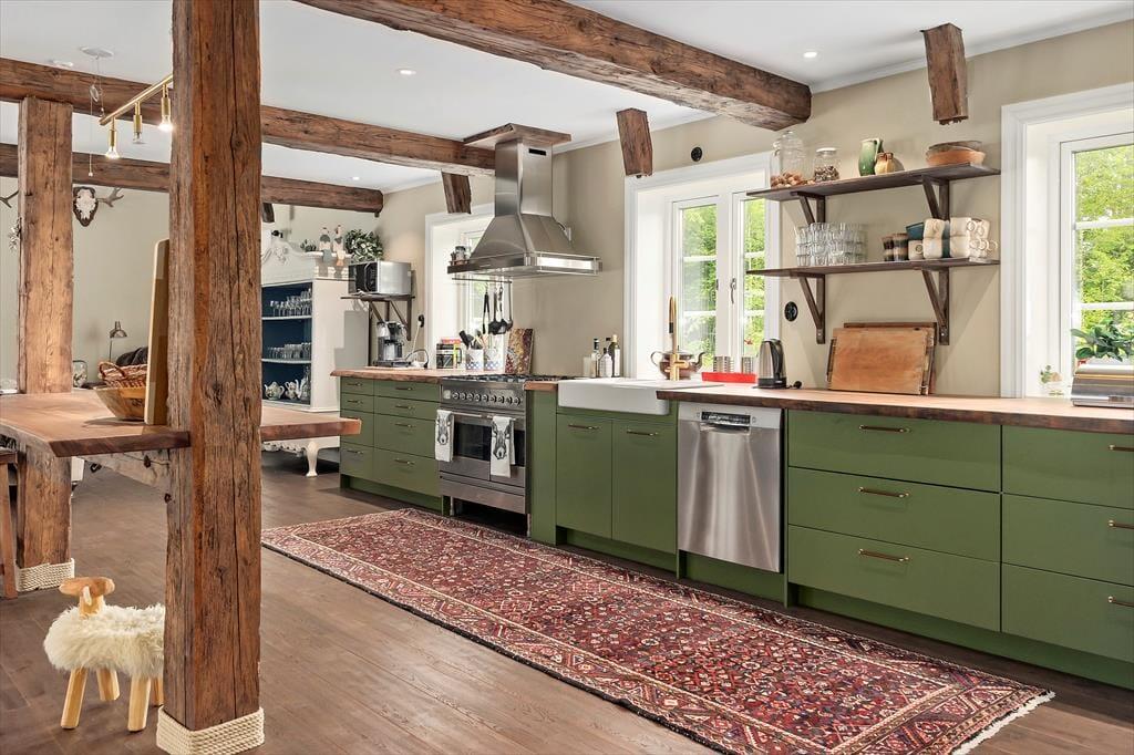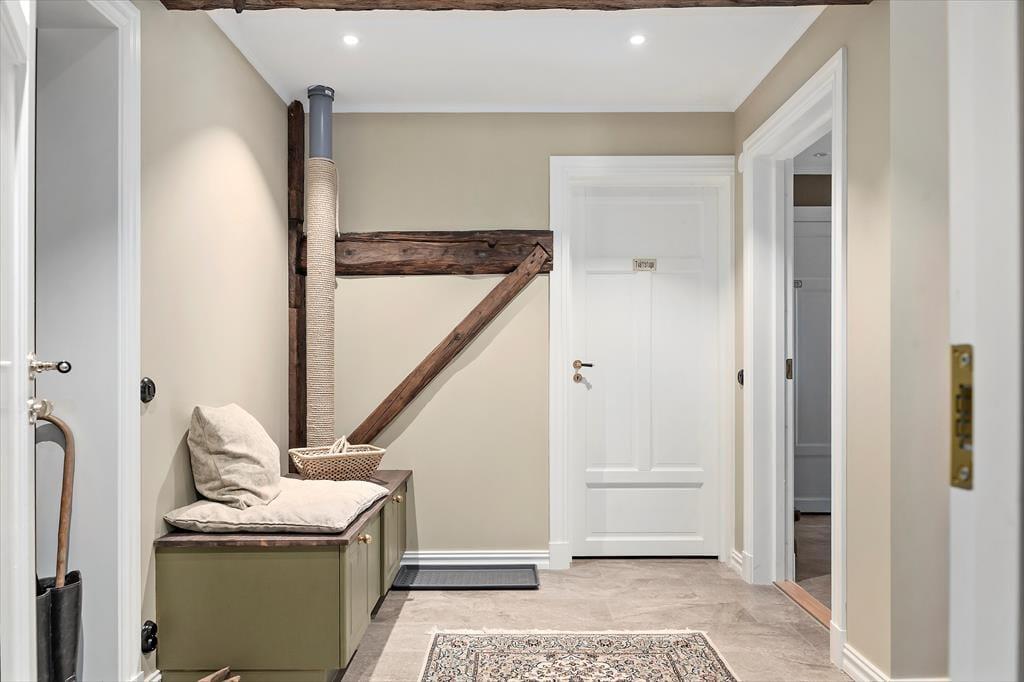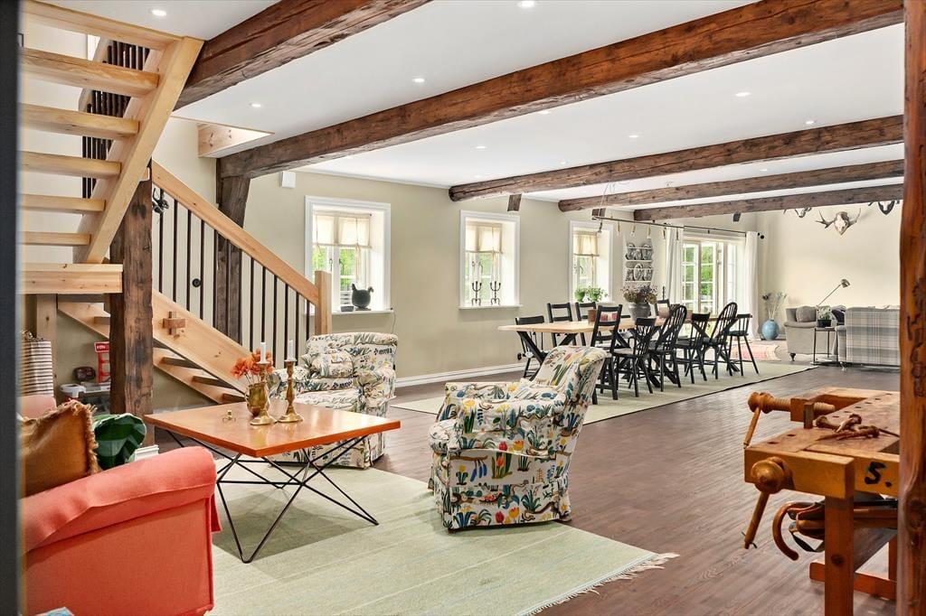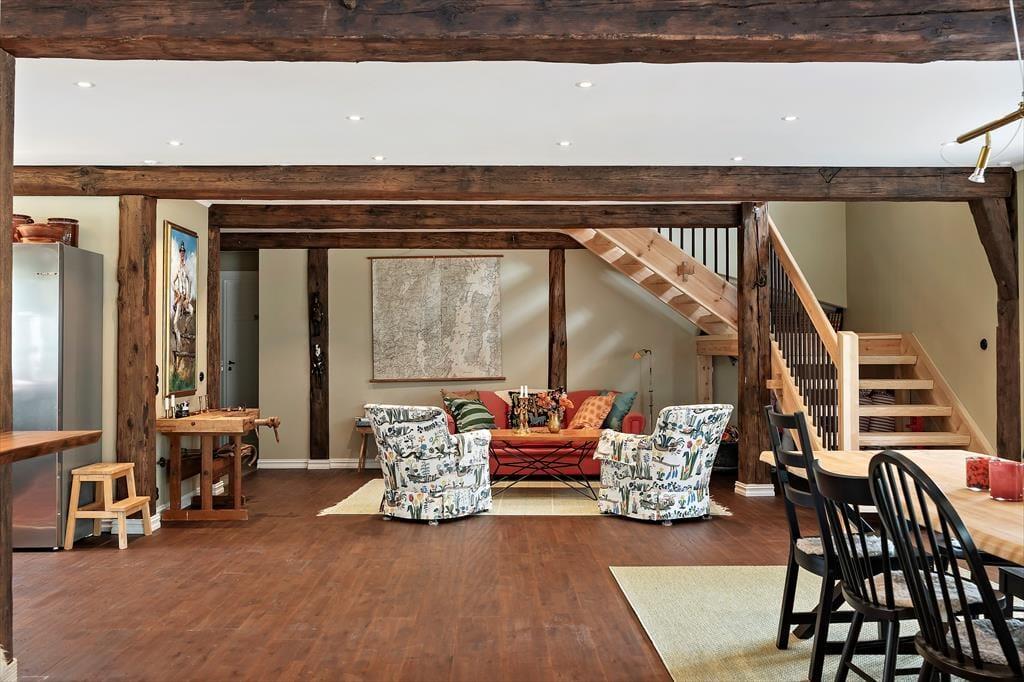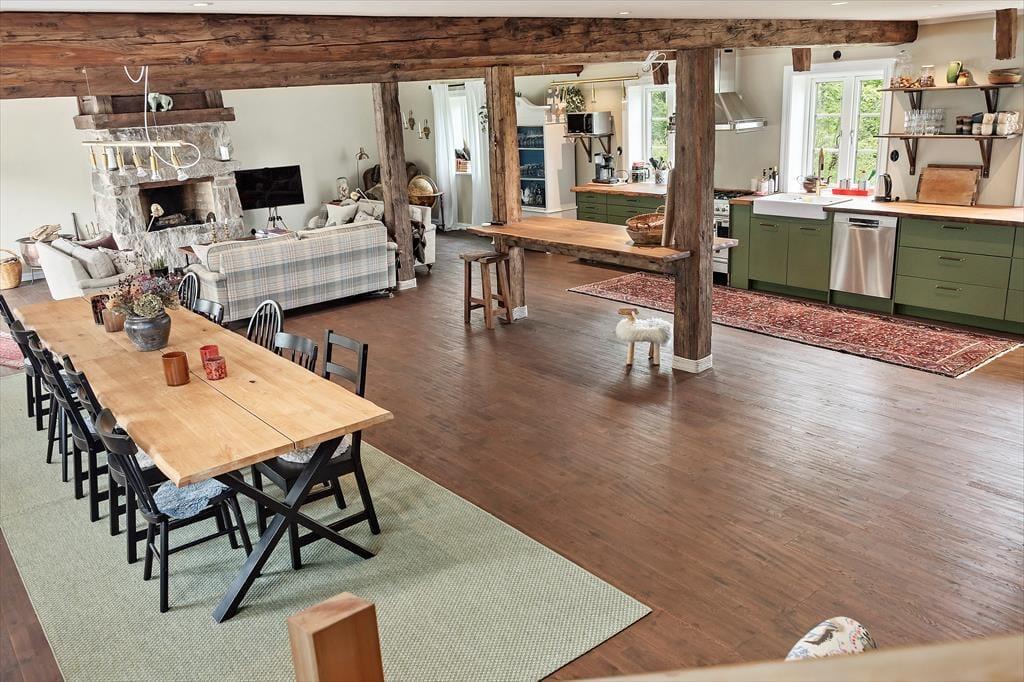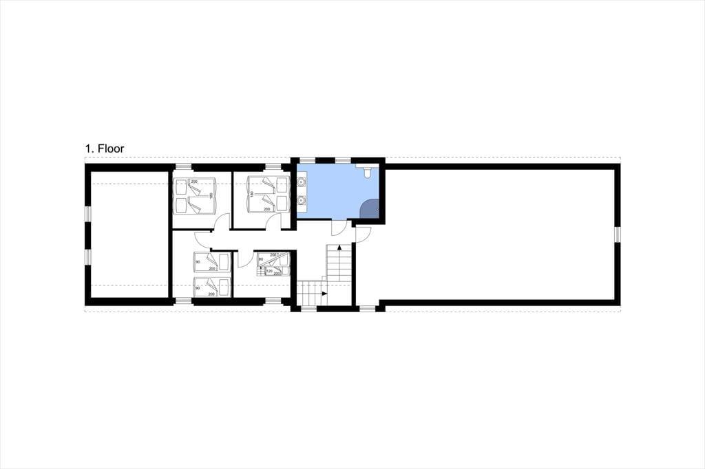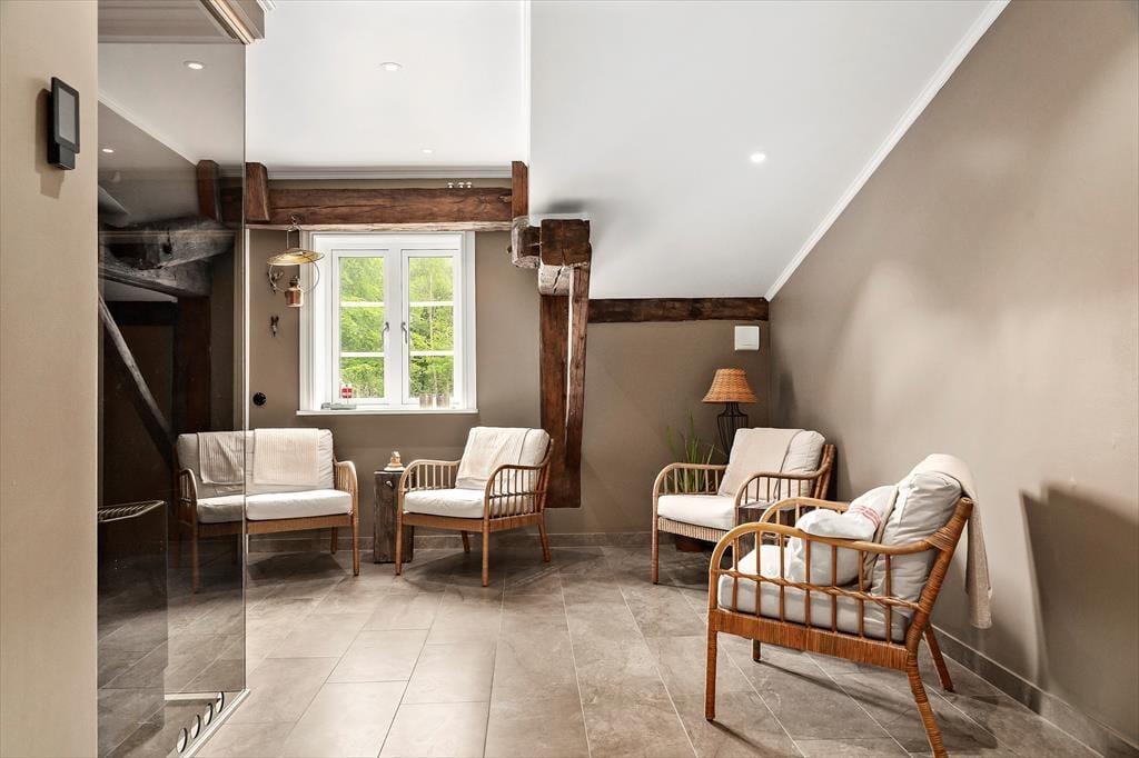 Huset, som let kan genkendes som en tidligere landbrugsbygning, har en sidelængde på ca. 35 m og en boligareal på ca. 240 m² i den udbyggede del, der er tilgængelig for gæsterne. Indgangsdøren på bagsiden af huset fører til højre gennem en lille gang direkte ind i en stor opholdsstue med stilfuld indretning, hvor der er integreret et moderne køkken og en stor spiseplads. To siddegrupper, den ene ved indgangen under den åbne trappe til øverste etage, den anden omkring den stenmurede åbne pejs og fladskærms-tv'et, er oaser af velvære og præger det store rum. I indgangsområdet er der også et gæstetoilet med håndvask; til venstre er der bryggers og et saunaområde med afslapningsmuligheder og bruser. Det moderne køkken, der ligger på langsiden, er udstyret med et stort amerikansk køle-/fryseskab, har et gaskomfur samt opvaskemaskine og kaffemaskine. På øverste etage af huset er der ud over et stort badeværelse med brusebad, toilet og håndvask fire soveværelser, hvoraf to er udstyret med dobbeltsenge, det tredje med to enkeltsenge og det fjerde med en køjeseng, hvor den nederste seng er bredere. Ud over den hyggelige varme fra den åbne pejs har huset en jordvarmepumpe, der sikrer et behageligt indeklima året rundt. Gæsterne har desuden adgang til moderne havemøbler og en grill; en robåd kan benyttes efter aftale med gæsterne i nabohuset Yås.